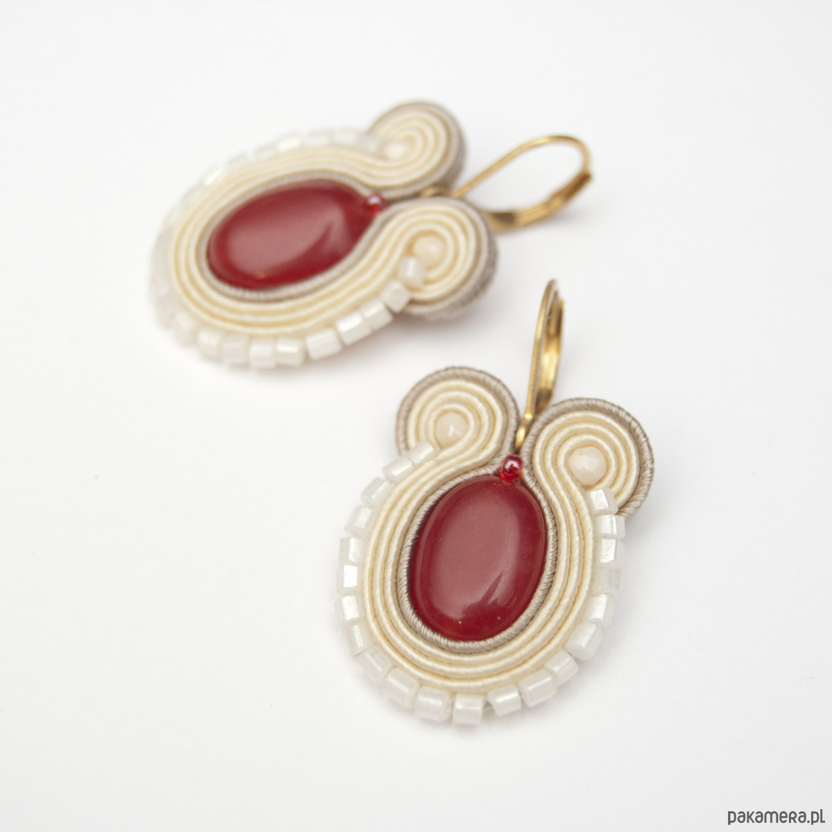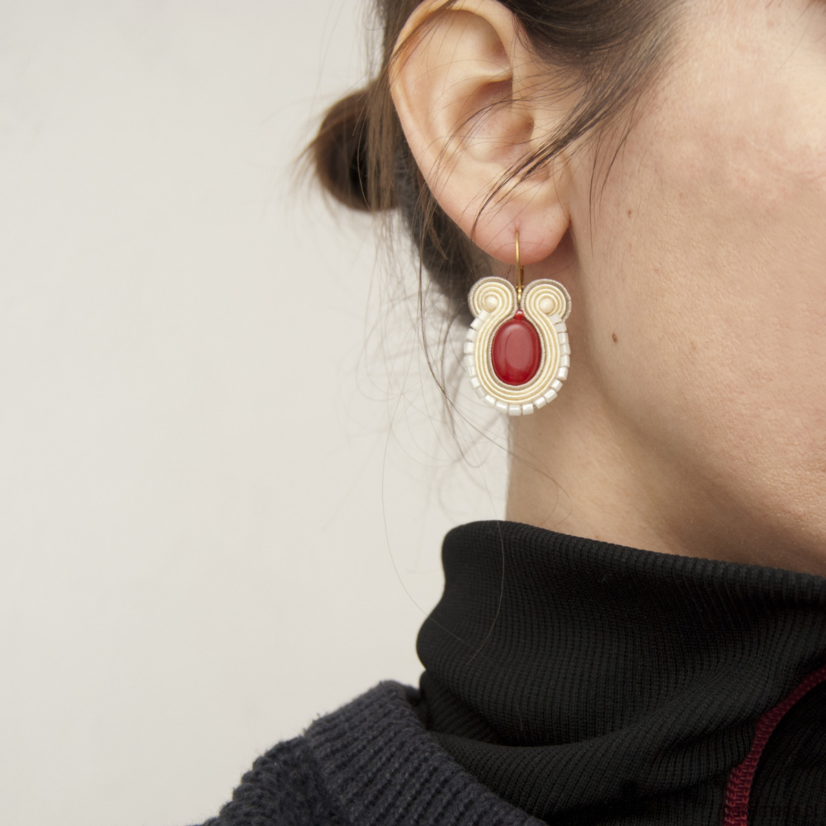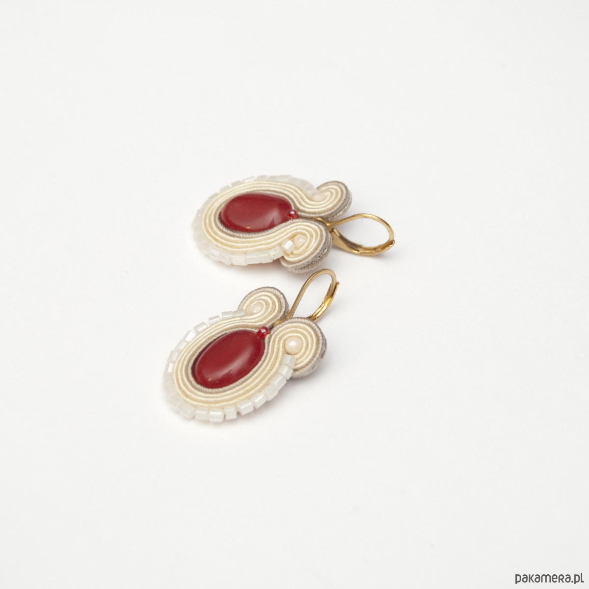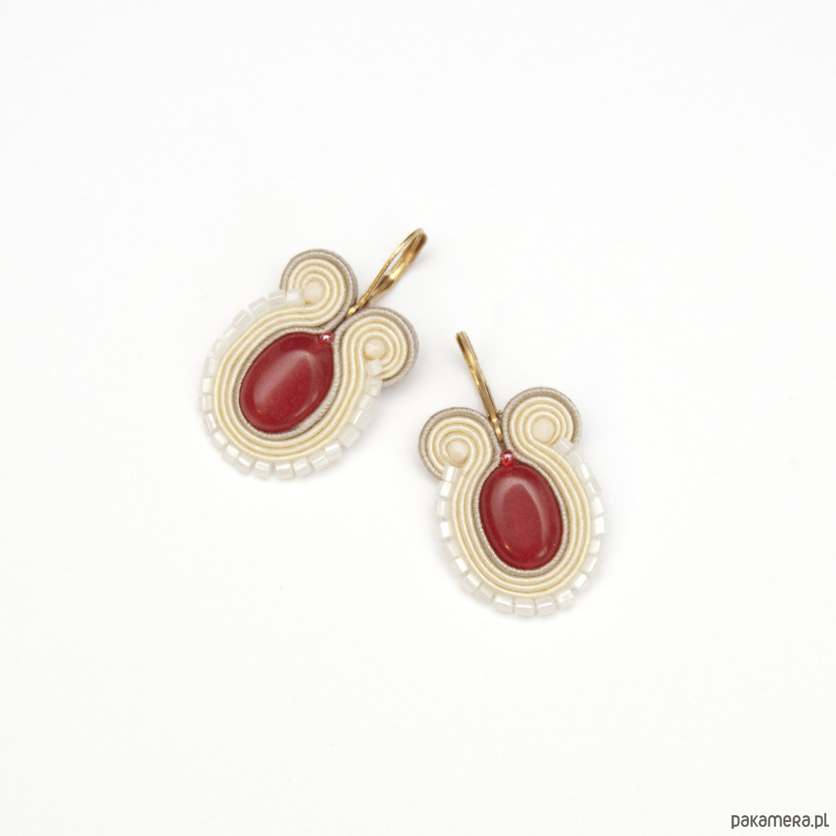 "Małe kolczyki sutasz - czerwony, kremowy" wykonane są techniką haftu sutasz. Zrobione z kamieni półszlachetnych (jadiet), sznurków sutasz i bigli ze stali chirurgicznej (antyalergiczna). Tył kolczyków stanowi skóra naturalna. Długość kolczyka to około 4 cm, szerokość w najszerszym miejscu wynosi około 2,5 cm. Kolczyki są lekkie.