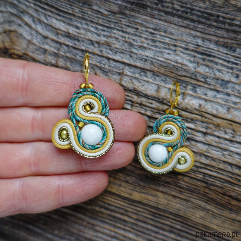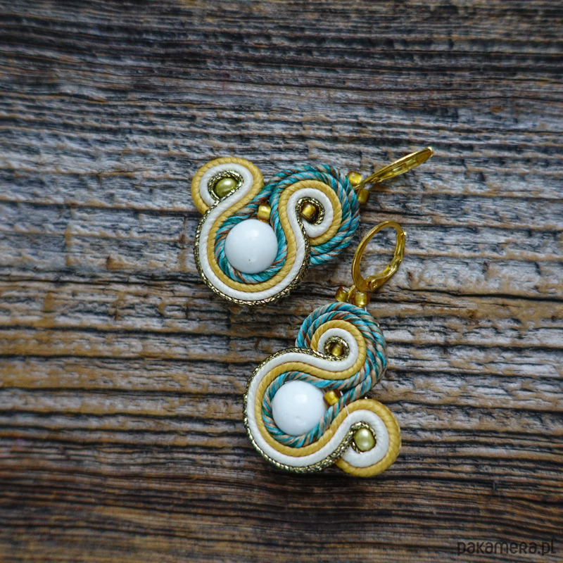Materiały: sznurki soutache, biały koral, koraliki preciosa, bigle antyalergiczne w kolorze złotym;