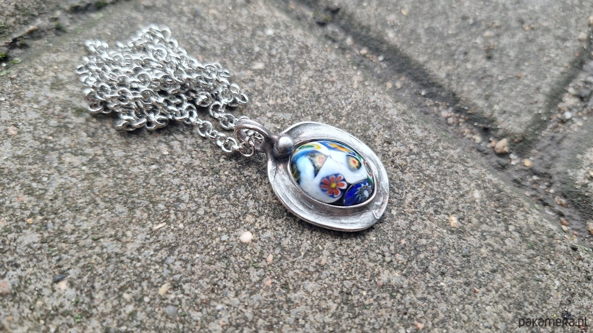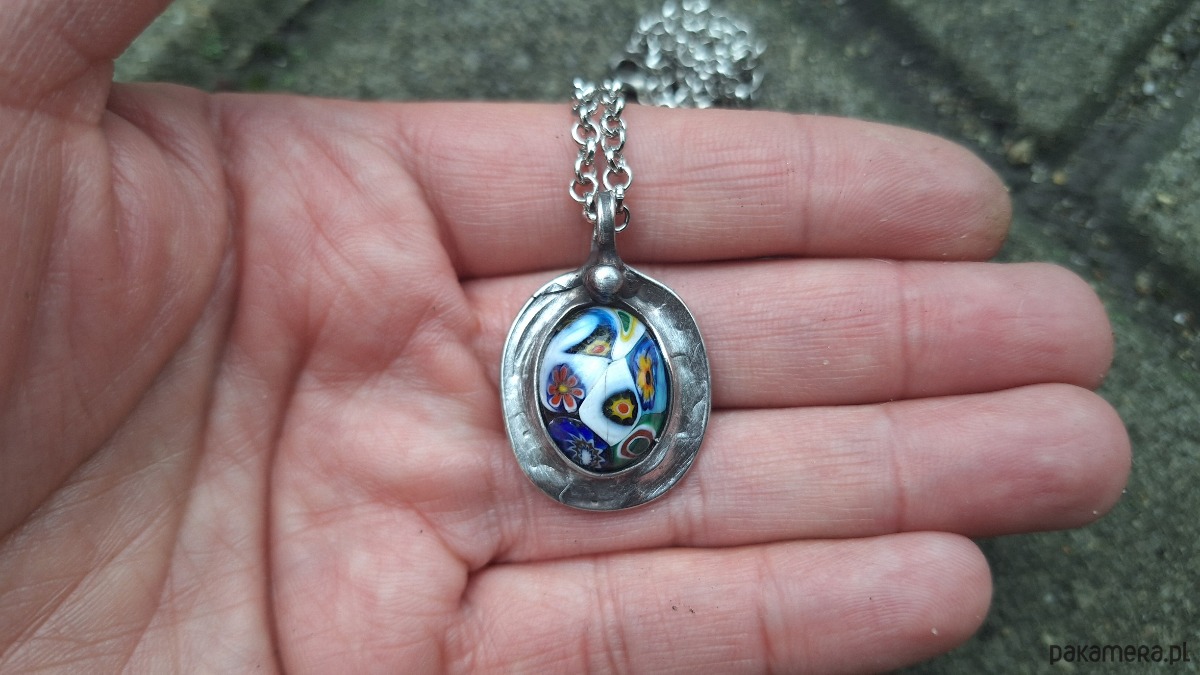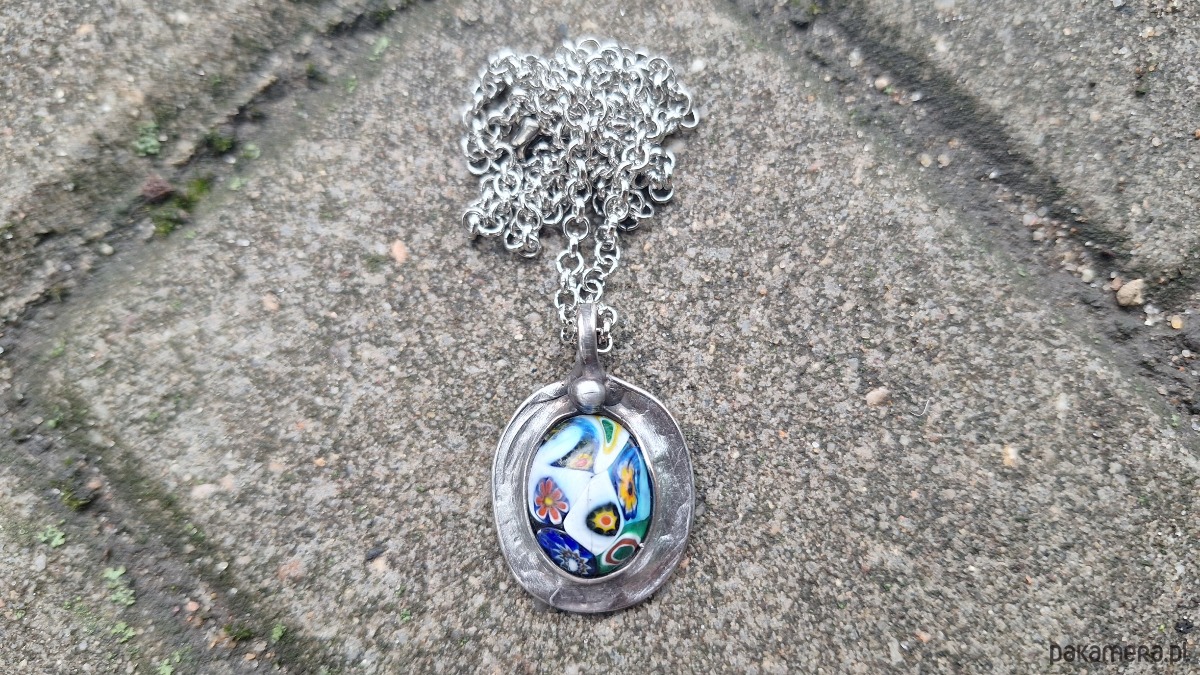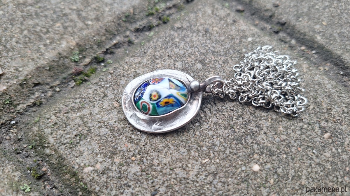 Wisiorek wykonany z miedzi, cyny i oryginalnego szkła vintage millefiori z Włoch. Wymiary ok. 2.5 na 2 cm. Zawieszony na łańcuszku o długości ok. 50 cm.