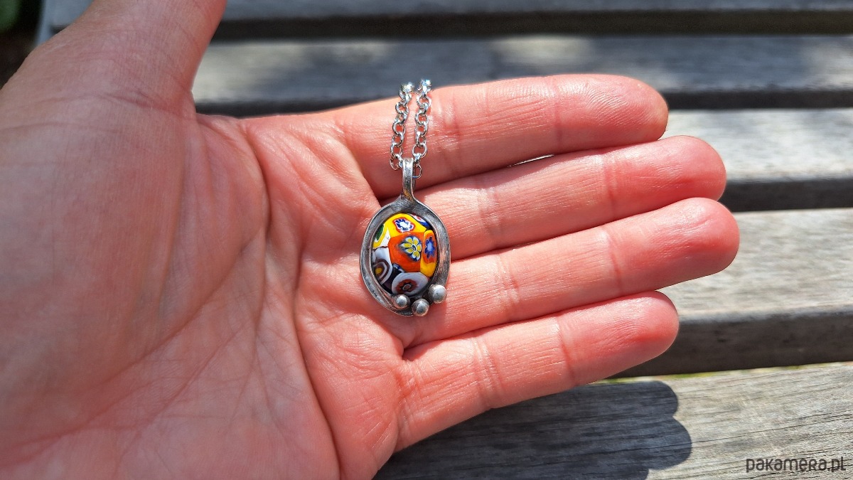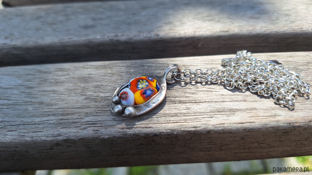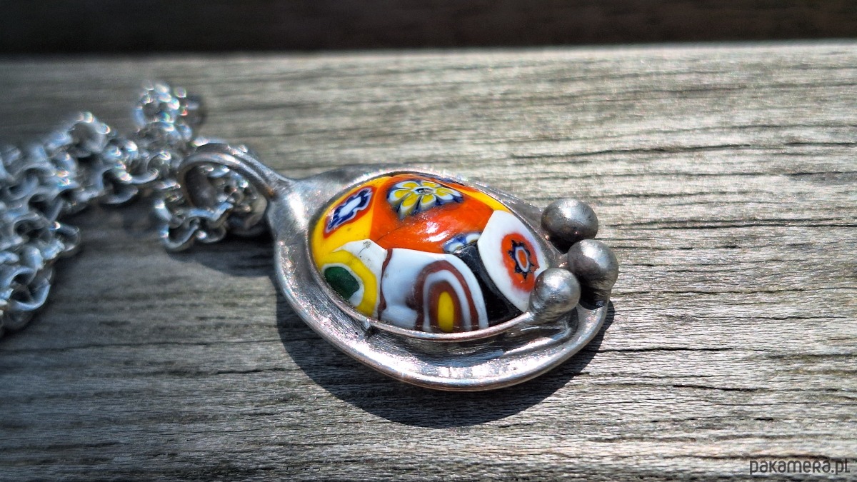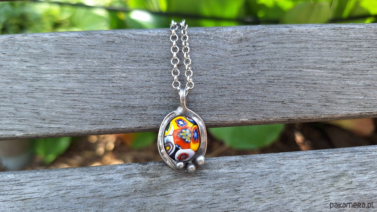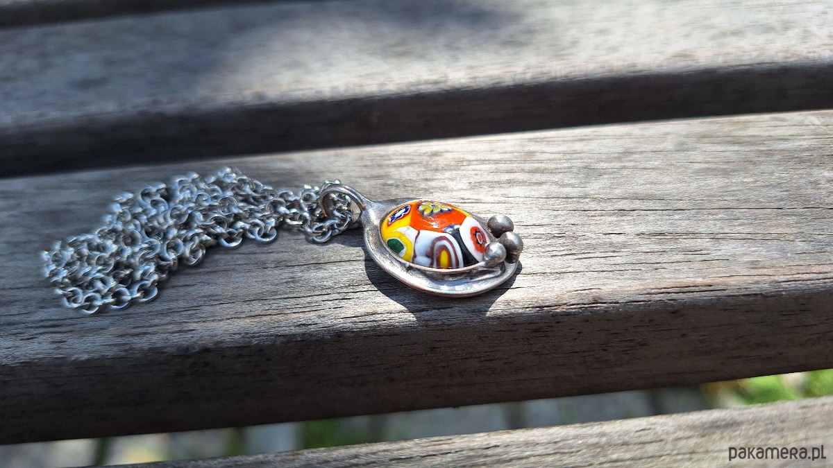 Wisiorek wykonany z miedzi, cyny i oryginalnego szkła vintage millefiori z Włoch. Wymiary ok. 2.5 na 2 cm. Zawieszony na łańcuszku o długości ok. 50 cm.