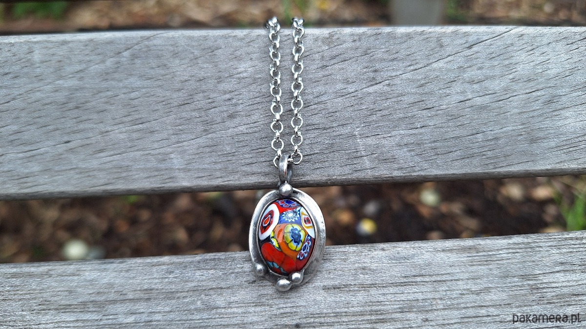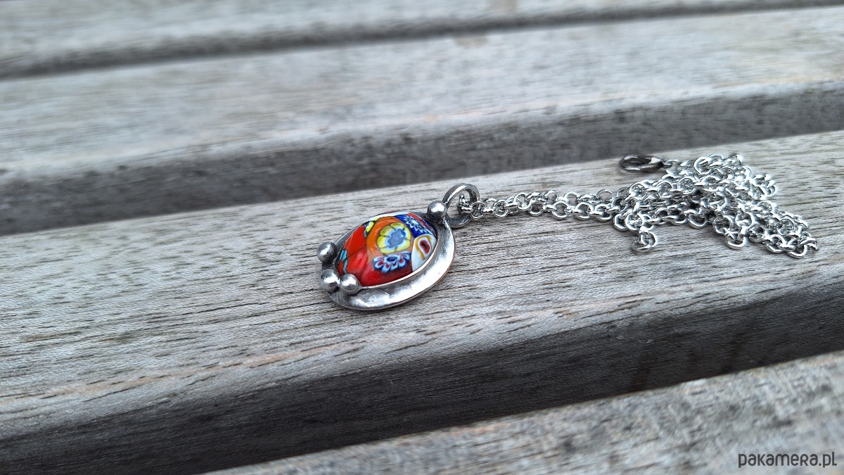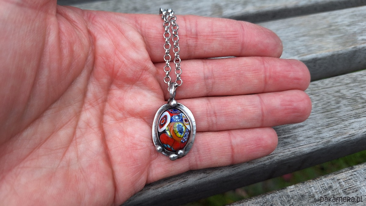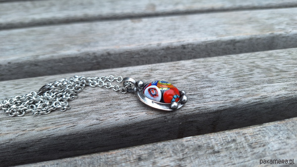 Wisiorek wykonany z miedzi, cyny i oryginalnego szkła vintage millefiori z Włoch. Wymiary ok. 2.2 na 1.7 cm. Zawieszony na łańcuszku o długości ok. 50 cm.