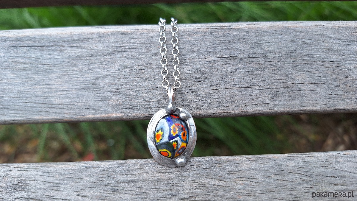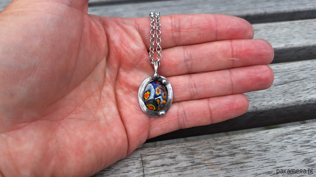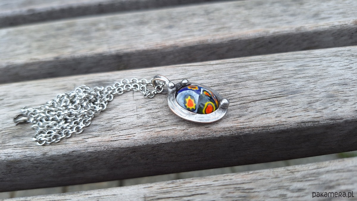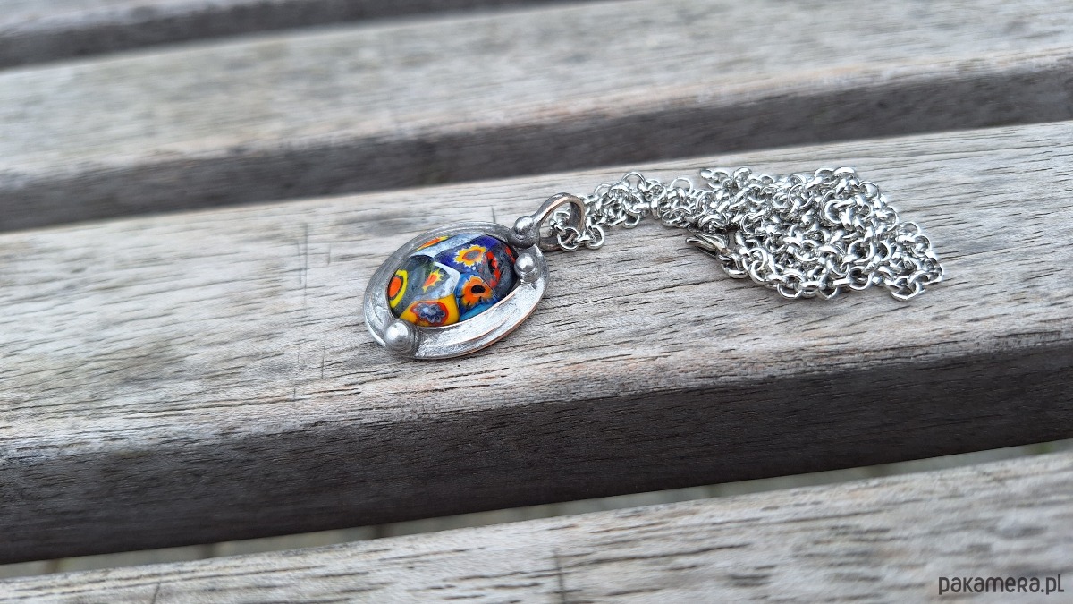 Wisiorek wykonany z miedzi, cyny i oryginalnego szkła vintage millefiori z Włoch. Wymiary ok. 2.3 na 1.7 cm. Zawieszony na łańcuszku o długości ok. 50 cm.