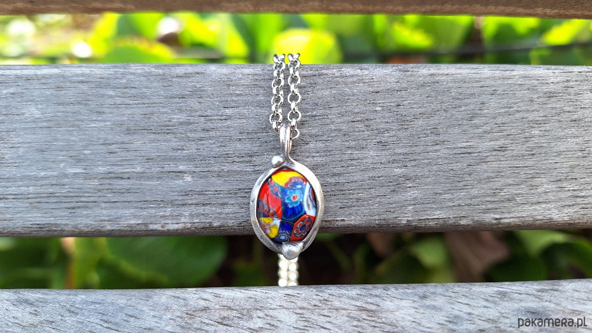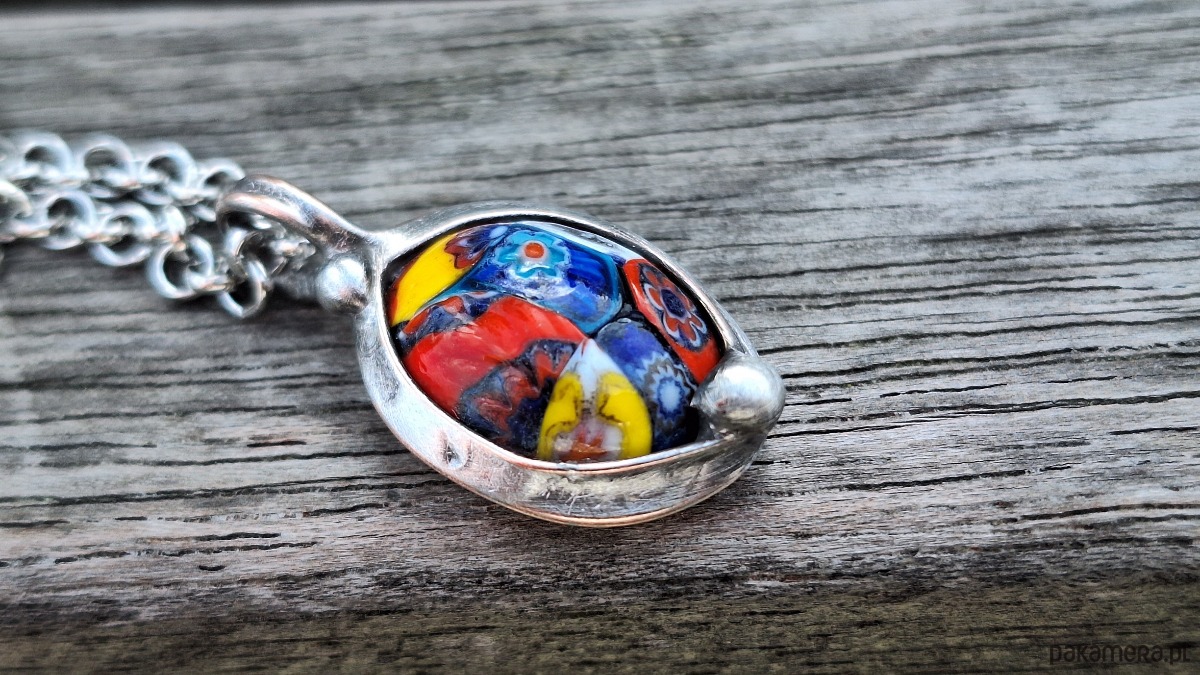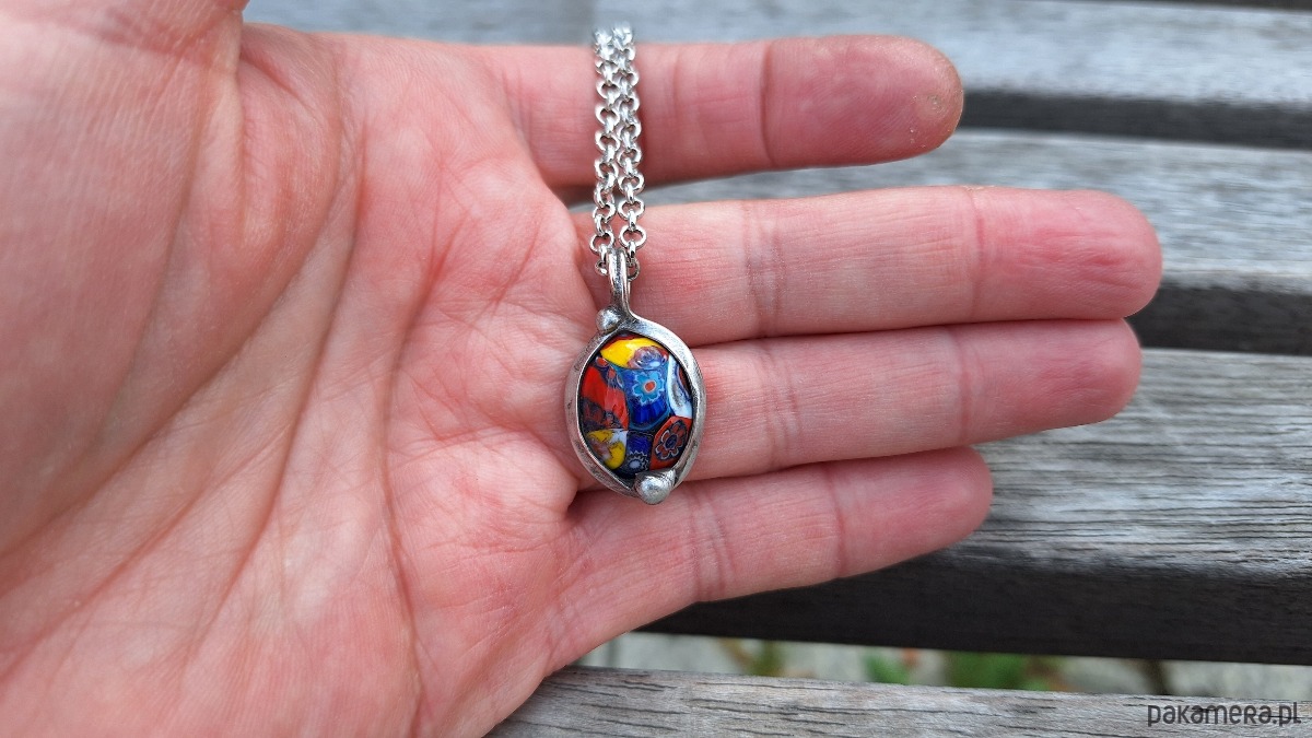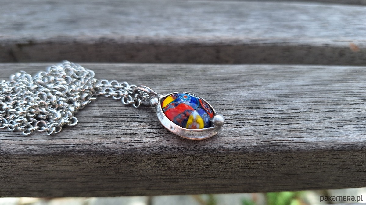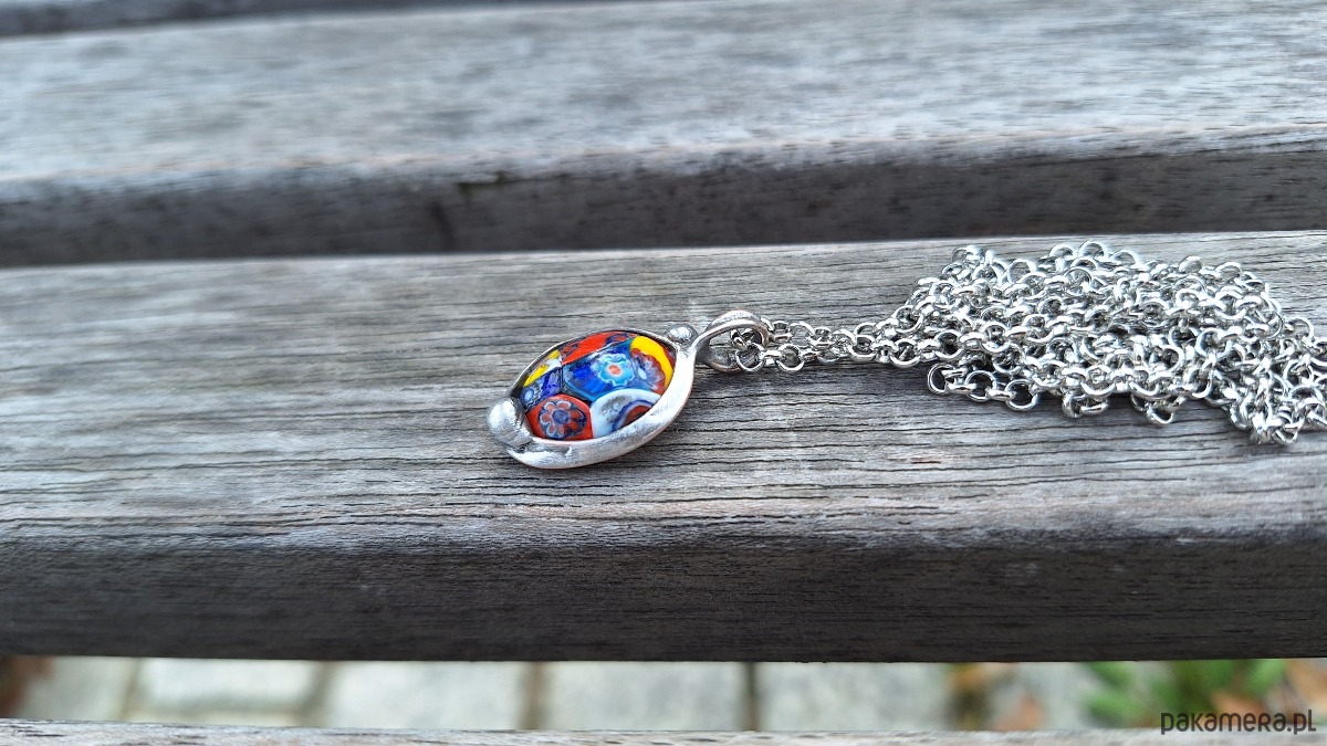Wisiorek wykonany z miedzi, cyny i oryginalnego szkła vintage millefiori z Włoch. Wymiary ok. 2 na 1.5 cm. Zawieszony na łańcuszku o długości ok. 50 cm.
