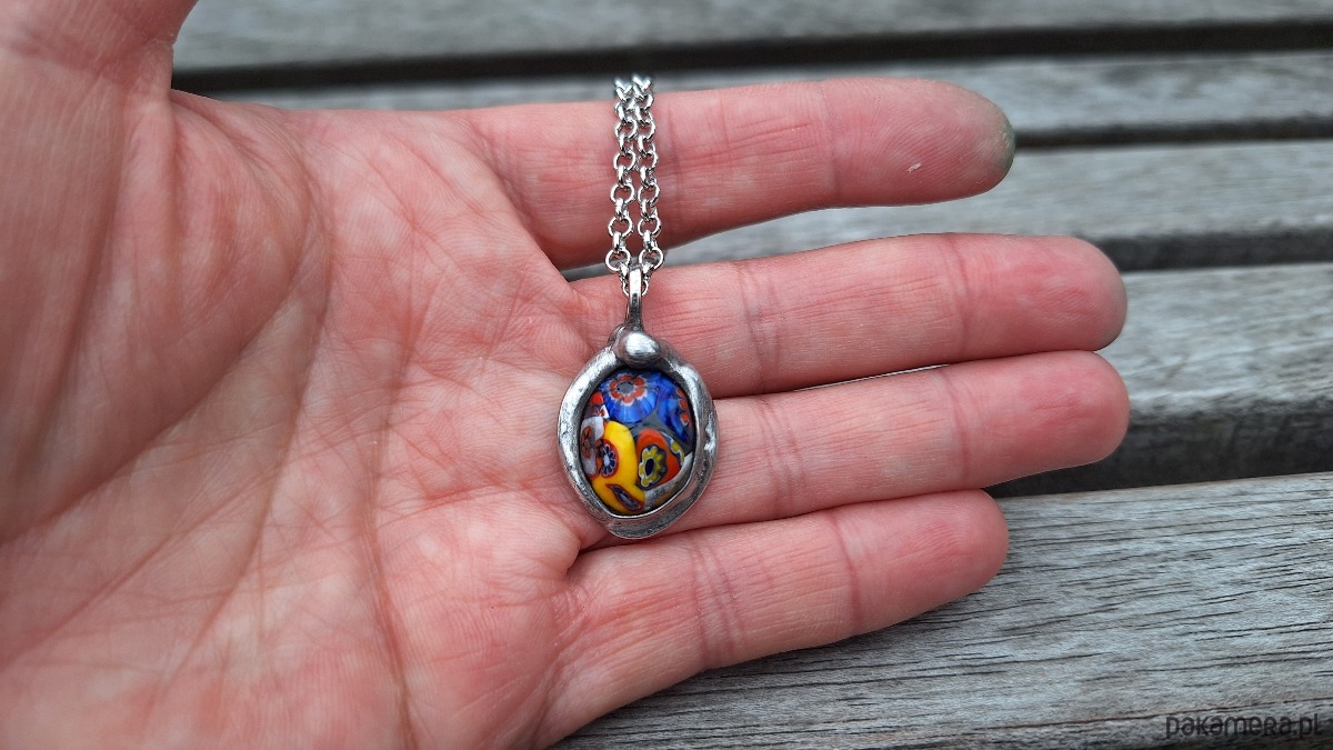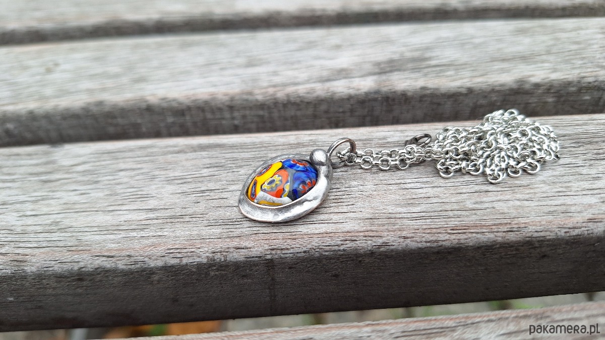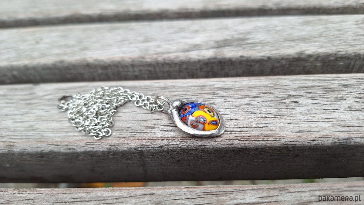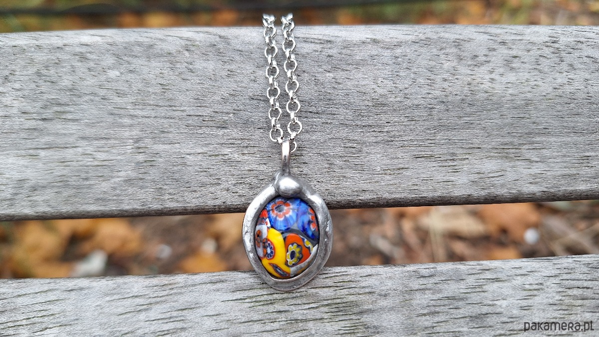 Wisiorek wykonany z miedzi, cyny i oryginalnego szkła vintage millefiori z Włoch. Wymiary ok. 2.3 na 1.7 cm. Zawieszony na łańcuszku o długości ok. 50 cm.