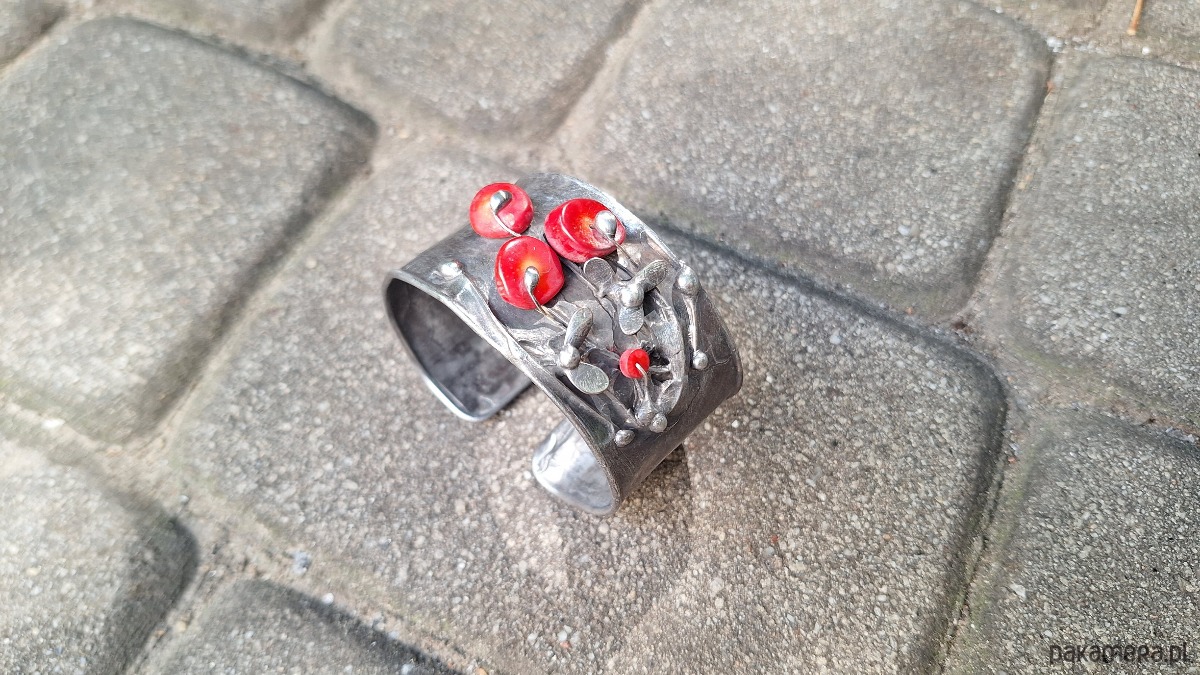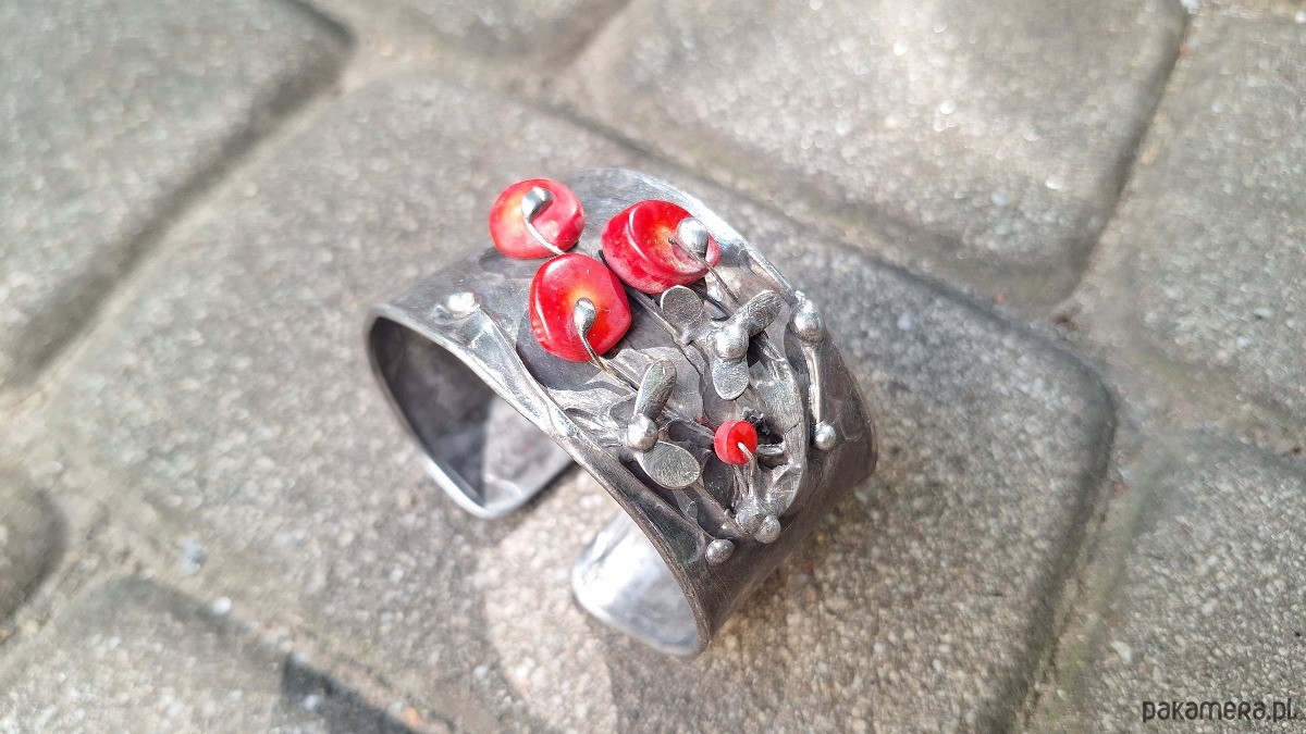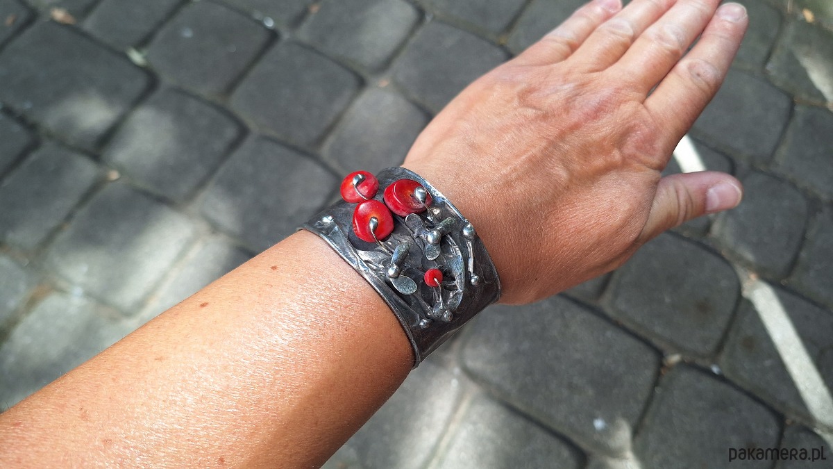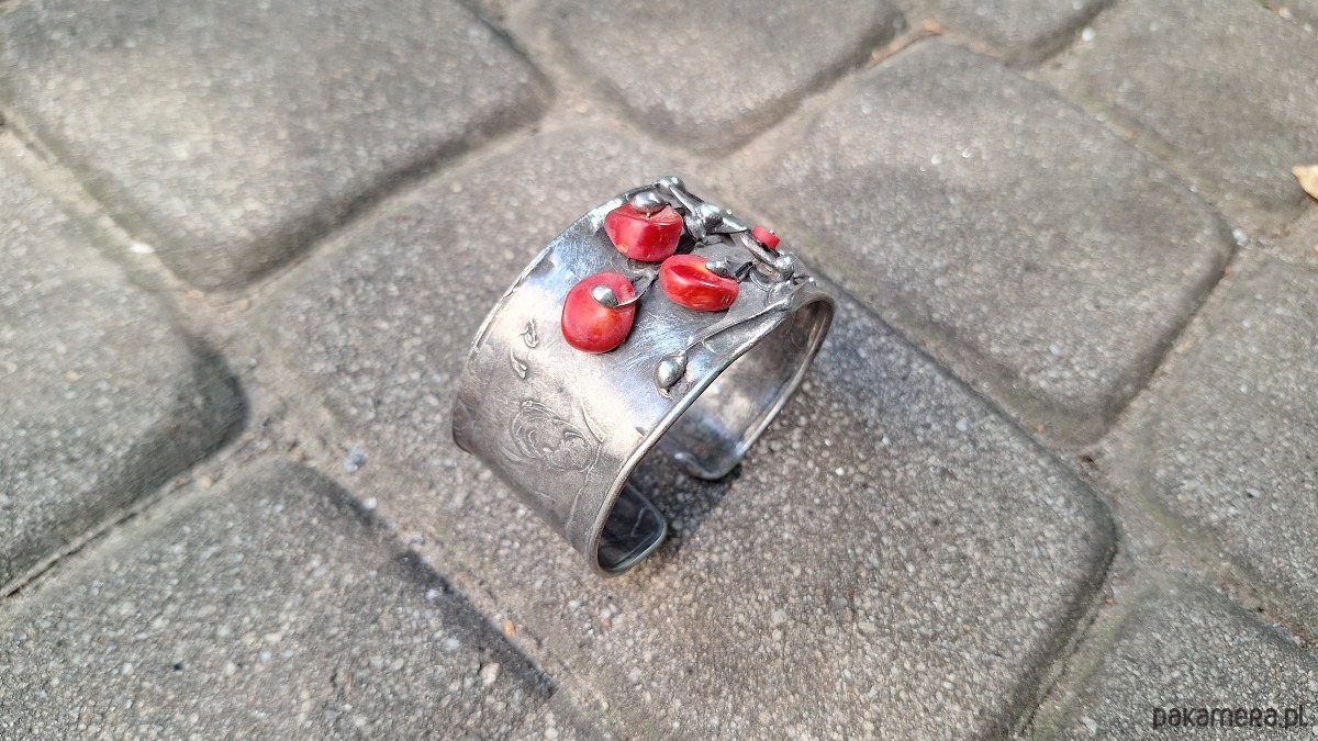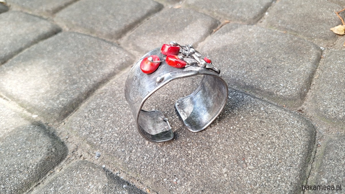 Bransoletka wykonana z miedzi, cyny i koralowców. Szerokość 3.5 cm. Regulowana.