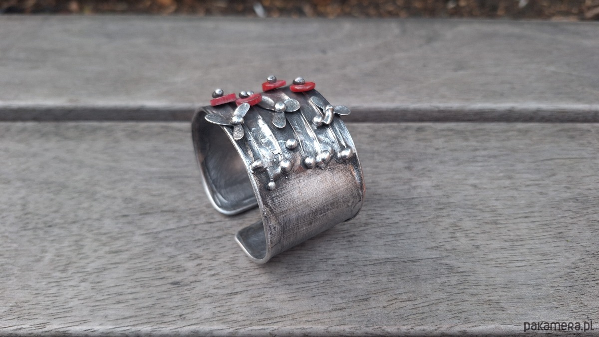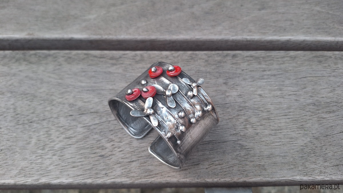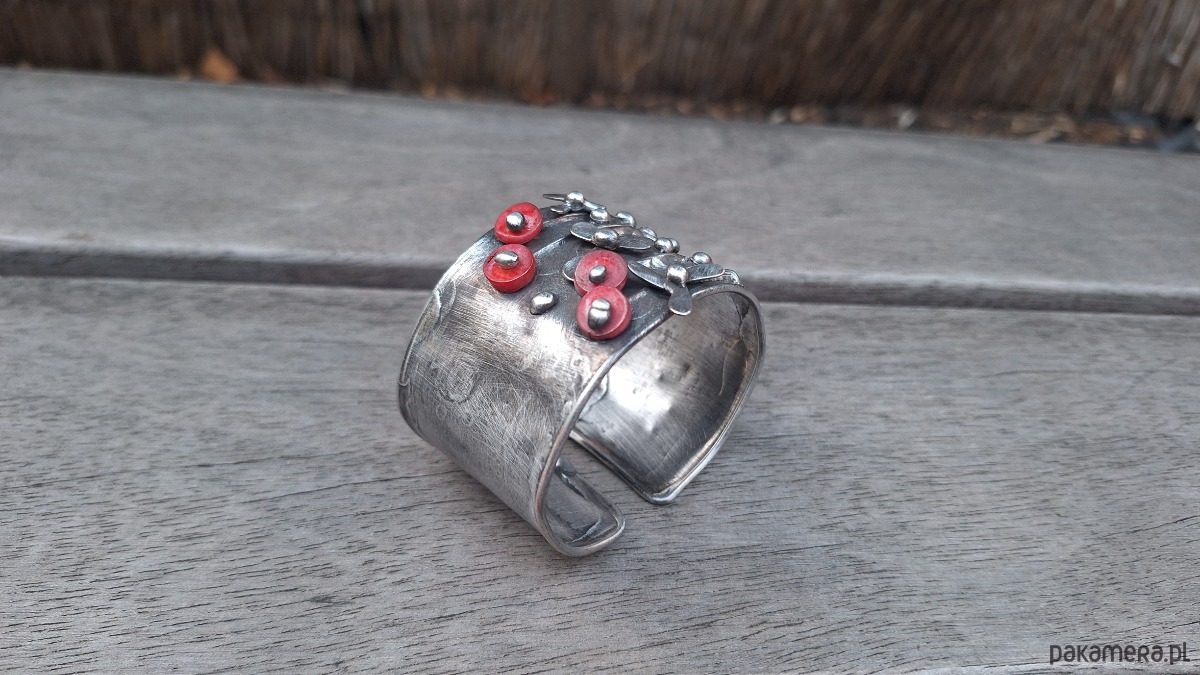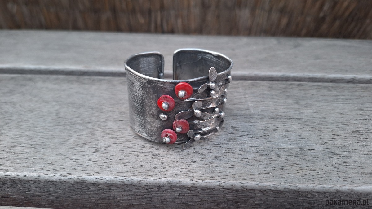 Bransoletka wykonana z miedzi, cyny i koralowców. Szerokość 4 cm. Regulowana.