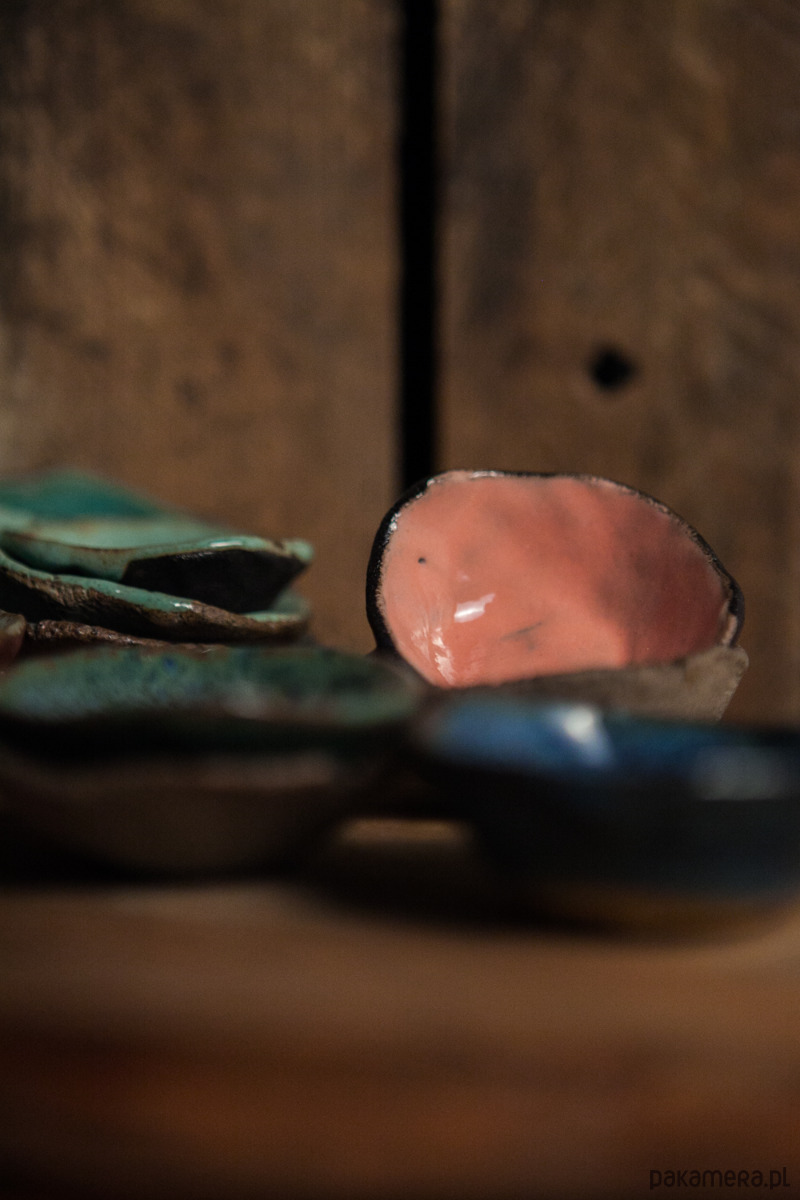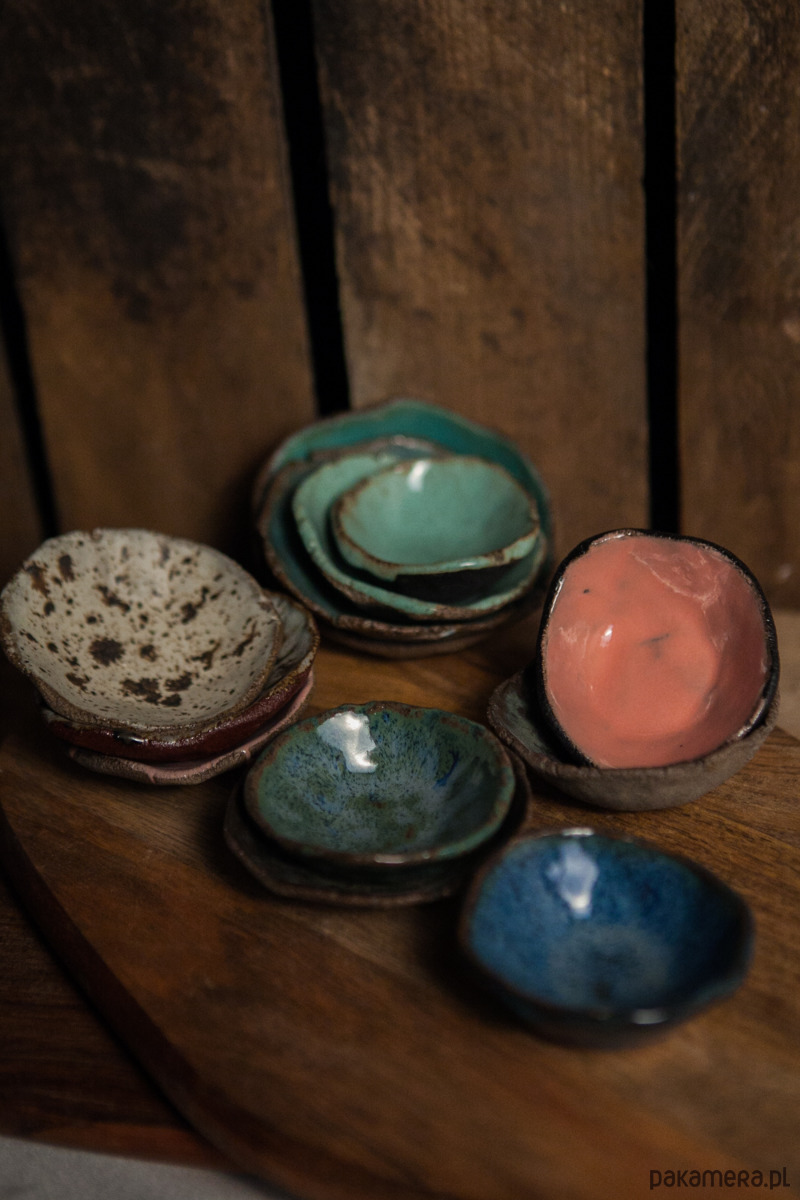 Małe miseczki na sosy sojowe, dipy i przeróżnego rodzaju tapasy. Lepione ręcznie, z różnych rodzajów gliny (czarna, jasna, ceglasta), szkliwione różnymi kolorami. Wymiary od 4 do 6 cm.