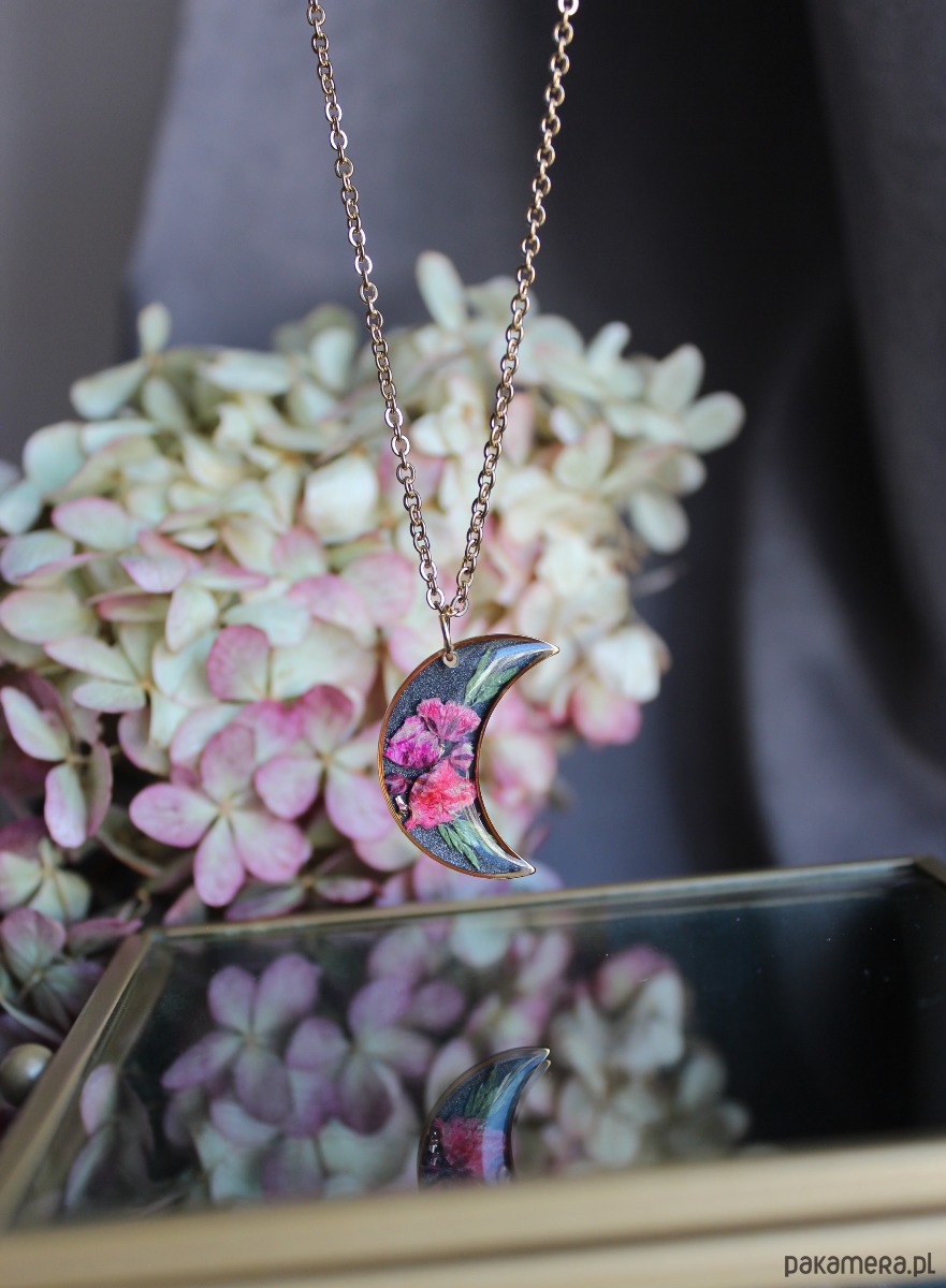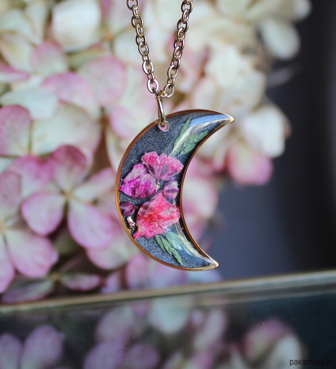 Oferuję Państwu unikalną biżuterię. Zawieszka jest wykonana z suszonych kwiatów i żywicy epoksydowej. Biżuteria jest wspaniałym i oryginalnym prezentem na lata.