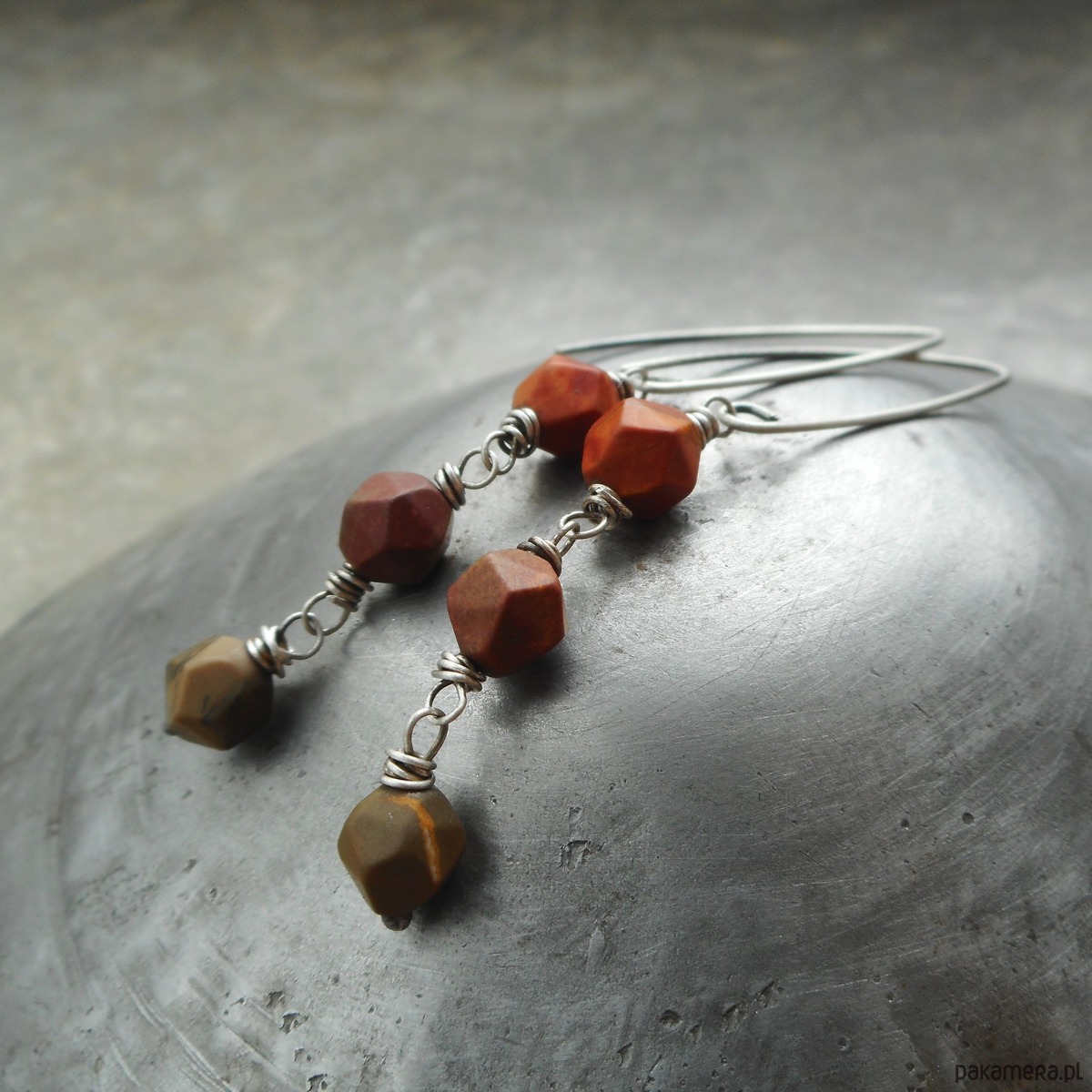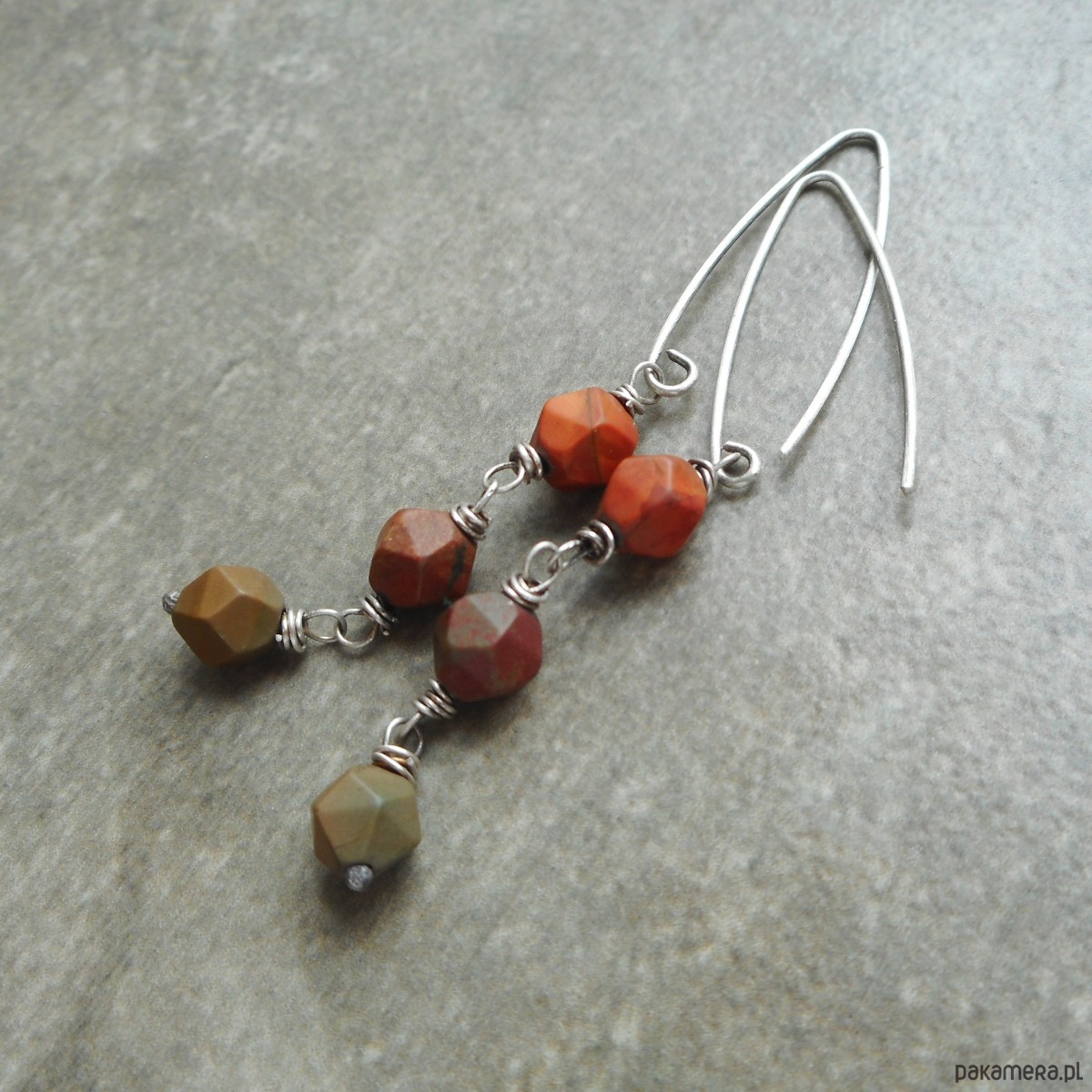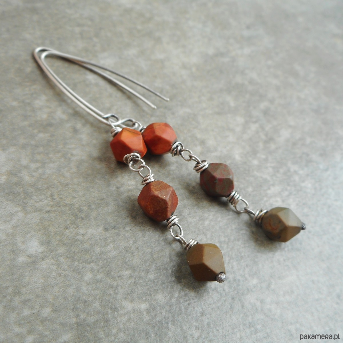 Kolczyki z kamieni naturalnych i szlachetnego srebra; proste w formie, nie obciążające ucha, z kamieniami w kolorach ziemi.