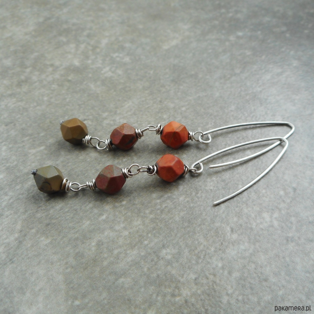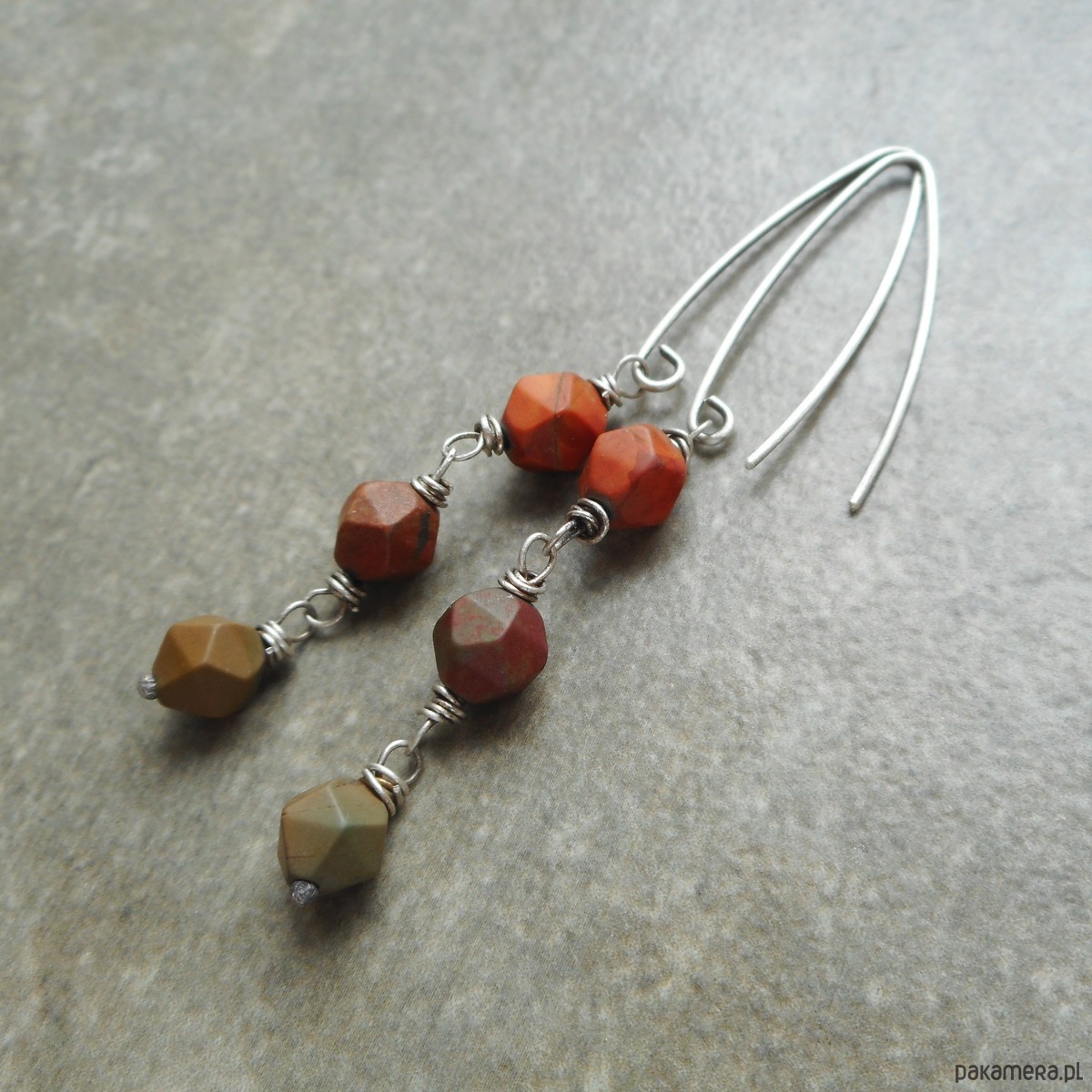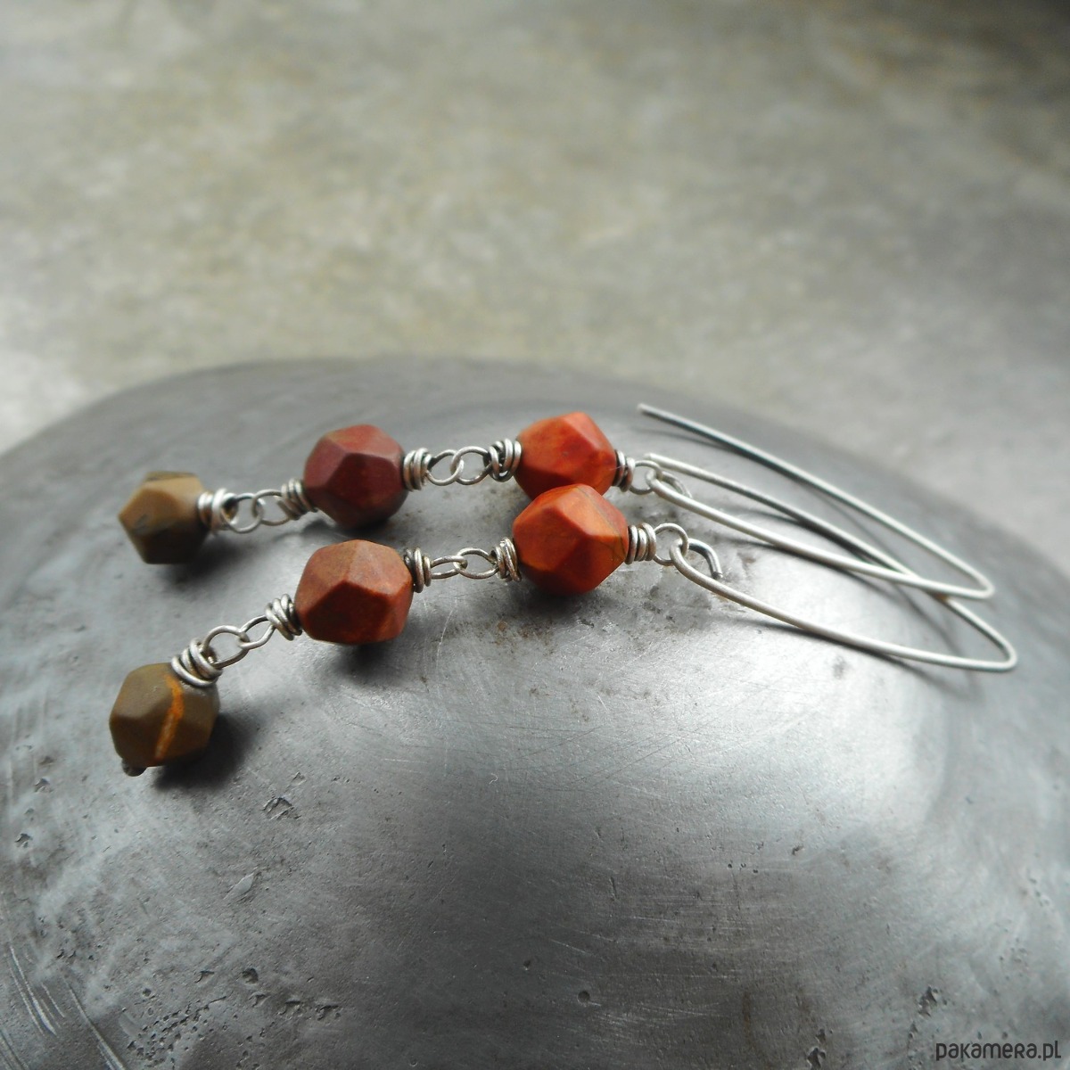 Kolczyki z kamieni naturalnych i szlachetnego srebra; proste w formie, nie obciążające ucha, z kamieniami w kolorach ziemi.
