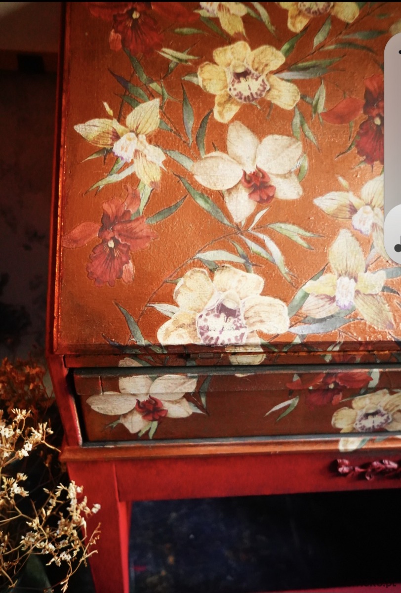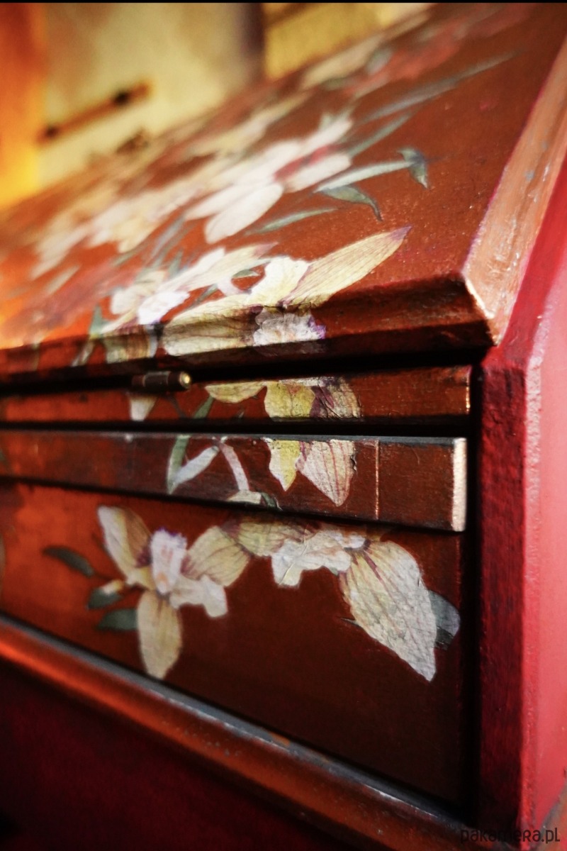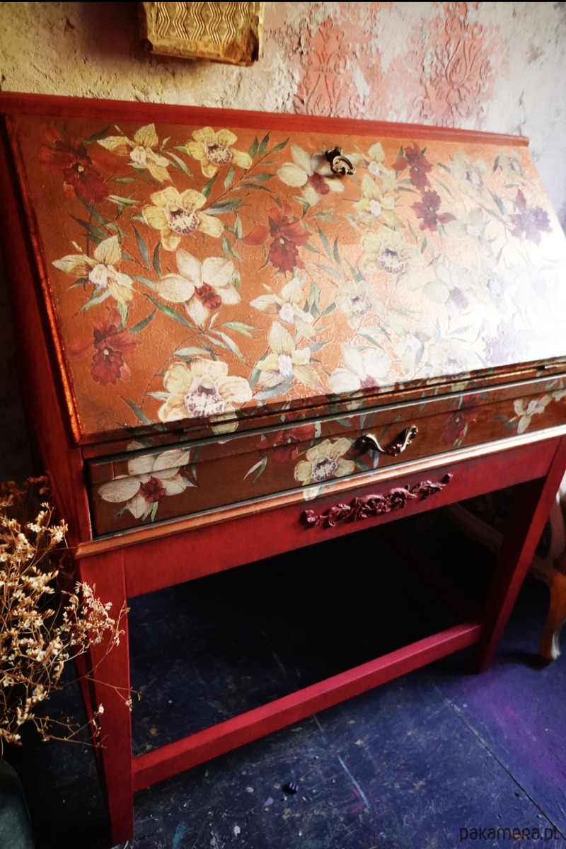 Sprzedam pomalowany przez mnie drewniany sekretarzyk. Mebel jest w całości drewniany. Otwierana duża klapa tworzy dużą przestrzeń roboczą, przy jej otwieraniu wysuwa się podpórka. Front zdobi kwiatowy transfer na miedzianej folii. Mebel jest kobiecy i bardzo klimatyczny