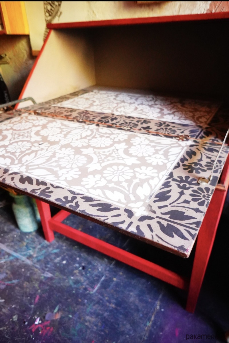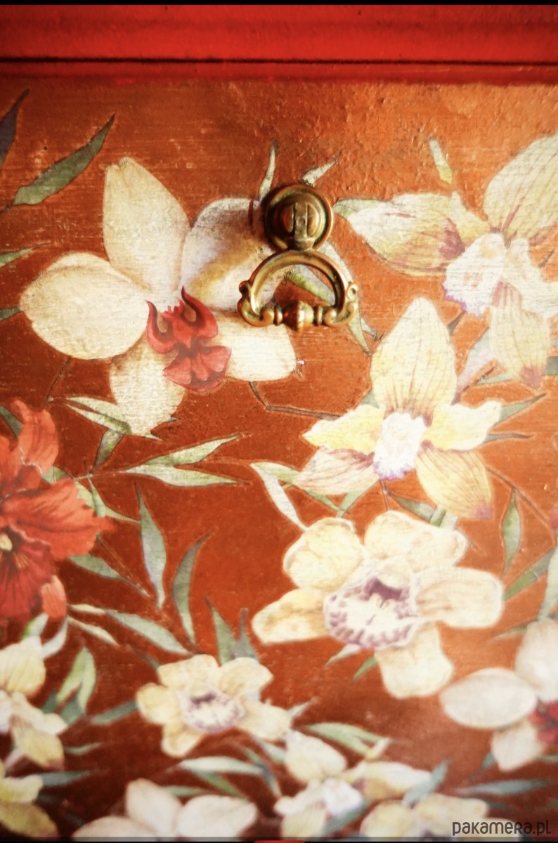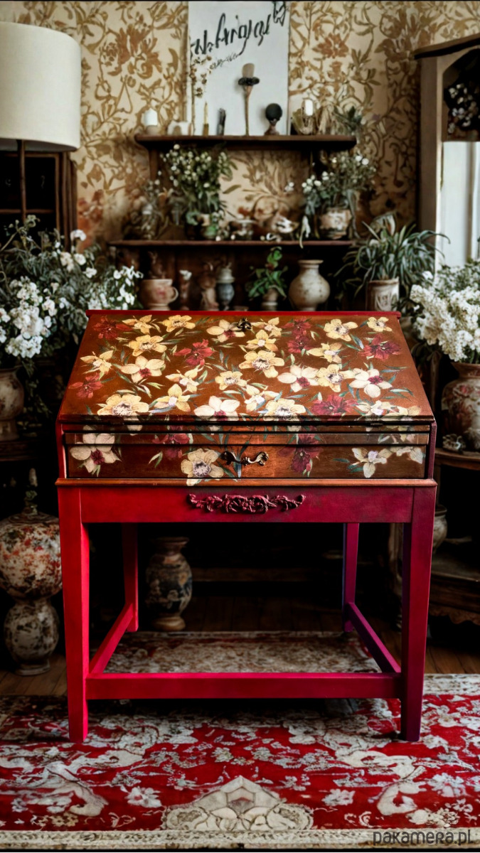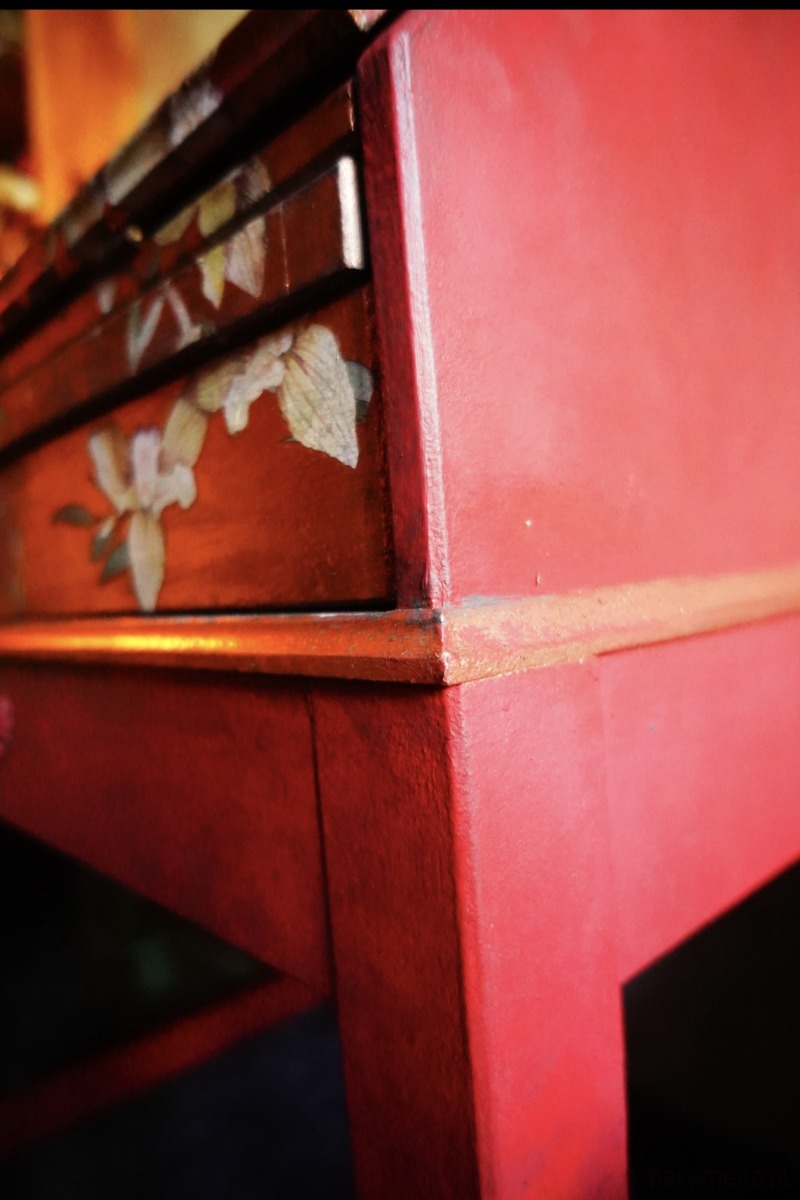 Sprzedam pomalowany przez mnie drewniany sekretarzyk. Mebel jest w całości drewniany. Otwierana duża klapa tworzy dużą przestrzeń roboczą, przy jej otwieraniu wysuwa się podpórka. Front zdobi kwiatowy transfer na miedzianej folii. Mebel jest kobiecy i bardzo klimatyczny