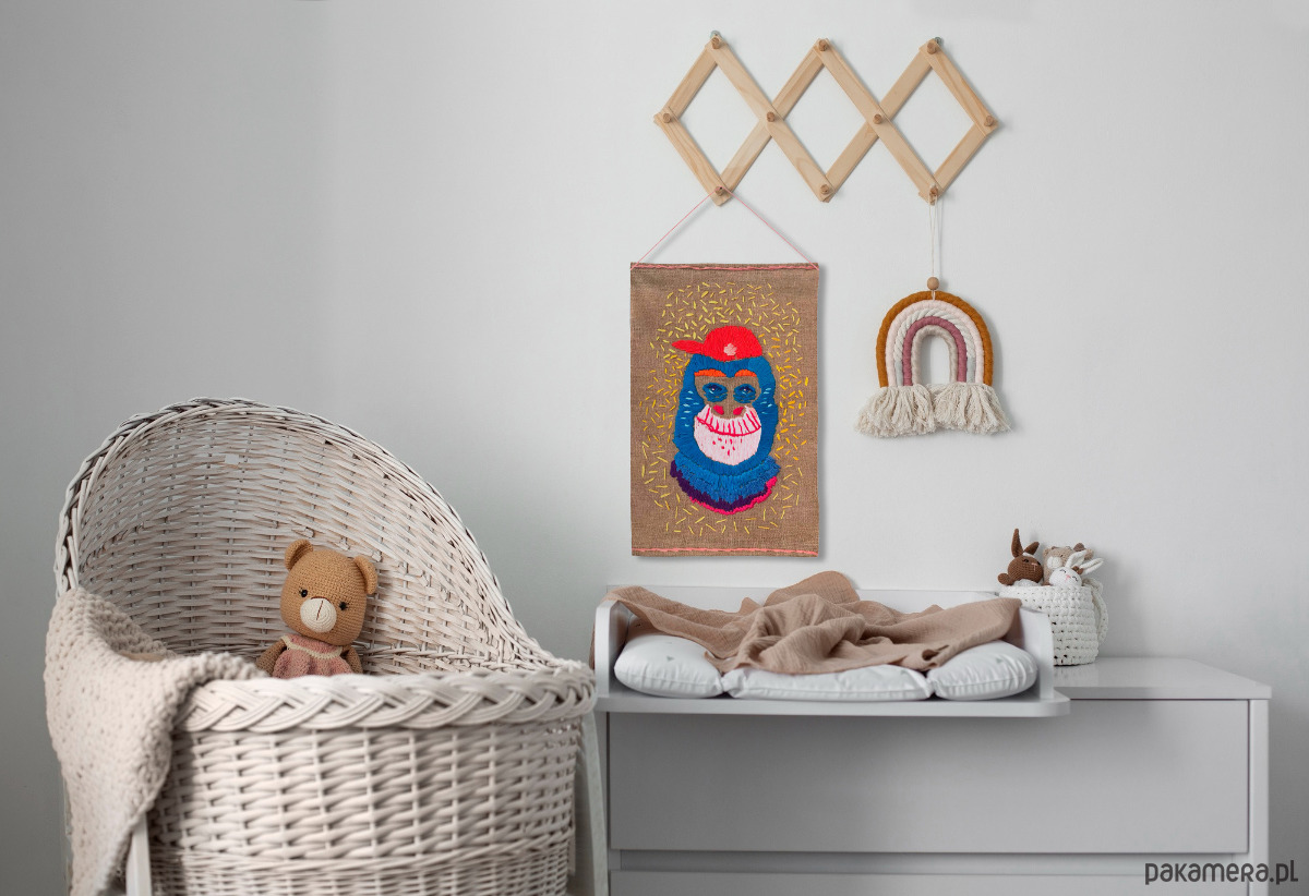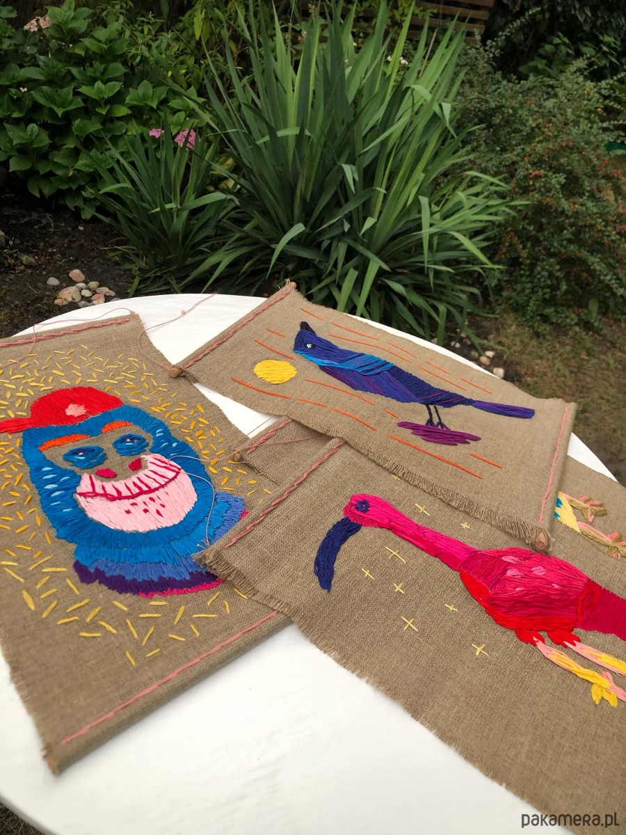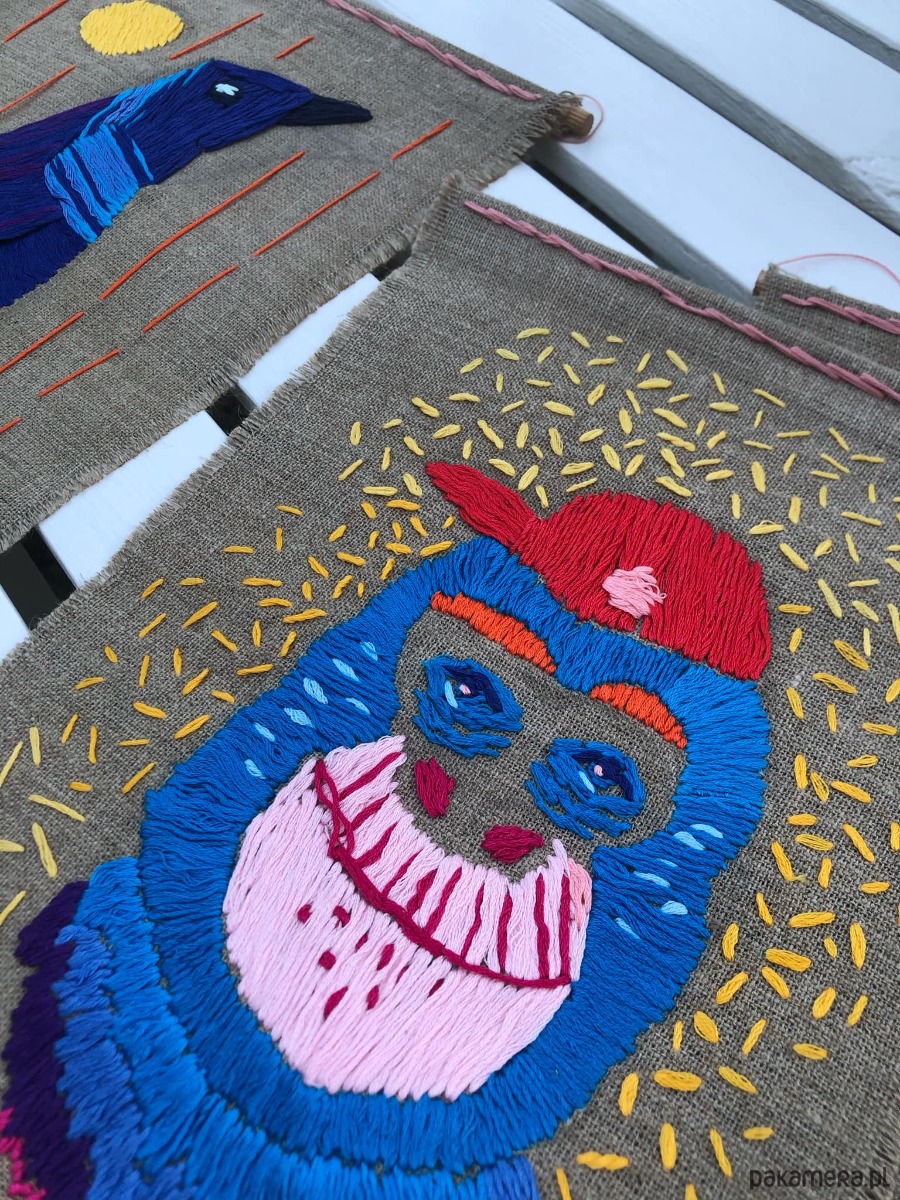 Ręcznie haftowane zwierzęta na surowym płótnie, w formie proporczyka - makatki. Dekoracja ścienna by Warsaw Birds. Różnokolorowe muliny, mienią się w słońcu.