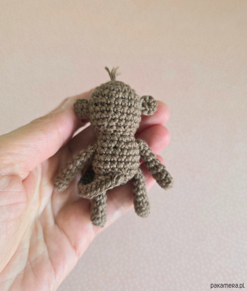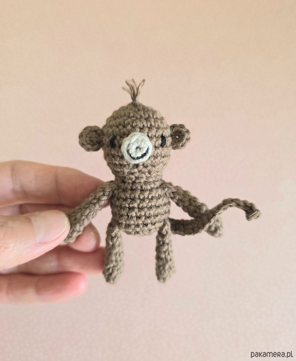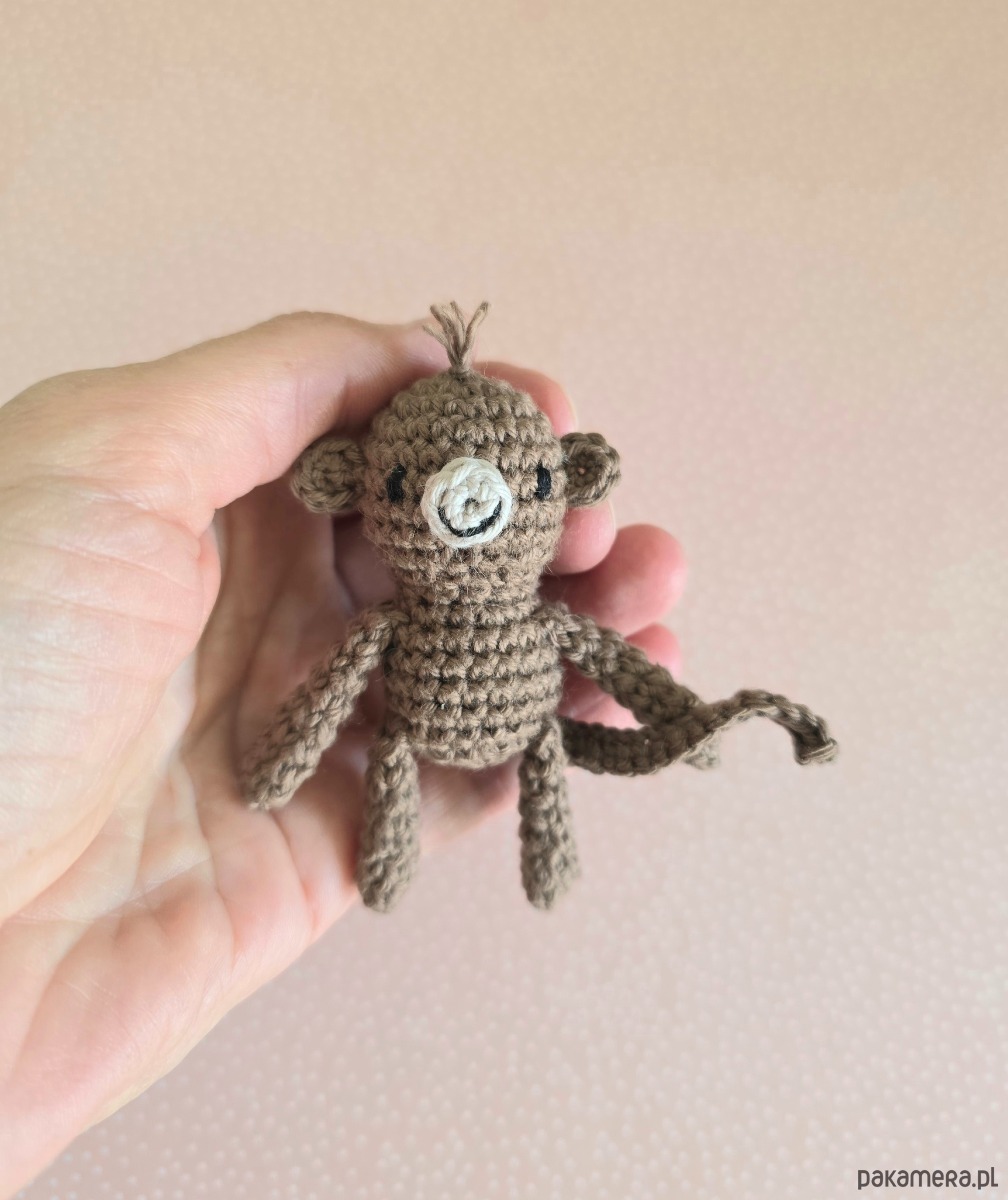 Mała brązowa małpka, która zmieści się do kieszeni, piórnika i do małej rączki. Można zabrać ją ze sobą wszędzie. Małpka ma około 7 cm, wykonana została z bawełnianej włóczki wysokiej jakości z miłością i dbałością o detale.
