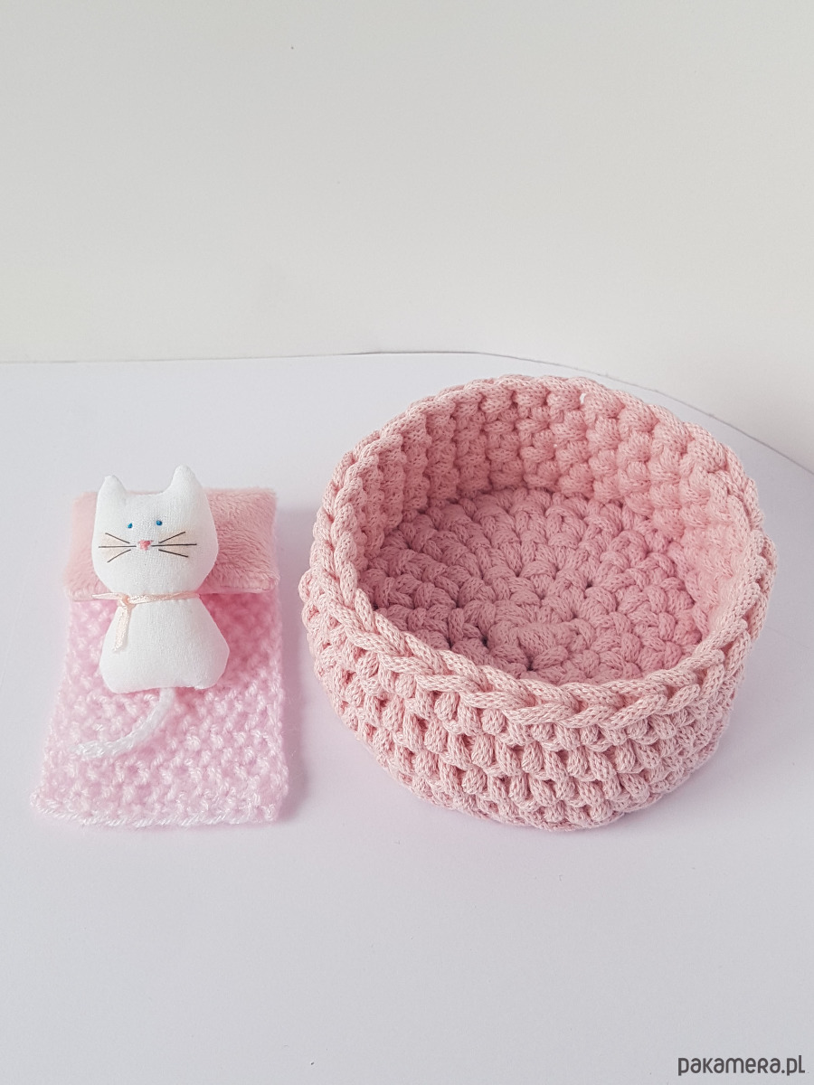 Zabawka uszyta z tkaniny bawełnianej, wypełniona włóknem silikonowym. Malutki kotek ma swoje łóżeczko - legowisko zrobione na szydełku z bawełnianego sznurka , pluszową poduszeczkę oraz kocyk zrobiony na drutach. Wymiary : kotek ok. 5,5 cm , legowisko : średnica ok. 10 cm , wysokość ok. 5 cm. Kiciuś ma wyszytą buzię i ogonek zrobiony na szydełku. Technika wykonania : szycie ręczne i na maszynie. Istnieje możliwość wykonania zabawki w kolorach : różowym, szarym , błękitnym i amarantowym. Kotek może mieć kolor biały , szary , czarny i rudy. Kiciuś chętnie zamieszka w domku dla lalek.