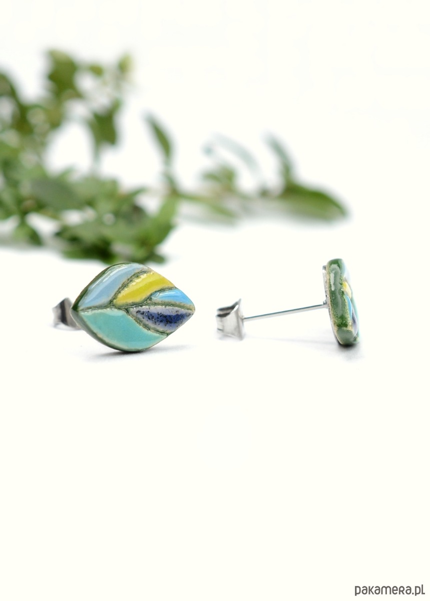 Kolczyki maja kształt listków a ich rozmiar to 13x9mm. Elementy ceramiczne zostały przeze mnie dopracowane w najmniejszym szczególe i są bardzo efektowne :))) Kolorystyka to odcienie turkusu, niebieskości, z dodatkiem limonki oraz zieleni w zagłębieniach i na bocznych krawędziach. Kolczyki są solidnie umocowane na sztyftach ze stali chirurgicznej- antyalergiczna ,w kolorze oksydowanego srebra. Polecam!! Wysyłam w ozdobnym pudełku