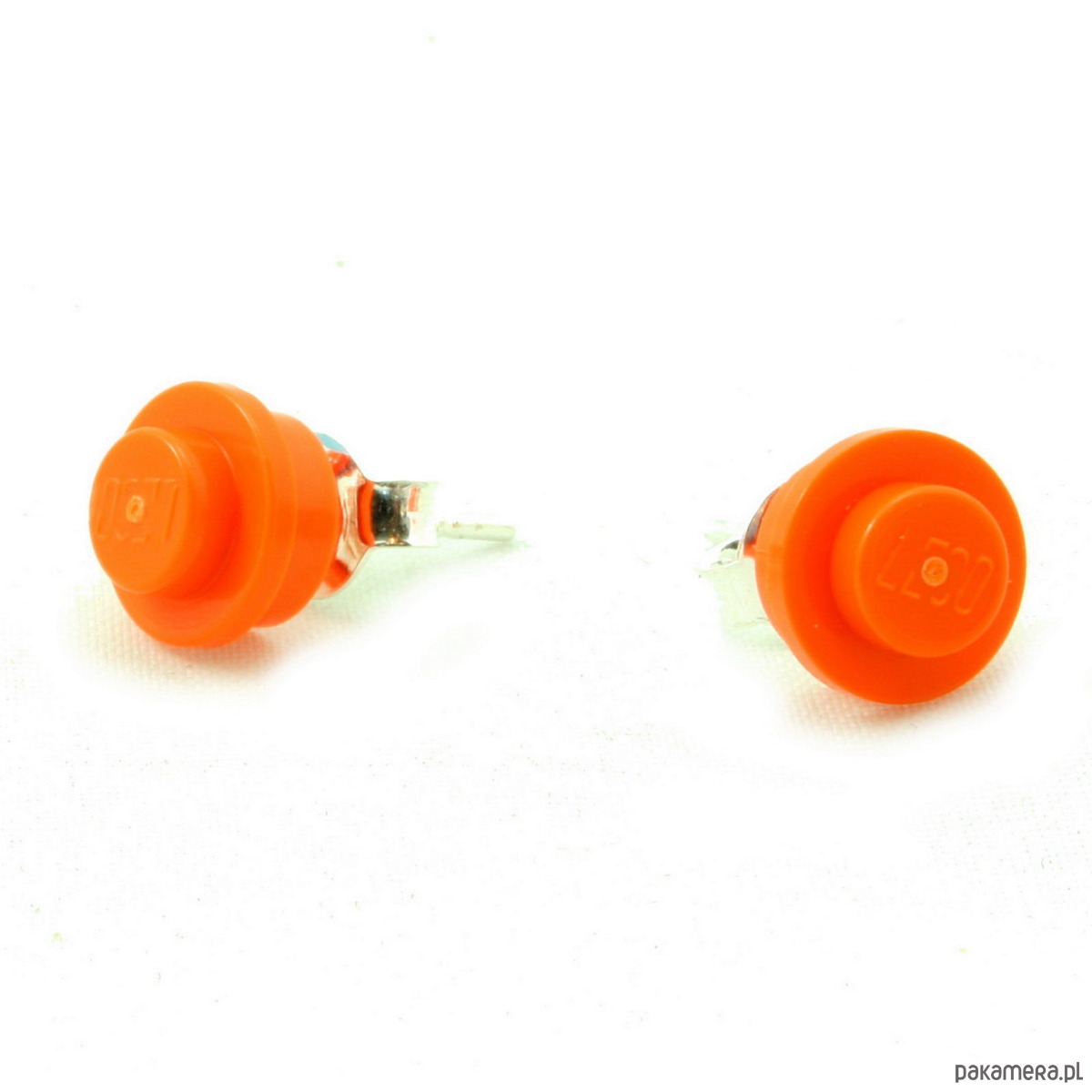 Malutkie pomarańczowe wkrętki. Wykonane z nowych klocków LEGO® w mocnym, soczystym kolorze. Sztyfty i baranki ze srebra próby 925.
