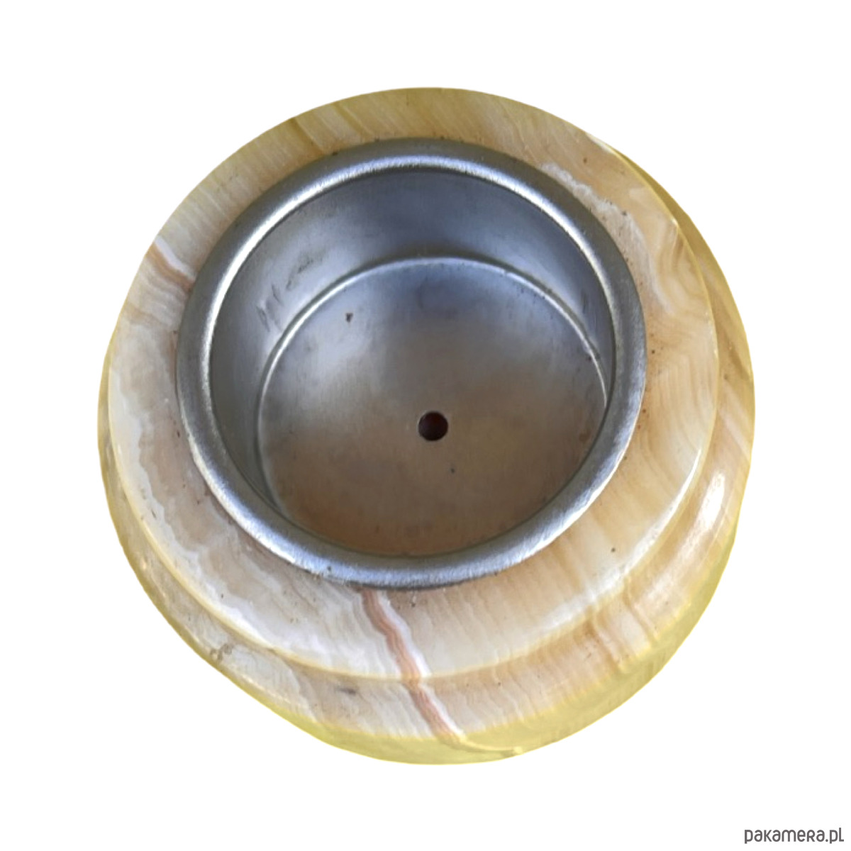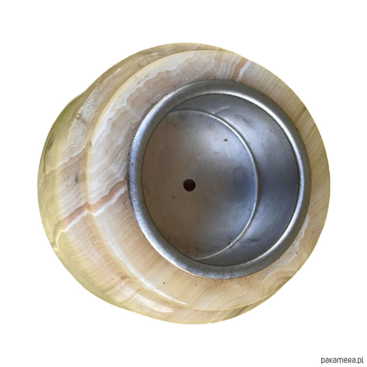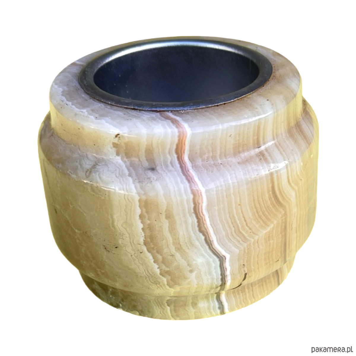 Mały, elegancki świecznik wykonany z jednego kawałka toczonego alabastru pochodzi z Włoch z lat 70. XX wieku. Alabaster w pięknym wybarwieniu. Kamień okuty w stalowe ramę z miejscem na świecę tealight. Przedmiot został wykonany ręcznie i jest zachowana w stanie dobrym, nosi niewielkie ślady użytkowania.