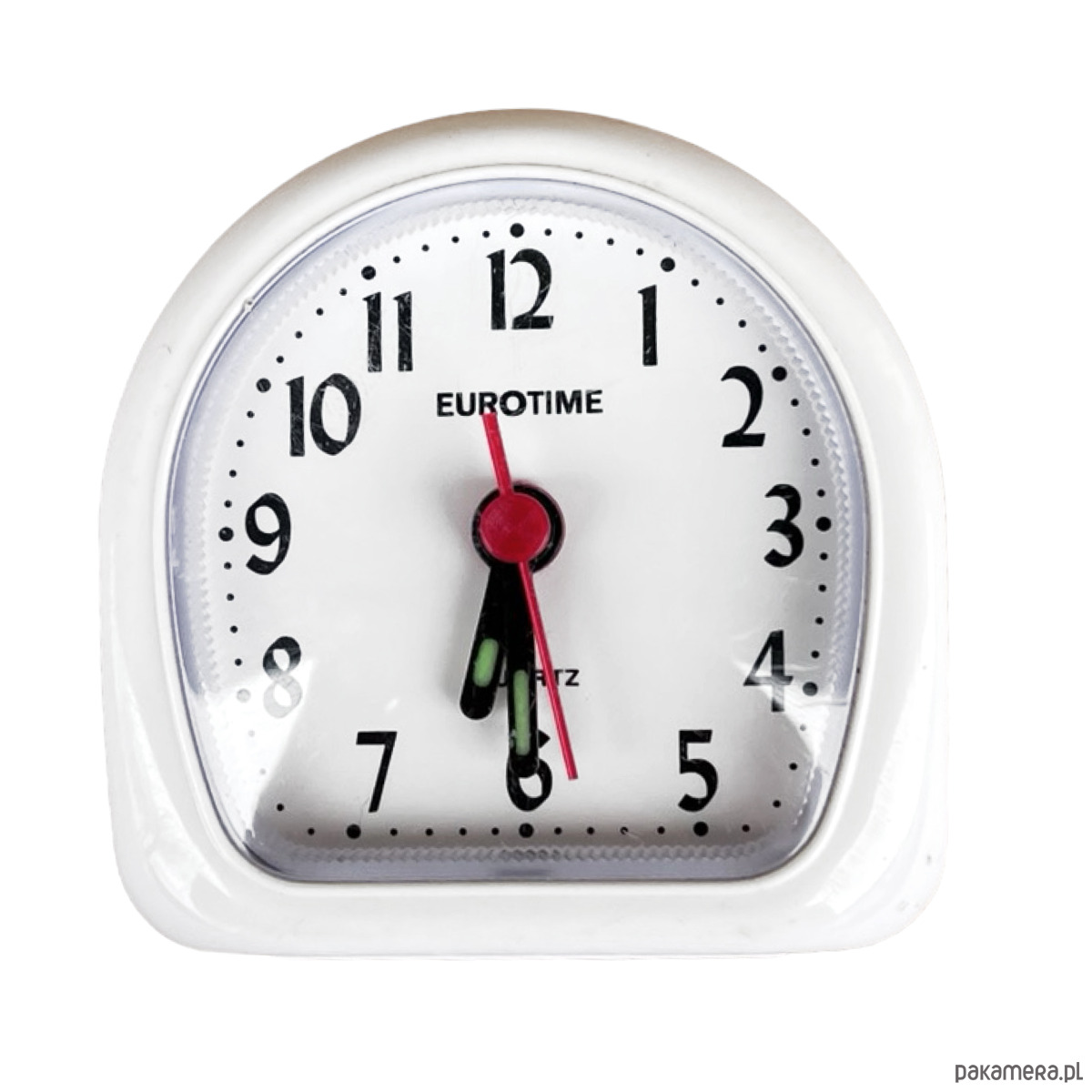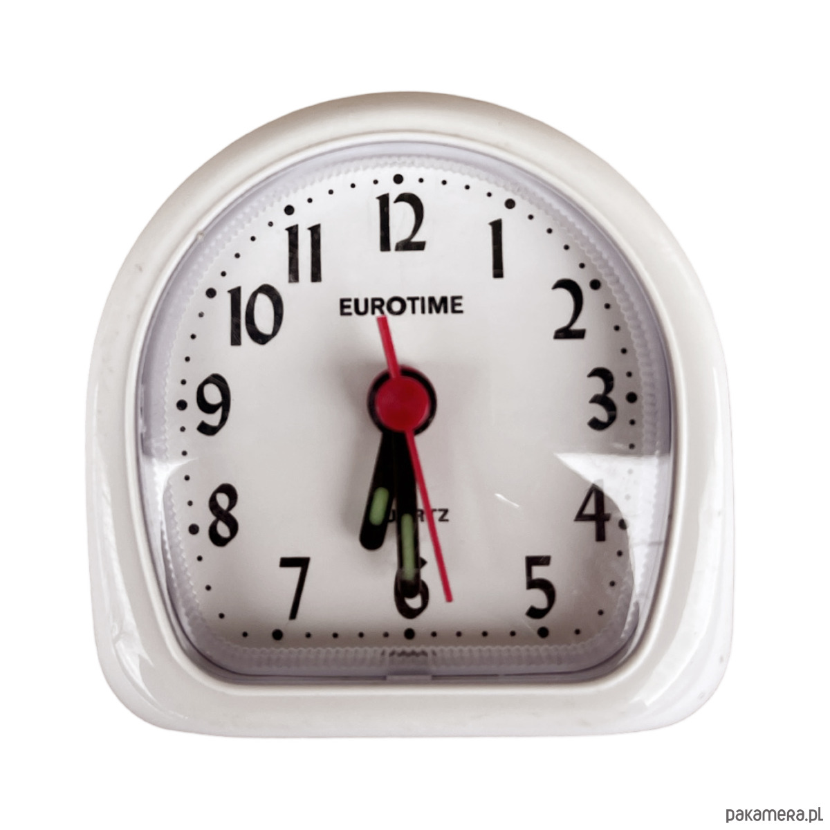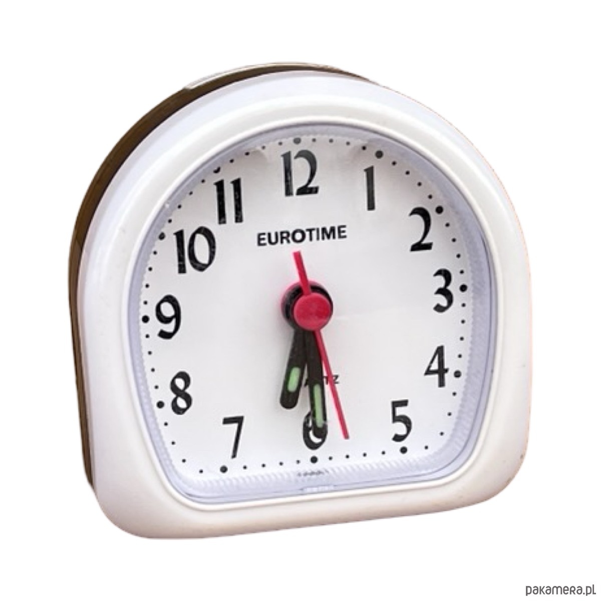 Zegar/budzik wyprodukowano w Niemieczech dla Eurotima pod koniec XX wieku.Tarcza budzika w kolorze białym, wskazówki i godziny czarne oraz fosforyzowane wskazówki. Przedmiot wykonany z tworzywa sztucznego w kolorze białym i czarnym. Budzik z mechanizmem kwarcowym na pojedynczą baterię AA. Budzik jest niewielkich rozmiarów, przez co był wygodny w użyciu, a obecnie będzie stanowił doskonały eksponat, przypominający minione czasy. Budzik na chodzie, wszystkie elementy i mechanizmy są sprawne. Budzik w stanie bardzo dobrym, mało używany.
