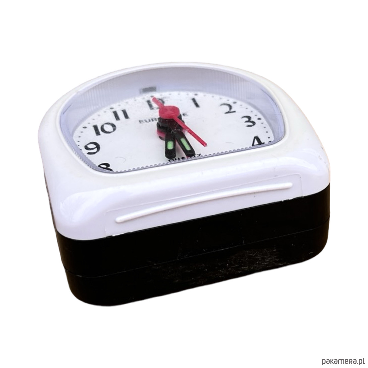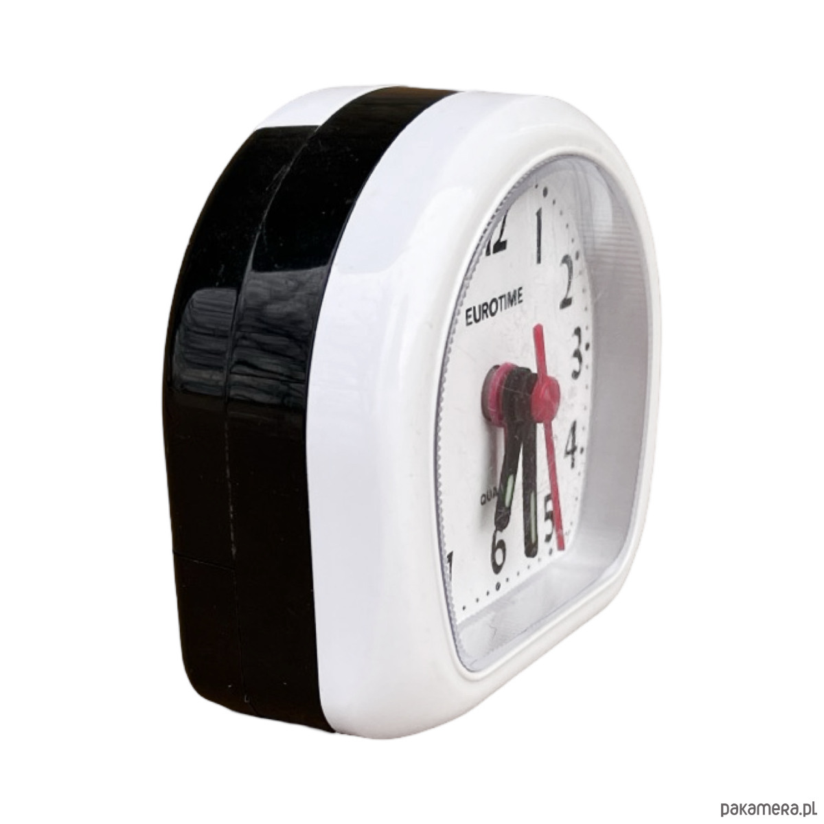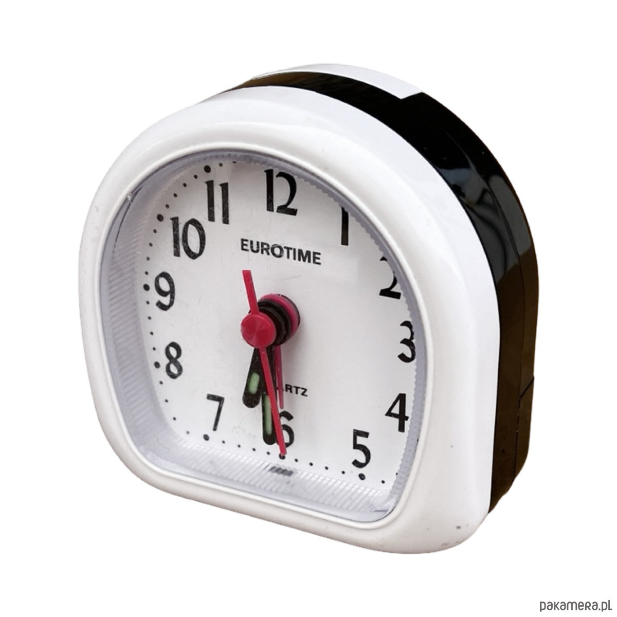 Zegar/budzik wyprodukowano w Niemieczech dla Eurotima pod koniec XX wieku.Tarcza budzika w kolorze białym, wskazówki i godziny czarne oraz fosforyzowane wskazówki. Przedmiot wykonany z tworzywa sztucznego w kolorze białym i czarnym. Budzik z mechanizmem kwarcowym na pojedynczą baterię AA. Budzik jest niewielkich rozmiarów, przez co był wygodny w użyciu, a obecnie będzie stanowił doskonały eksponat, przypominający minione czasy. Budzik na chodzie, wszystkie elementy i mechanizmy są sprawne. Budzik w stanie bardzo dobrym, mało używany.