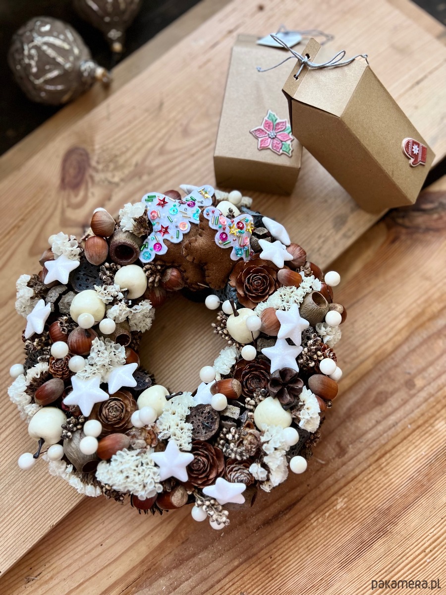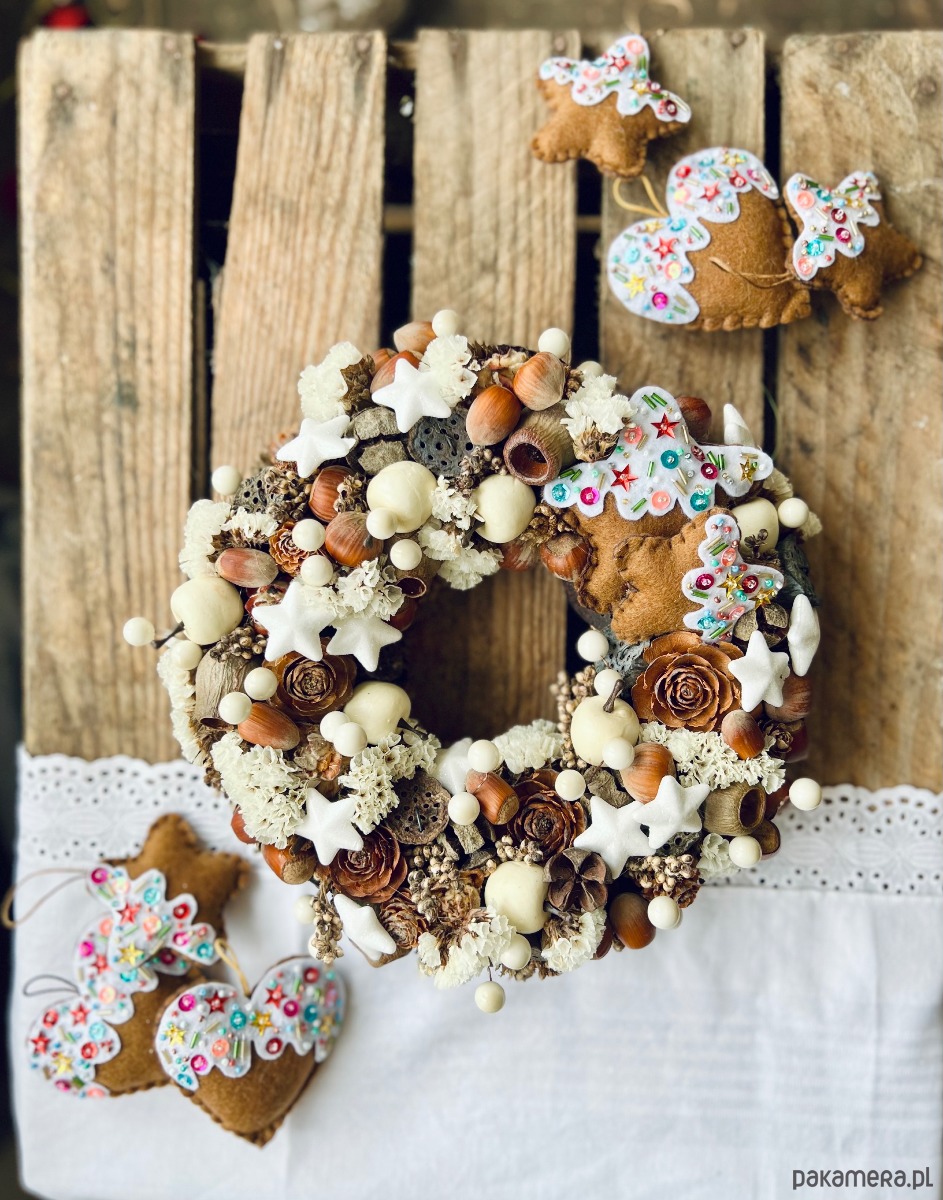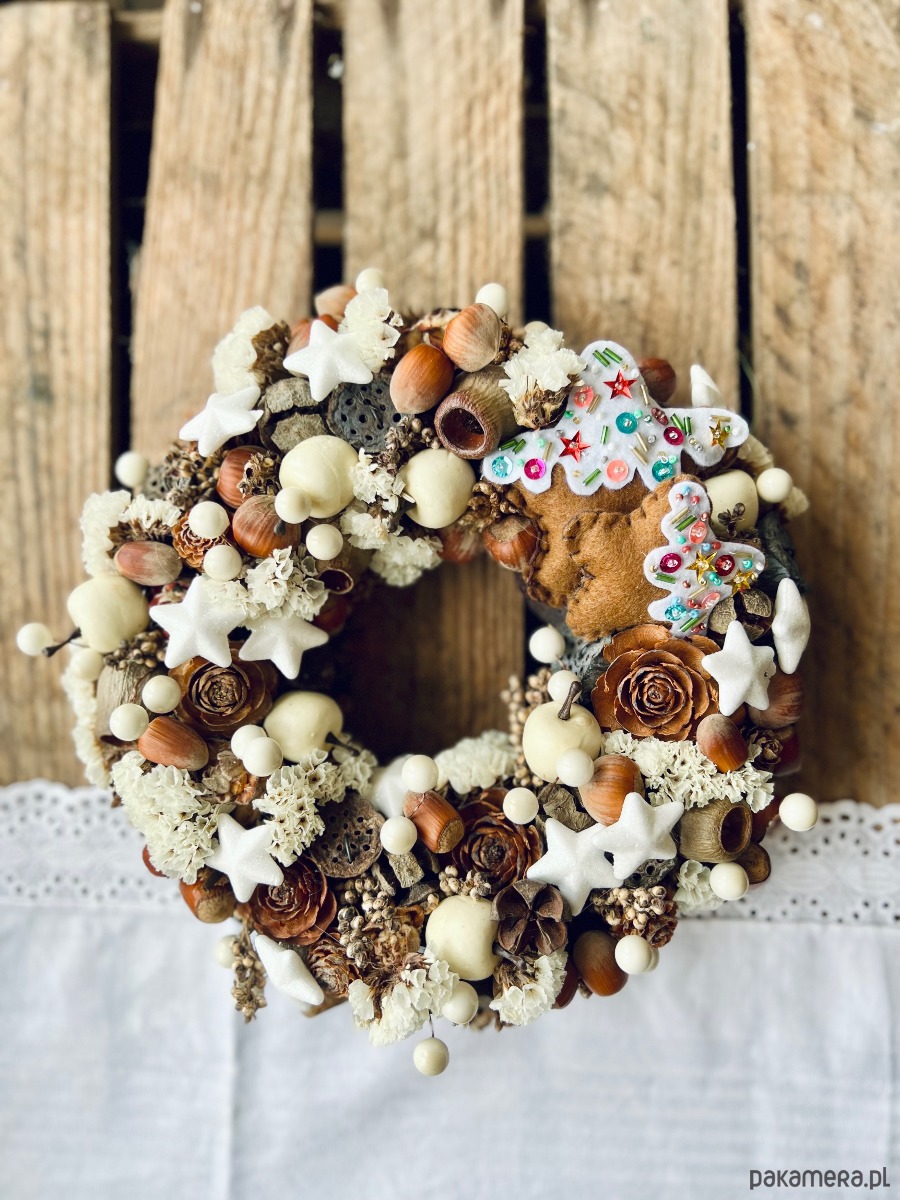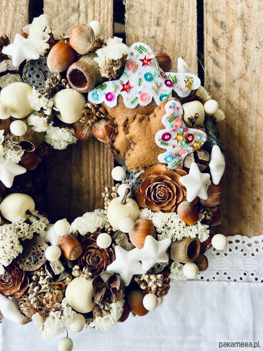 Składniki to m.in.: jabłuszka, styropianowe gwiazdki, Lotos, orzechy laskowe, Limonium (stabilizowane).