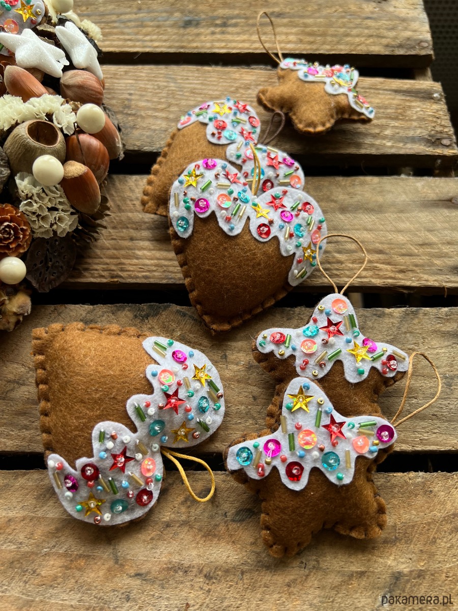 "Pierniczki" to 3 filcowe serducha (około 10 cm) i 3 mniejsze filcowe gwiazdki (około 7 cm). Wszystkie udekorowane kolorowymi cekinami i koralikami.