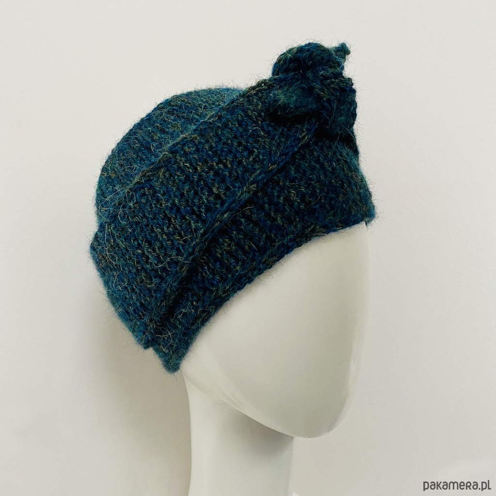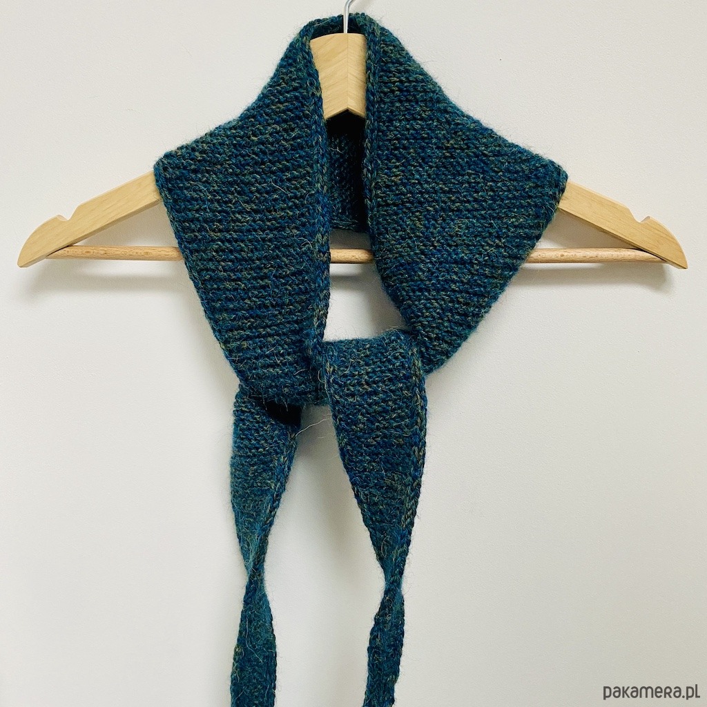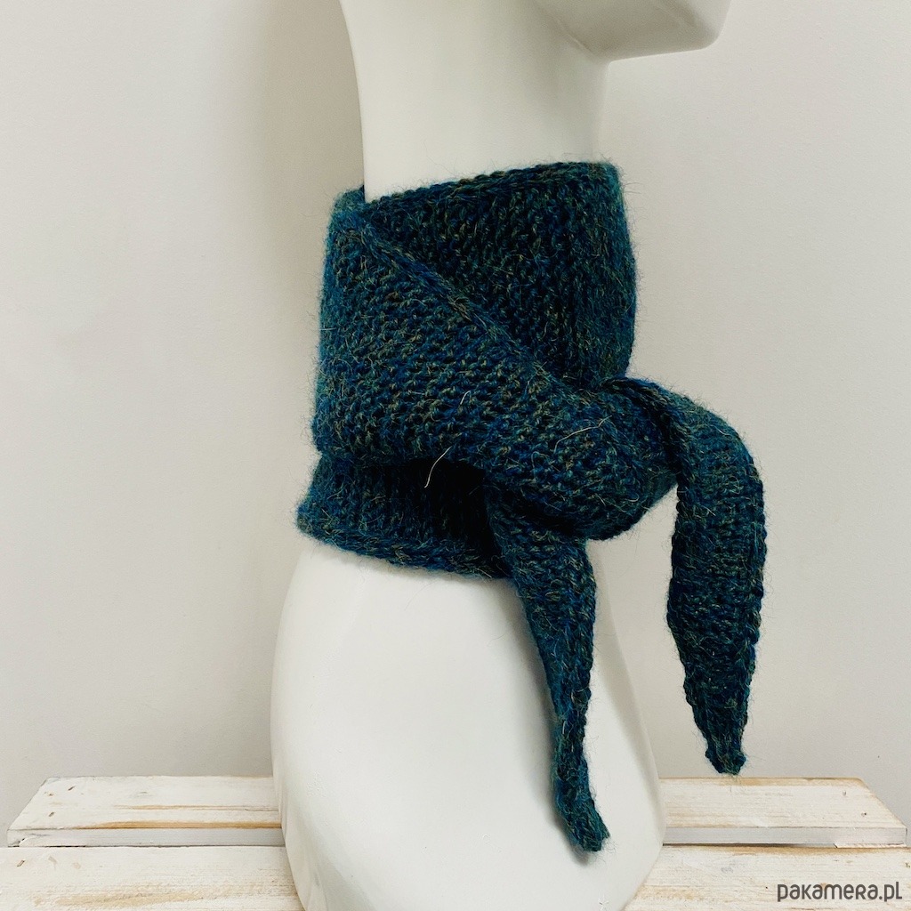 Mały szalik - apaszka wykonany w całości ręcznie na drutach z dwóch nitek wysokiej jakości miękkiej norweskiej włóczki 100% superfine alpaca, w kolorze petrol oraz leśnym zielonym. Alpaka jest włóknem nieprzetworzonym, co oznacza, że została tylko uprana oraz, że przed farbowaniem nie została poddana obróbce chemicznej.