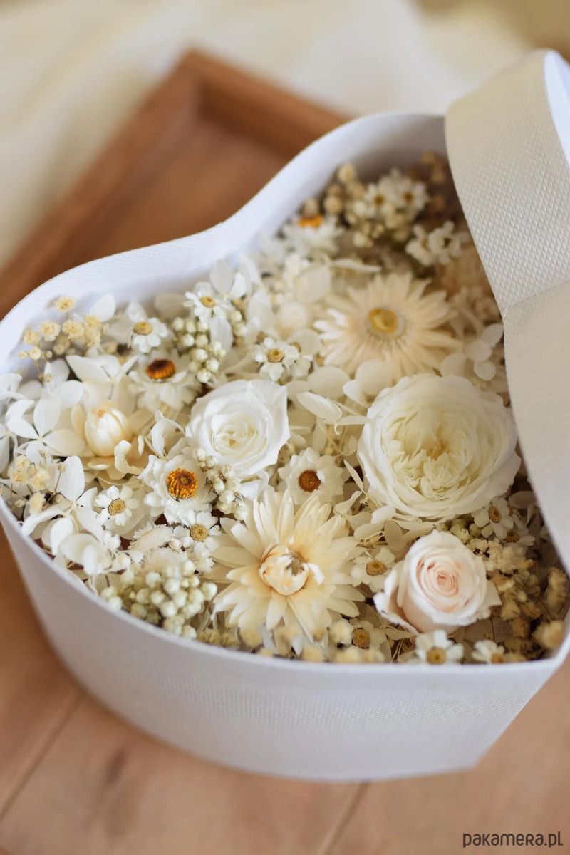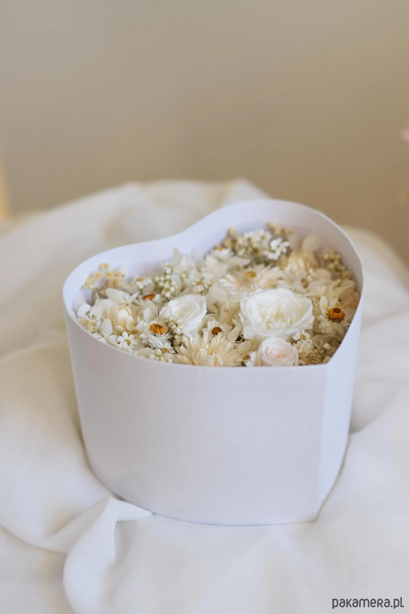 Flower box w kształcie serca w małym rozmiarze z kolekcji, wykonany ręcznie z suszonych i stabilizowanych kwiatów w jasnej, naturalnej kolorystyce. Zastosowane rośliny zachowują swój wygląd przez długi czas, dzięki czemu kompozycja pozostaje piękną pamiątką.