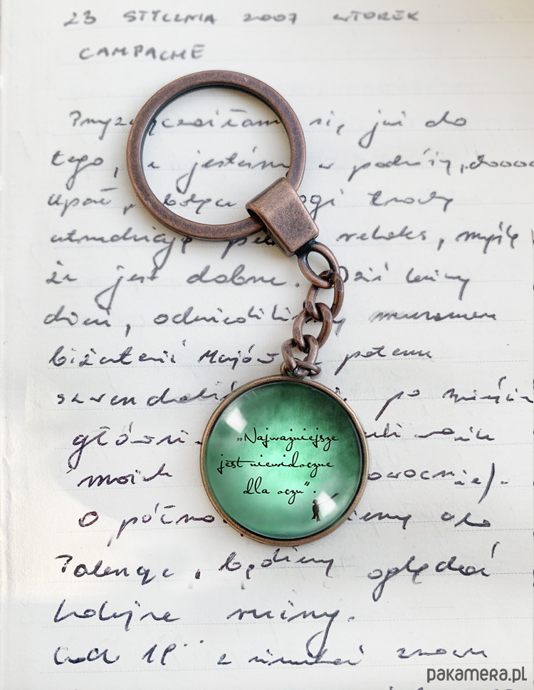 Jeden z najbardziej znanych cytatów z kultowego Małego Księcia. "Najważniejsze jest niewidoczne dla oczu". Napis ukryty jest pod 25 mm wypukłym szkiełkiem.