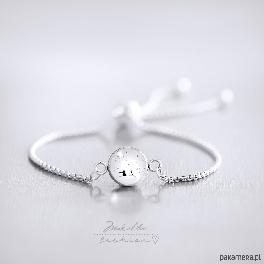 Piękna, delikatna, kobieca bransoletka wykonana ze stali nierdzewnej. Autorska grafika z kolekcji Mały książę została ukryta pod 10 mm wypukłym szkiełkiem. Silikonowy zacisk pozwala dostosować bransoletkę do każdego nadgarstka