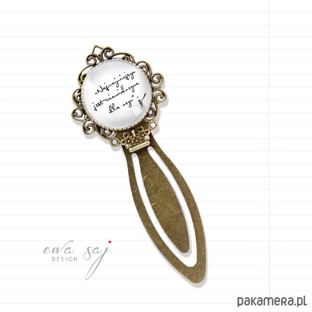 Oryginalna, elegancka zakładka idealna do książek oraz do spinania wyjątkowych dokumentów, Wykonana z metalu w kolorze antycznego złota, ozdobiona miniaturką mojej grafiki. Długość zakładki 8 cm. Wielkość graficznej miniatury 20 mm.