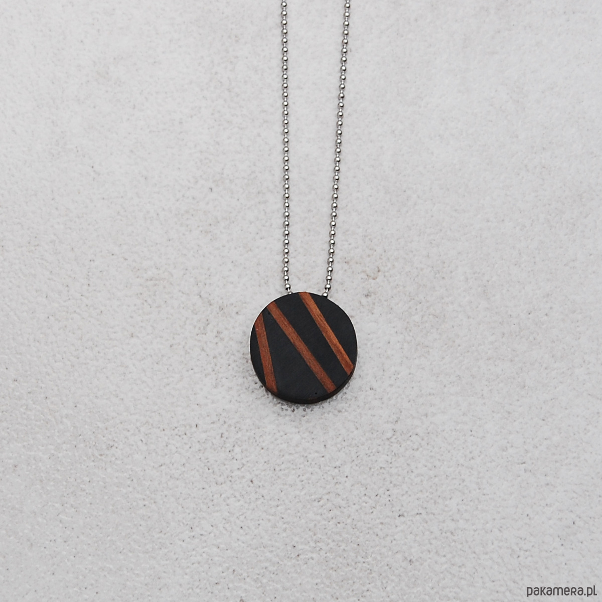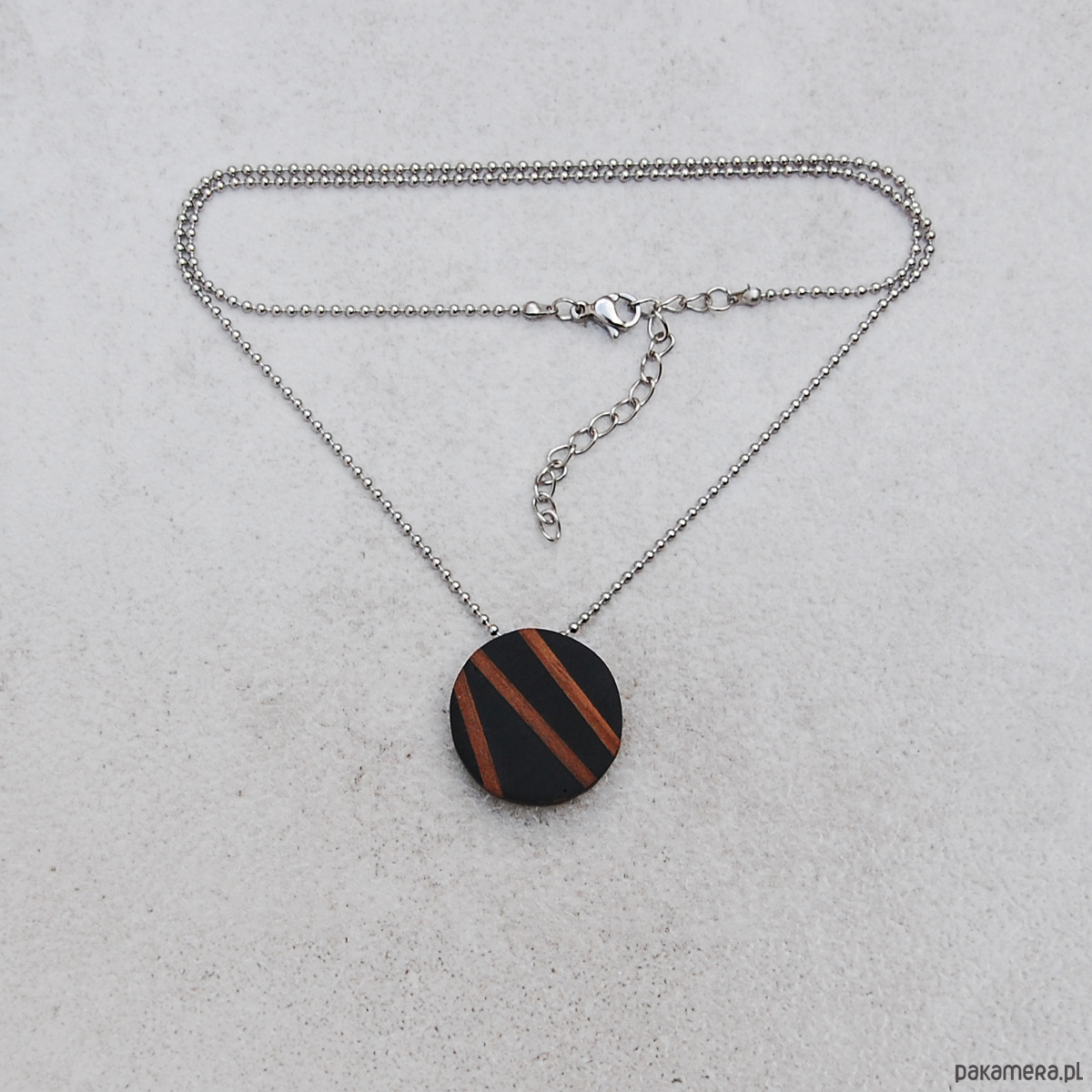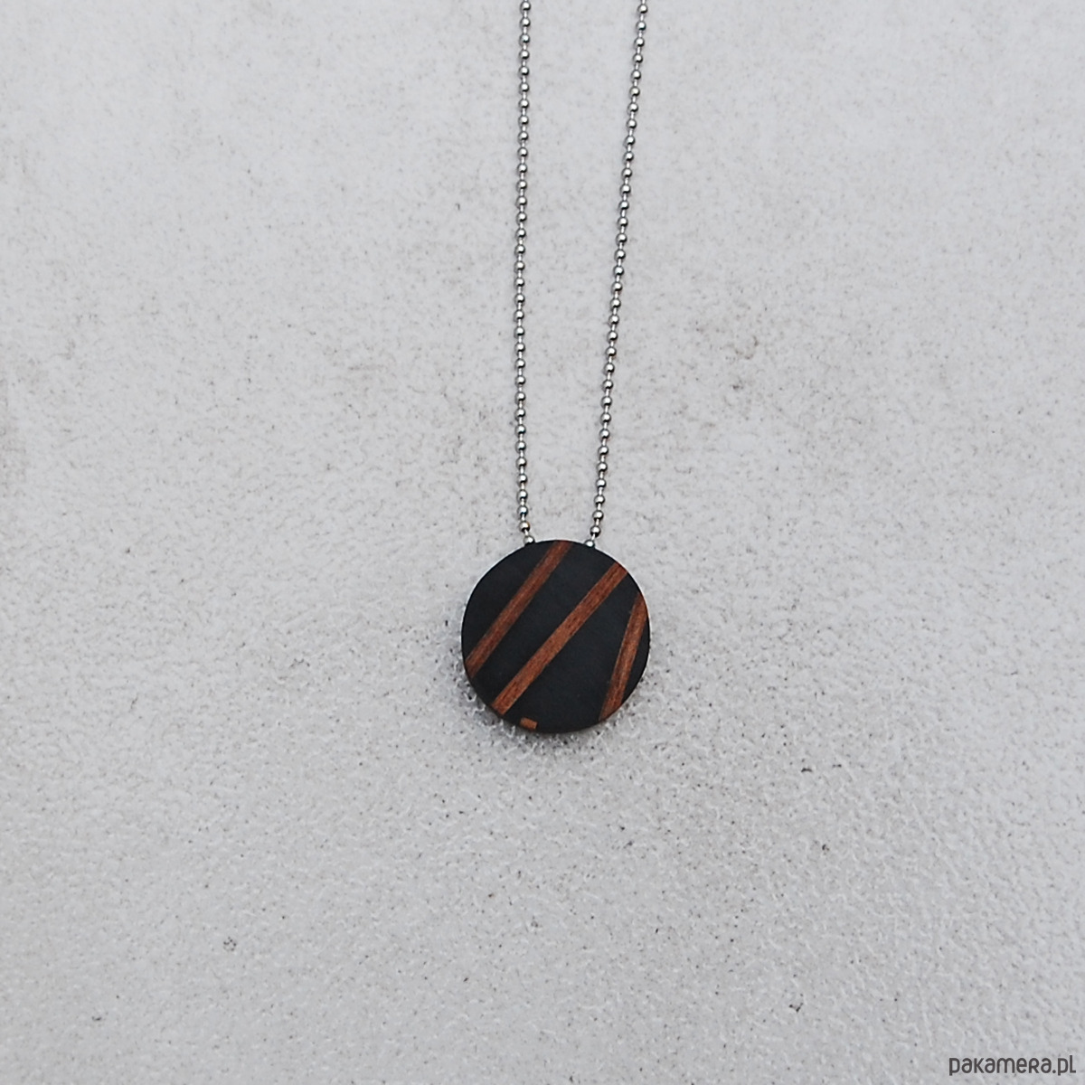 Unikatowy naszyjnik jest wykonany z żywicy jubilerskiej i drewna sapeli. Paski drewna ułożone są na powierzchni naszyjnika w unikatowy abstrakcyjny wzór. Średnica 22mm i długość całkowita łańcuszka 51cm (stal chirurgiczna).