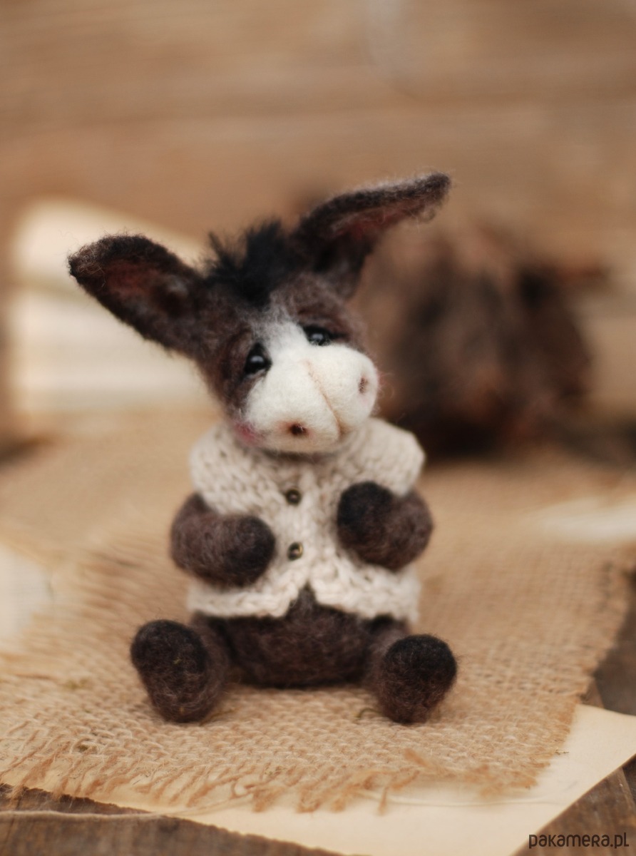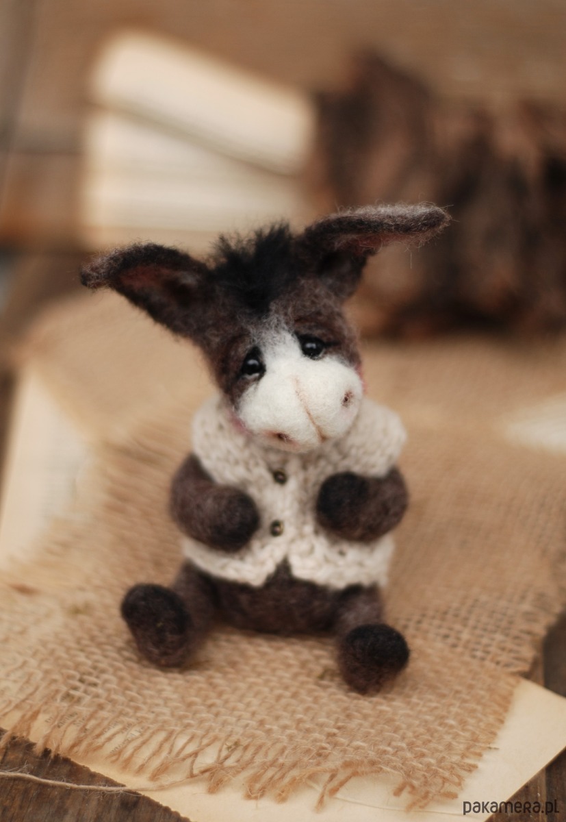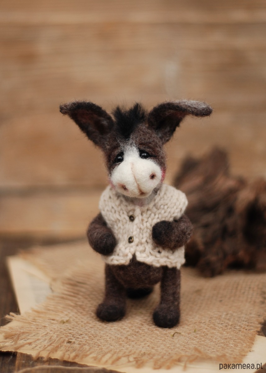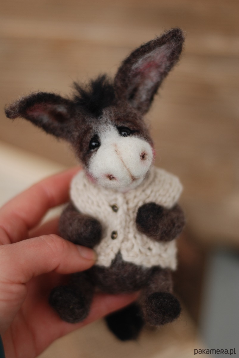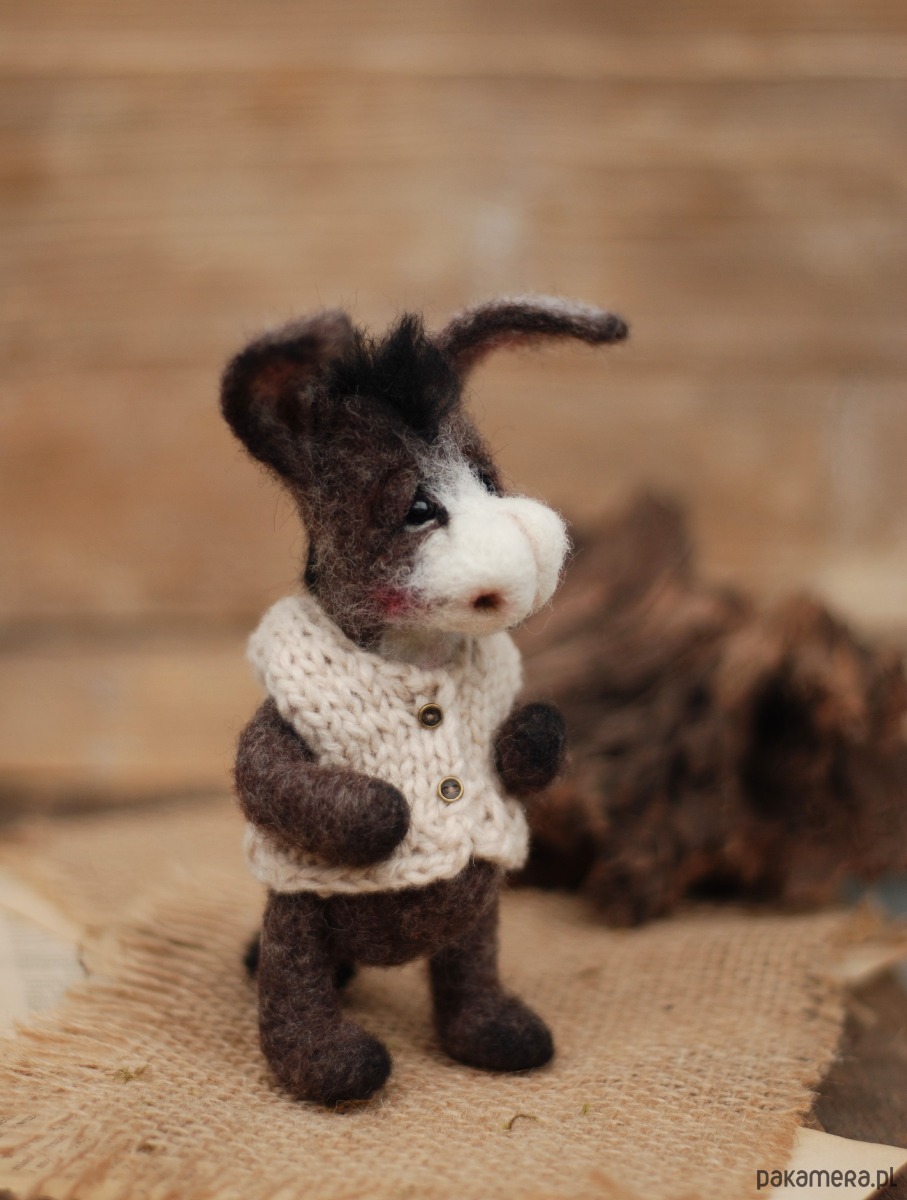 Osiołek wykonany metodą filcowania na sucho z wełny merynos.