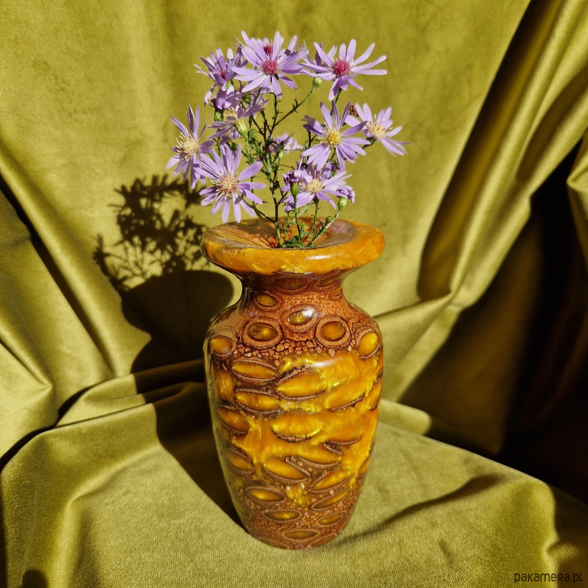 Ten mały, ręcznie toczony wazon (złota żywica epoksydowa i owoc banksji ) ukazuje naturalne piękno niezwykłego strąka Banksia w bogatych szczegółach. Strąk wyglądający jak ogromna szyszka jest zawieszony w głębokiej, wirującej, złotej żywicy z połyskującymi jaśniejszymi tonami. Pochodząca z Australii Banksia ma uderzające, organiczne wzory - elipsoidy, wiry i odważne arabeski, które sprawiają, że każdy egzemplarz jest całkowicie wyjątkowy. Przyciągający wzrok i dramatyczny, ten krótki wazon stanowi mocny element centralny.
