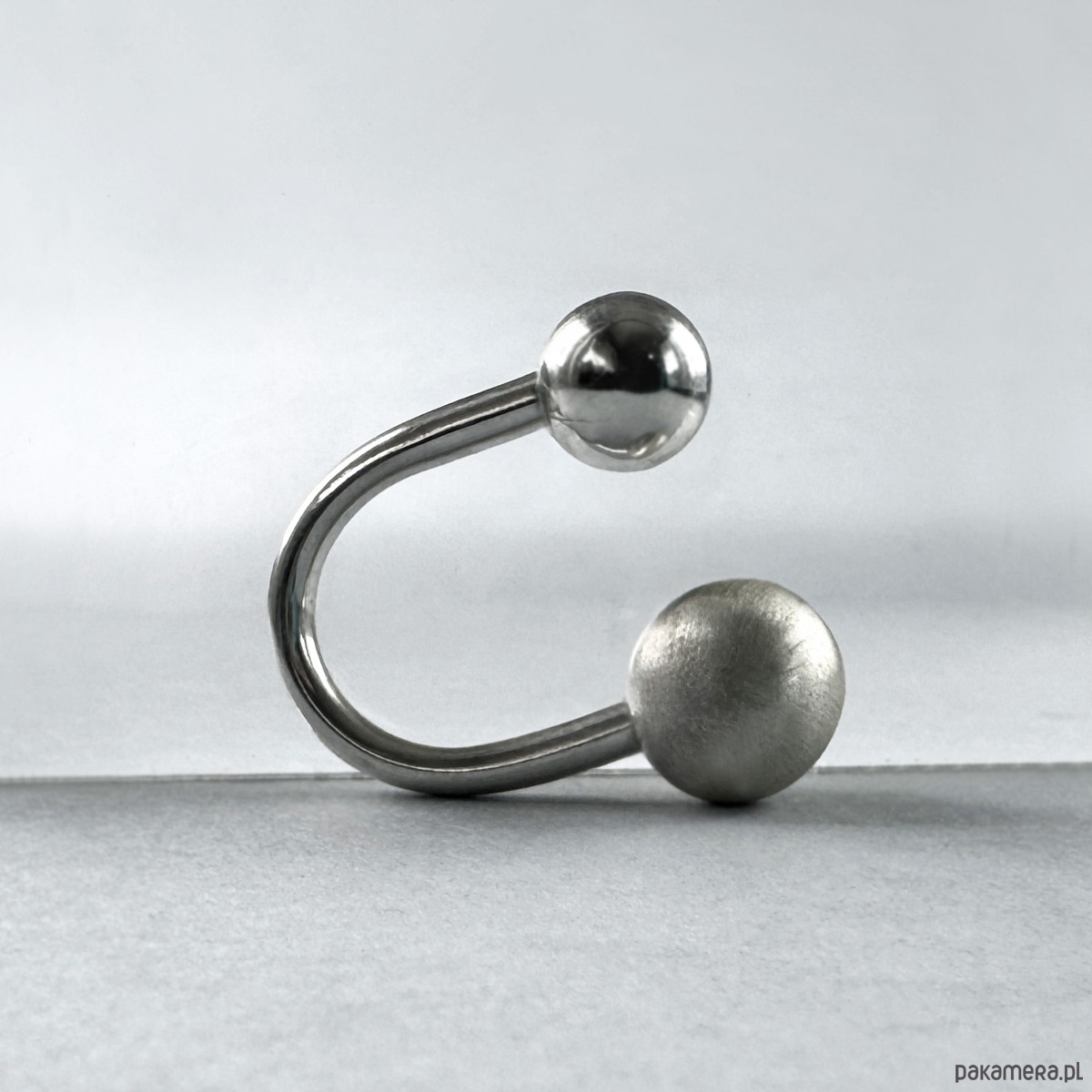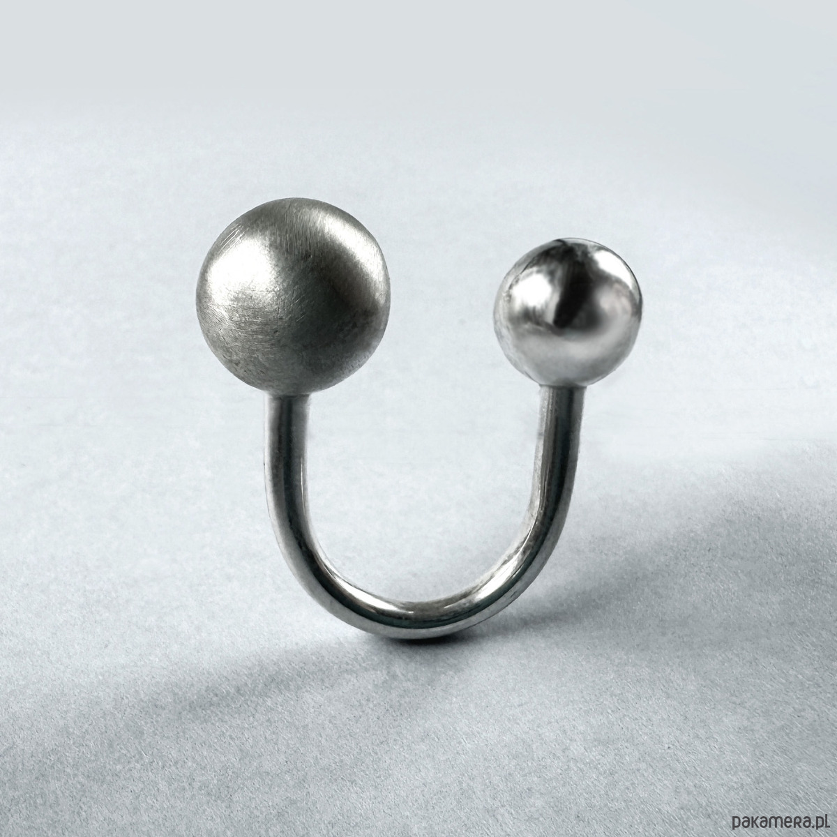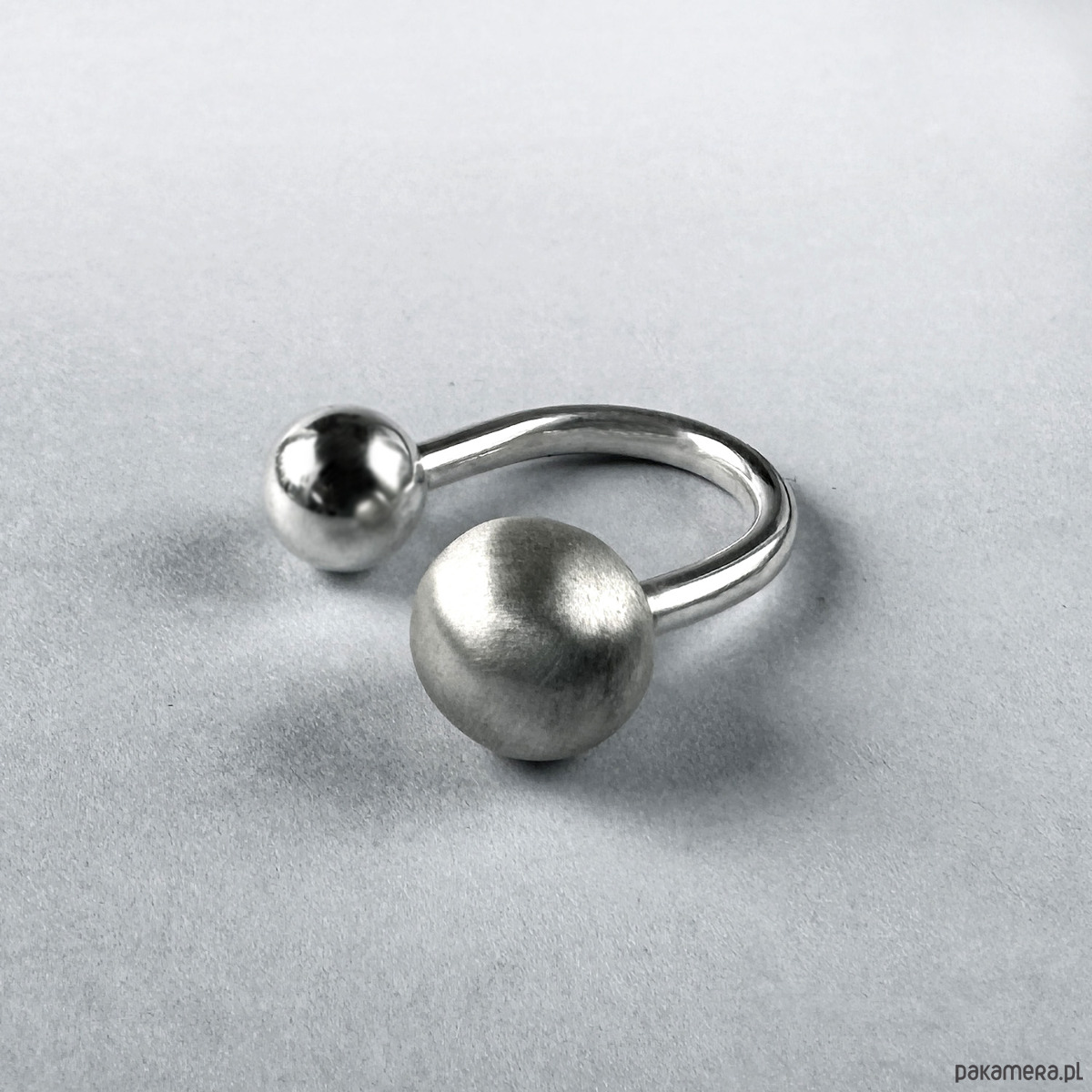 Kolekcja powstała z myślą o kobietach, ceniących sobie prostą, geometryczną biżuterię. Uniwersalny i minimalistyczny pierścionek z opcją regulacji, wykonany został ze srebra próby 925. Większa, matowa kula, stanowi ciekawy kontrast dla mniejszej, polerowanej formy. Całość kompozycji urzeka swoją prostotą. Pierścionek jest bardzo wygodny w noszeniu i pasuje do każdej stylizacji. Ubierzesz raz i zakochasz się w nim :)