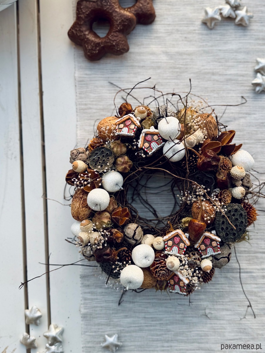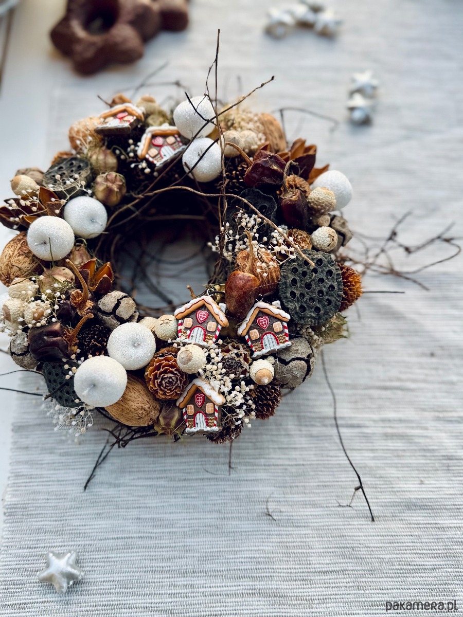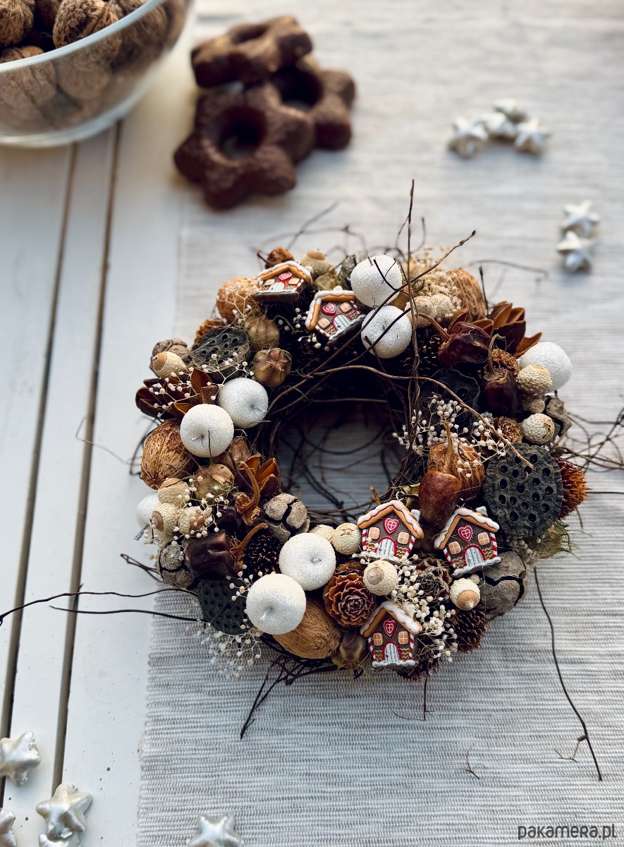 Składniki to m.in.: styropianowe jabłka, lotos, szyszki, Czarnuszka, papryczki chilli, akrylowe chatki.