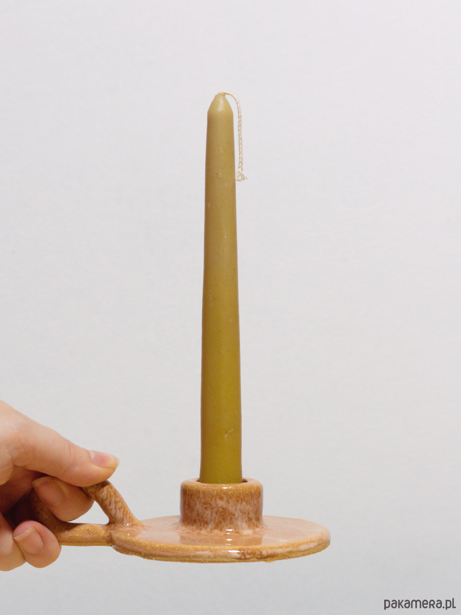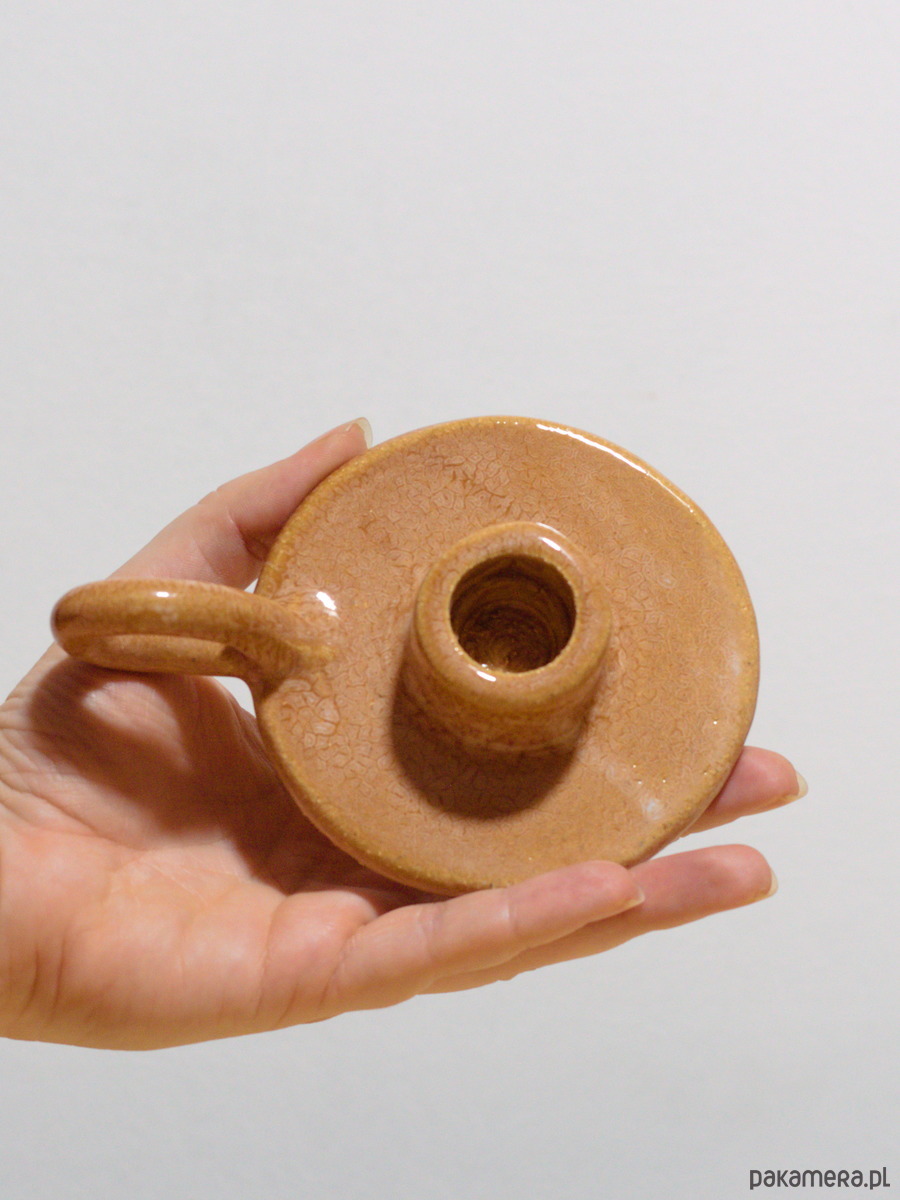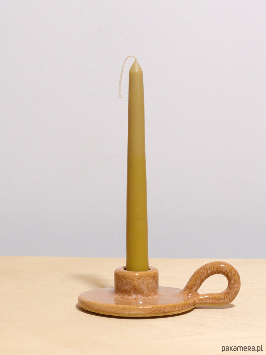 Świecznik jest w kolorze Ruchome Piaski - rudawy brąz z jasnymi kremowymi efektami.