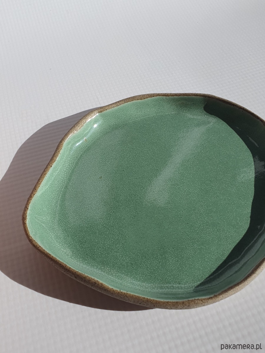 Talerz stworzony jest z betonowej gliny oraz pokryty zielonym szkliwem