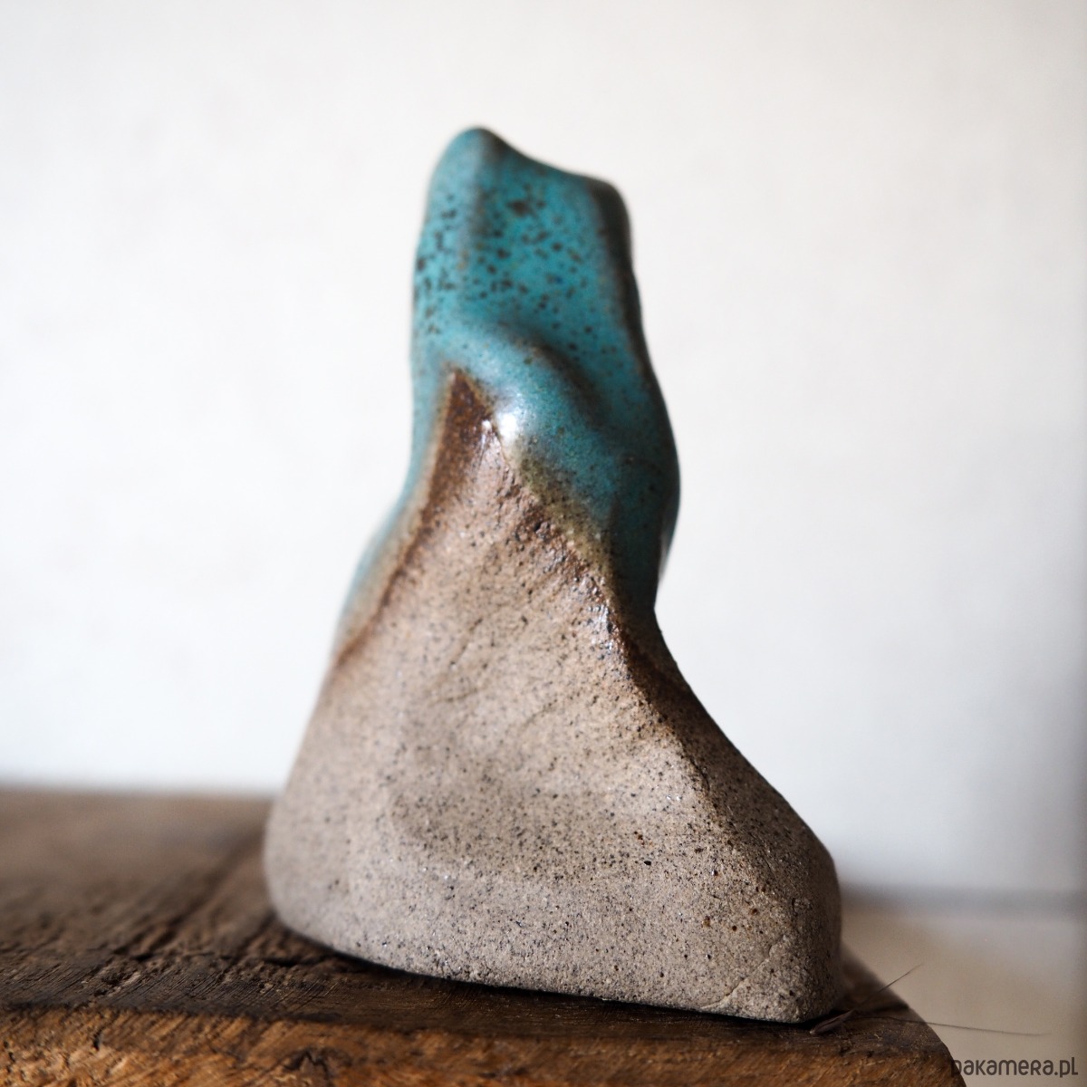Wazonik stworzony z szarobrązowej gliny, pokryty matowym szkliwem w kolorze turkusowym.