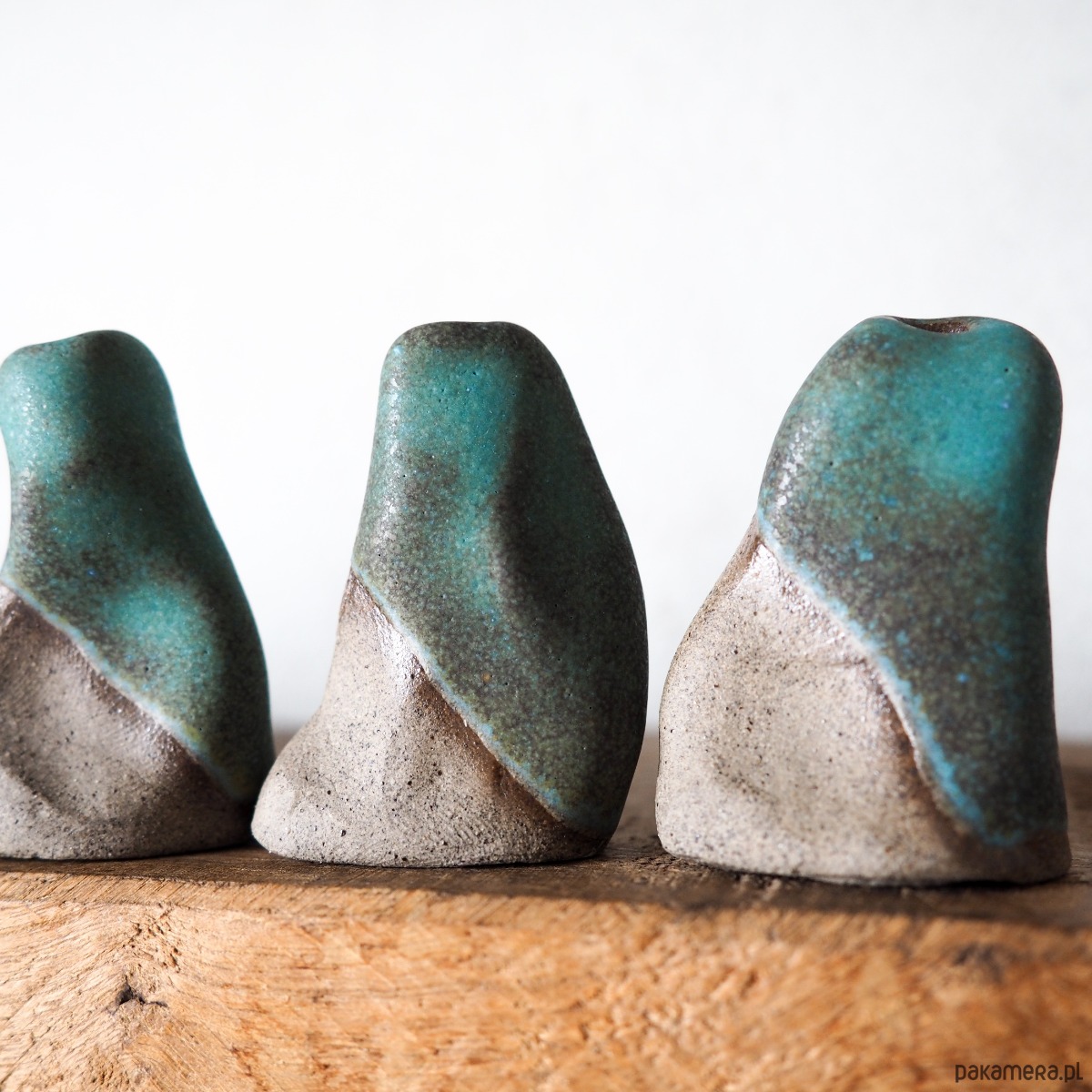 Ręcznie tworzony wazonik o organicznej formie, która sprawia, że każdy egzemplarz ma swój indywidualny charakter. Pokryty szkliwem w naturalnych odcieniach zieleni i turkusu, przywodzi na myśl spokojną, ziemistą paletę kolorów.