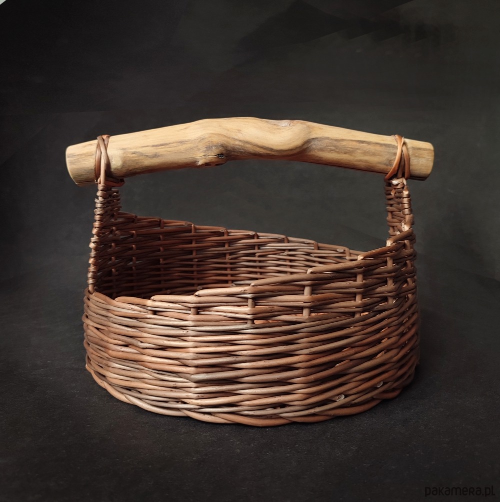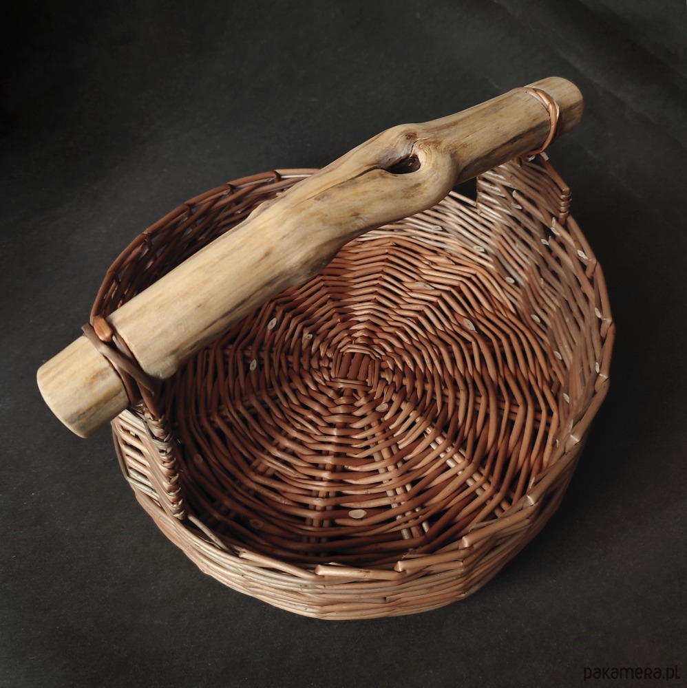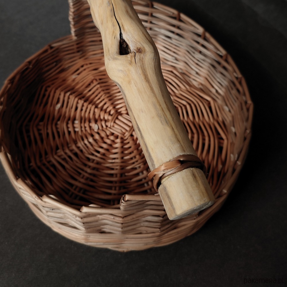 Mały wiklinowy kosz, wypleciony na okrągłym dnie z wikliny korowanej. Posiada drewnianą rączkę, która nadaje mu rustykalny charakter.
