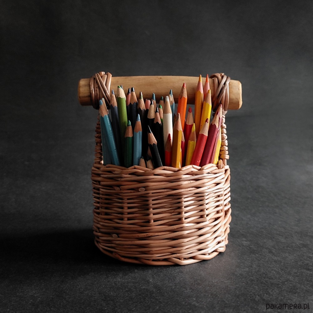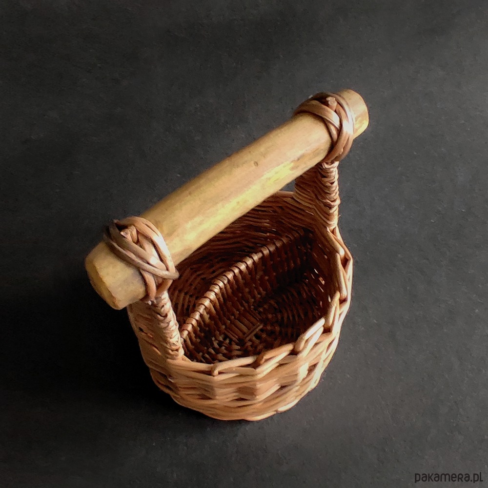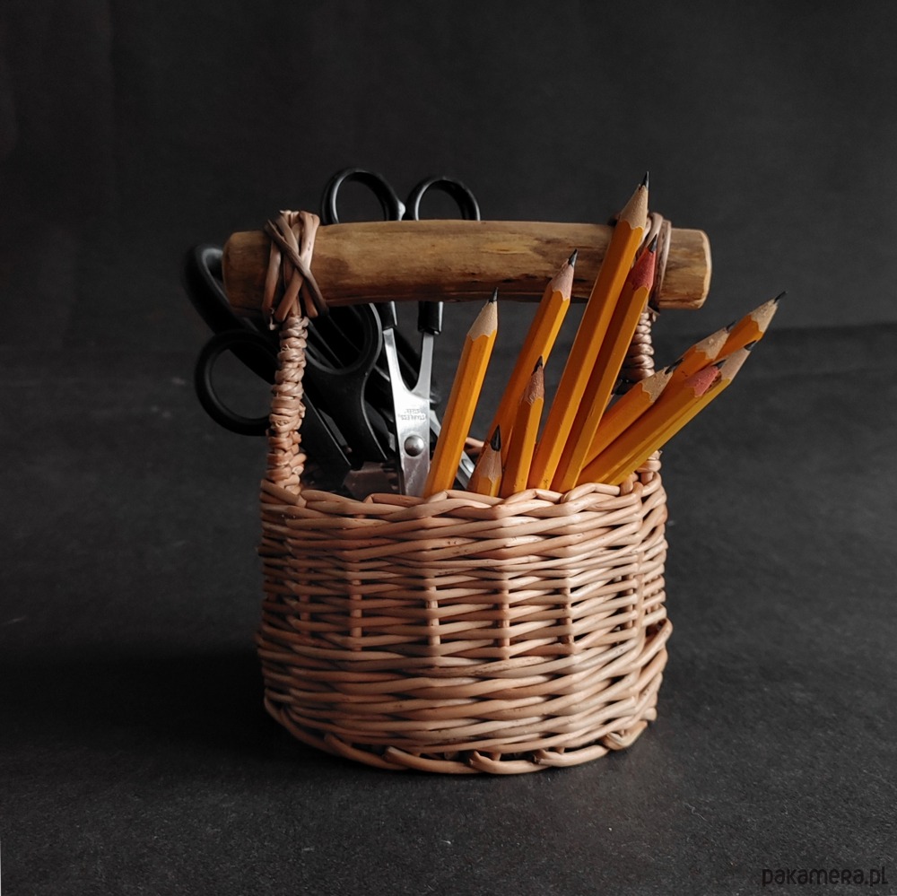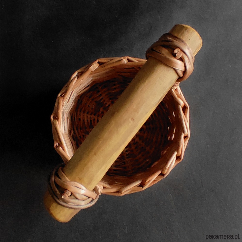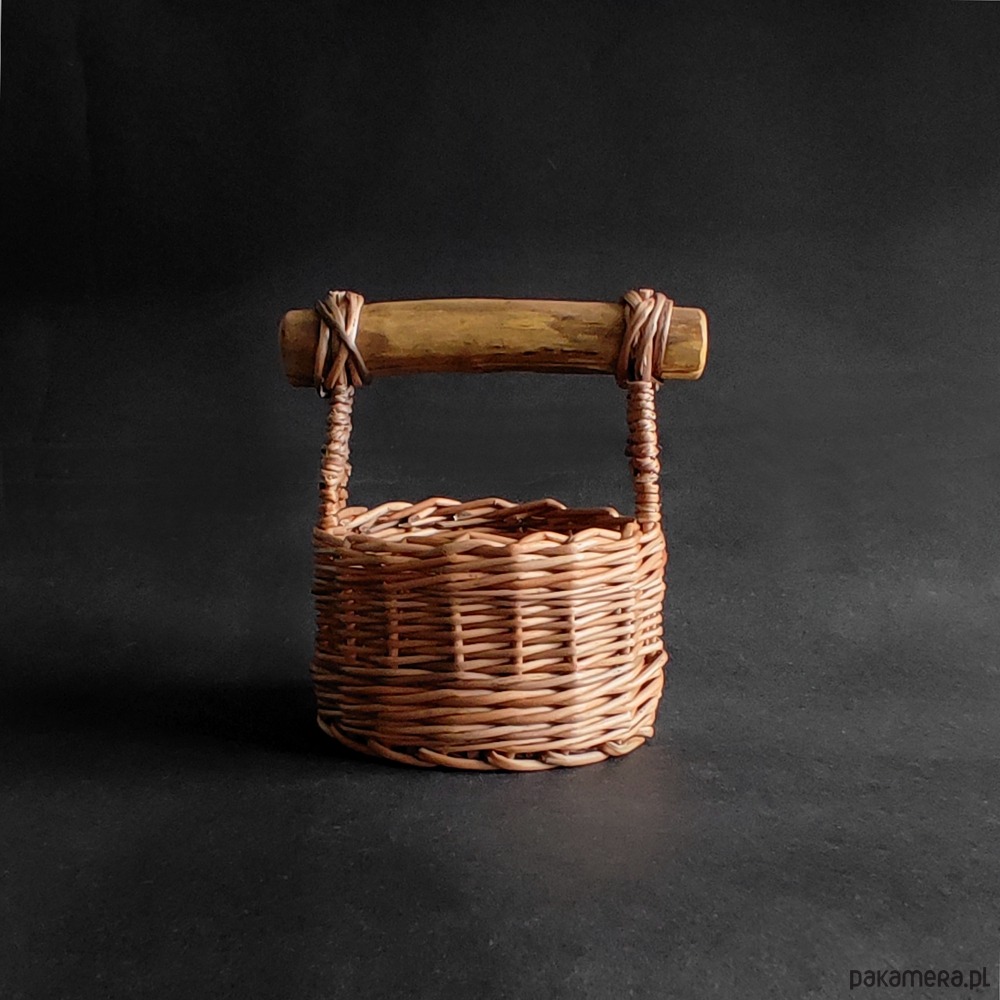 Mały wiklinowy przybonik na dowolne akcesoria, kosmetyki czy narzędzia. Wypleciony na okrągłym dnie, z drewnianym uchwytem i przegródką w środku.