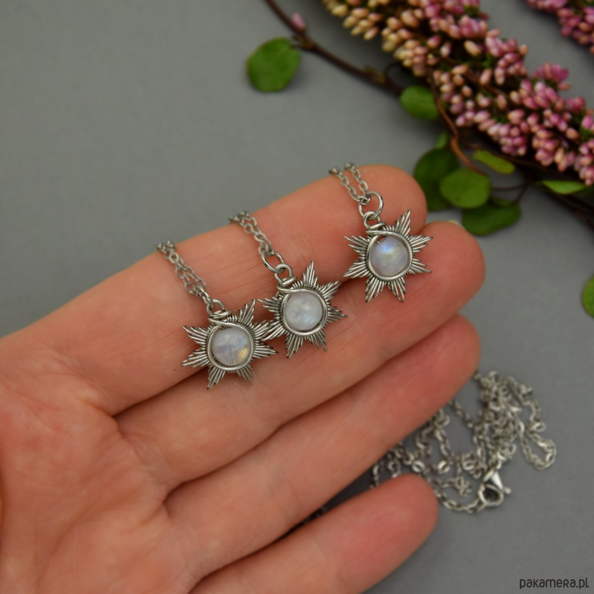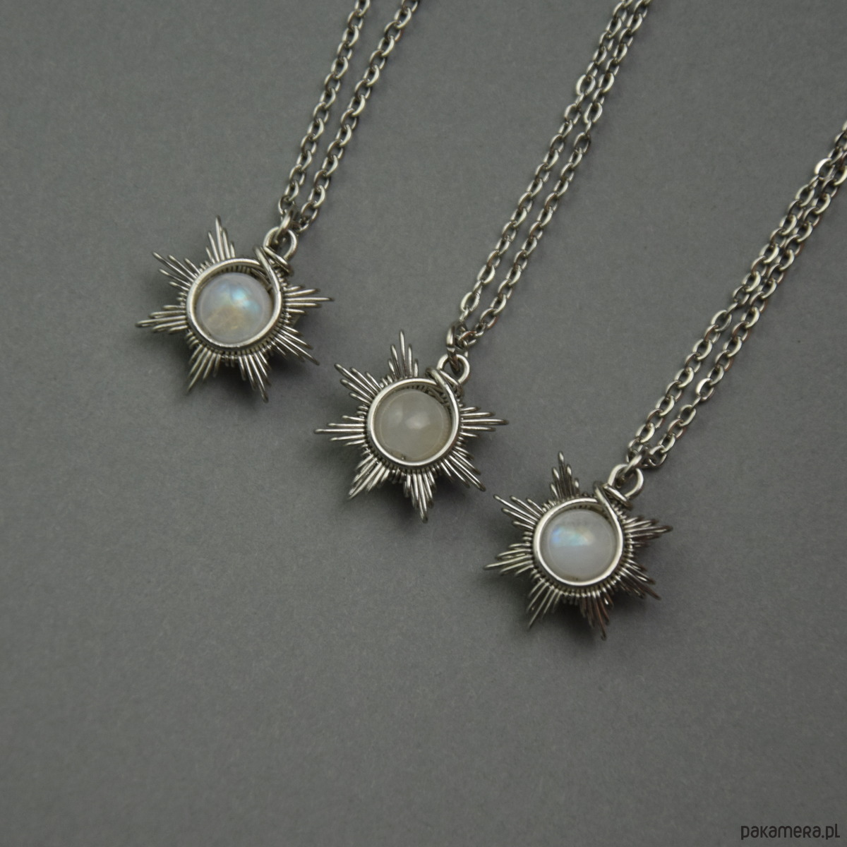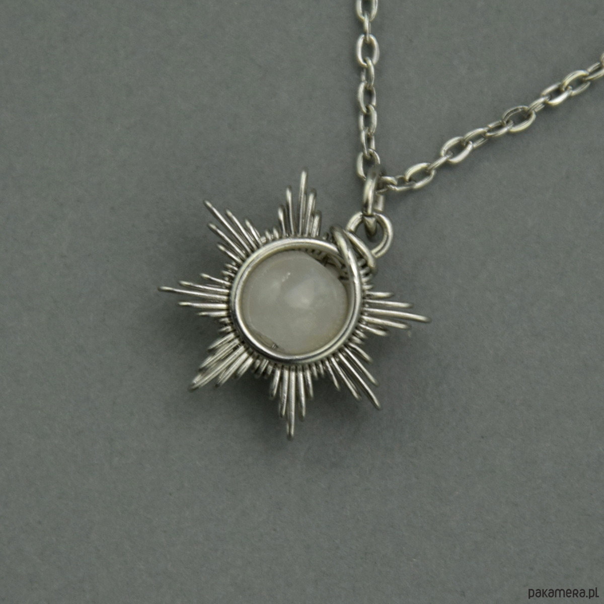 Mały wisiorek w kształcie słońca z kulką kamienia księżycowego. Wykonany ręcznie techniką wire wrapping z drutów ze stali chirurgicznej. Jego długość całkowita (z kółeczkiem) to około 2cm. Słońce ma średnicę około 1,8cm. Zawieszony został na krótkim łańcuszku o długości 42cm, ale mogę dowolnie zmienić jego długość. Na zdjęciach przedstawione są przykładowe wisiorki. Wisiorek wysyłam losowo.