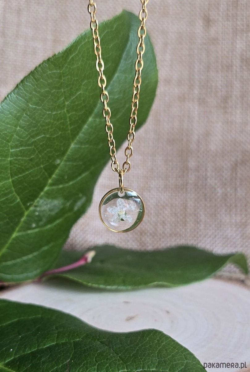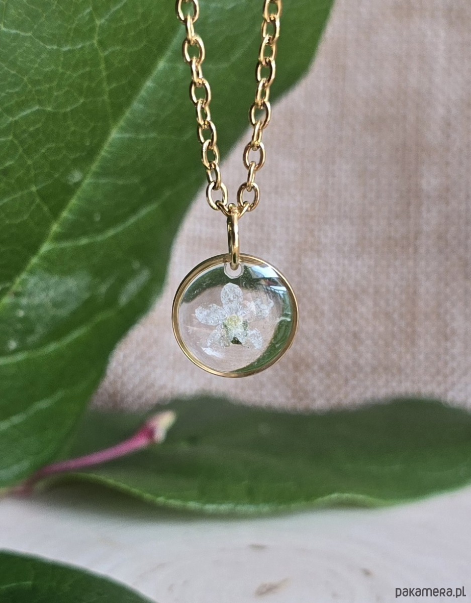 Oferuję Państwu unikalną biżuterię. Zawieszka jest wykonana z suszonych kwiatów i żywicy epoksydowej. Biżuteria jest wspaniałym i oryginalnym prezentem na lata.