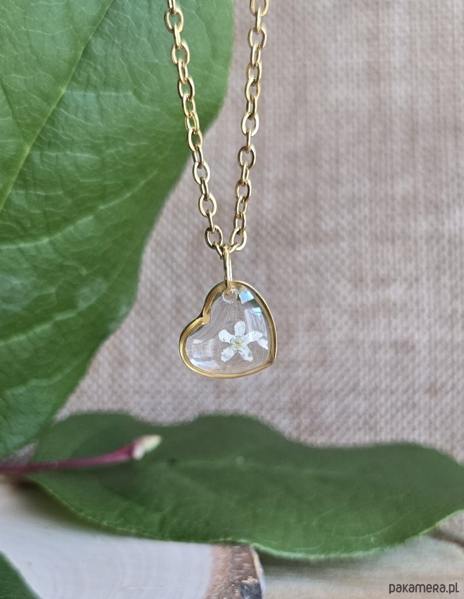 Mały wisiorek z białą niezapominajką prawdziwy kwiat serce