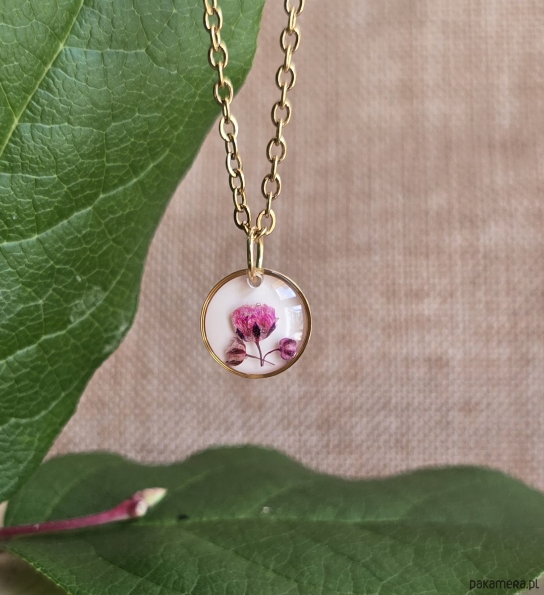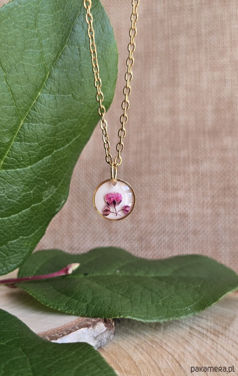 Oferuję Państwu unikalną biżuterię. Zawieszka jest wykonana z suszonych kwiatów i żywicy epoksydowej. Biżuteria jest wspaniałym i oryginalnym prezentem na lata.