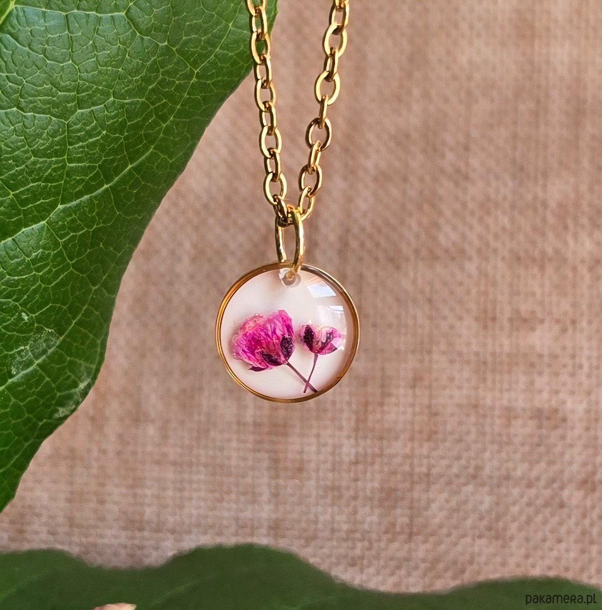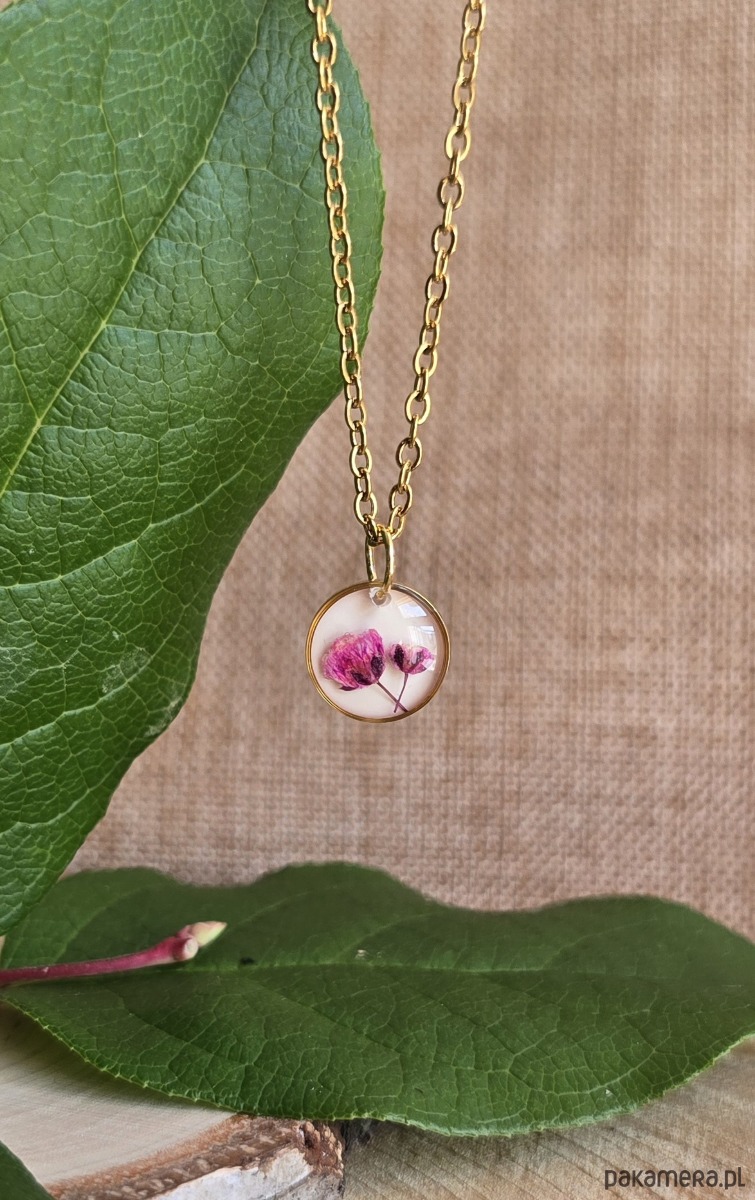 Oferuję Państwu unikalną biżuterię. Zawieszka jest wykonana z suszonych kwiatów i żywicy epoksydowej. Biżuteria jest wspaniałym i oryginalnym prezentem na lata.
