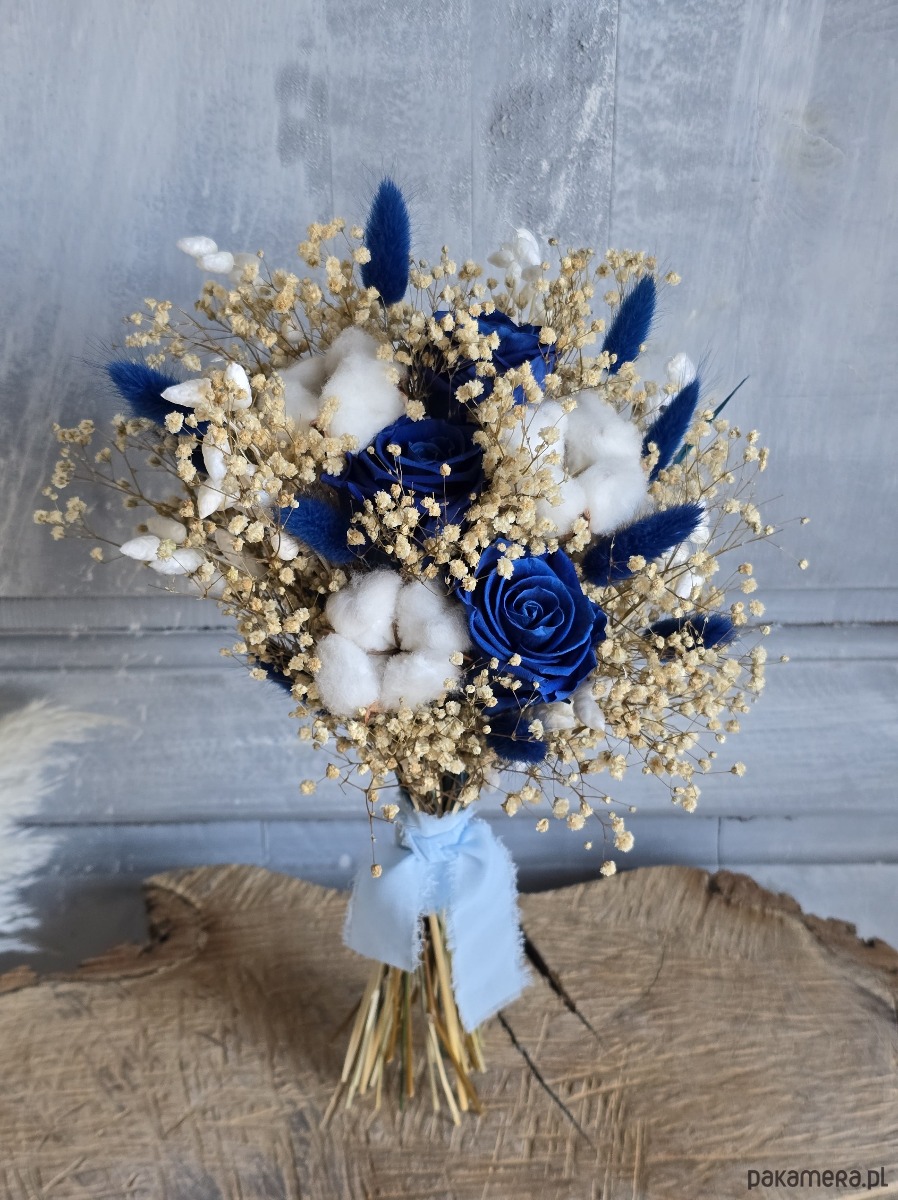 Wykonany ze stabilizowanych granatowych róż, kwiatów bawełny, stabilizowanej gipsówki z dodatkiem dmuszka jajowatego i drżączki – subtelny, trwały i wyjątkowy. Doskonały dla panien młodych, które szukają oryginalnego bukietu na zimową ceremonię.