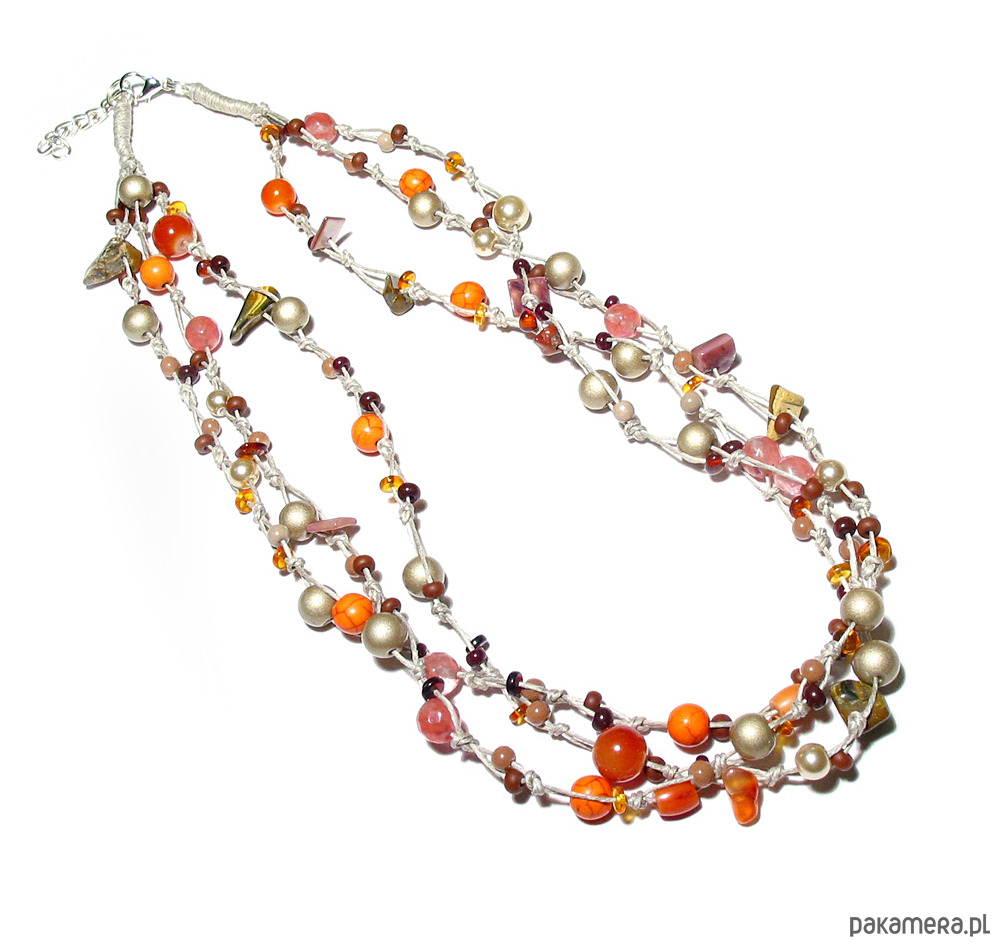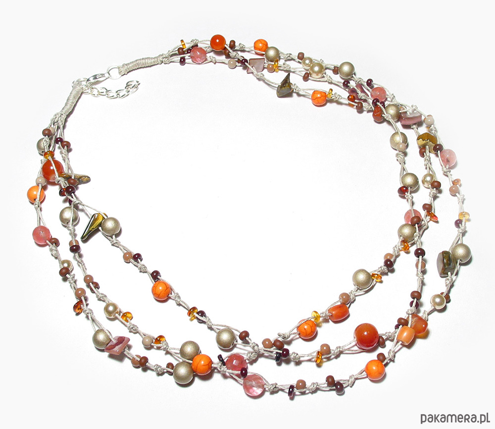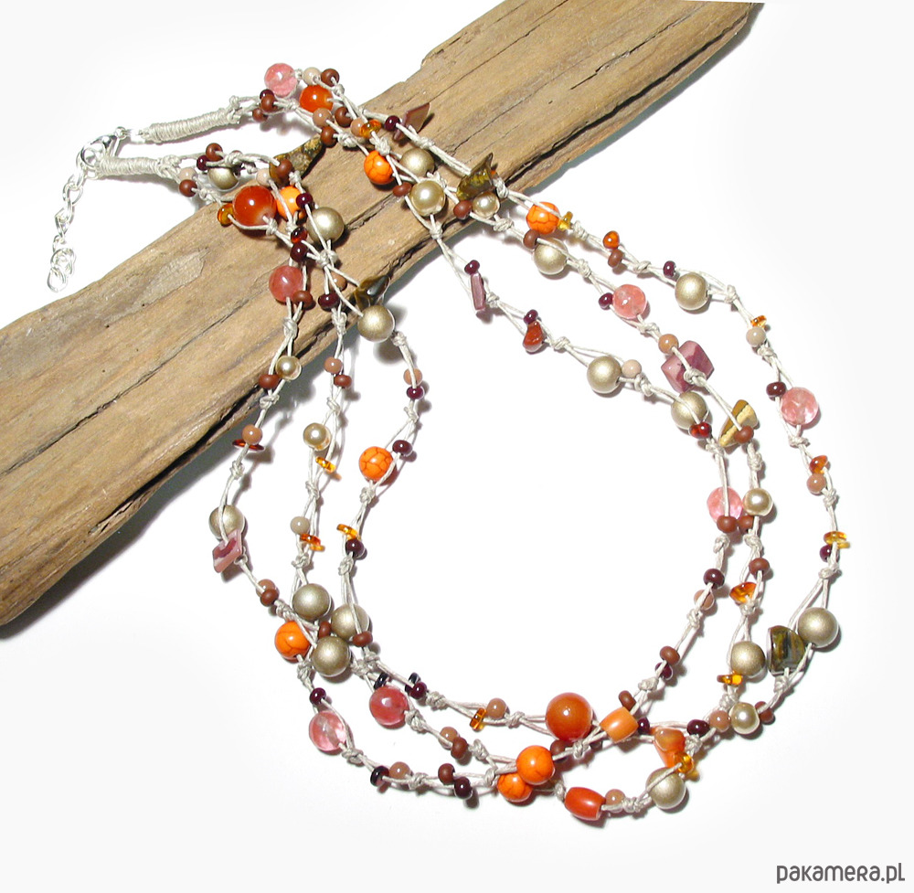 Piękny, lekki naszyjnik wykonany na polskiej przędzy lnianej z elementów w odcieniach brązów, oranżu, złota i pudrowego różu.