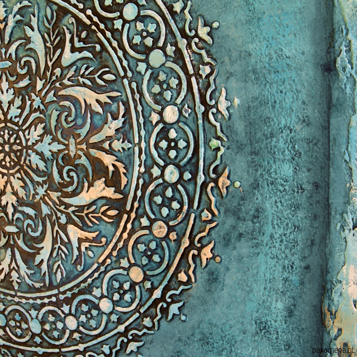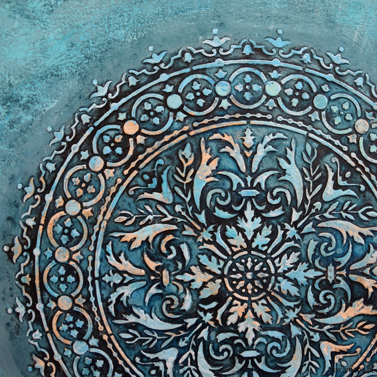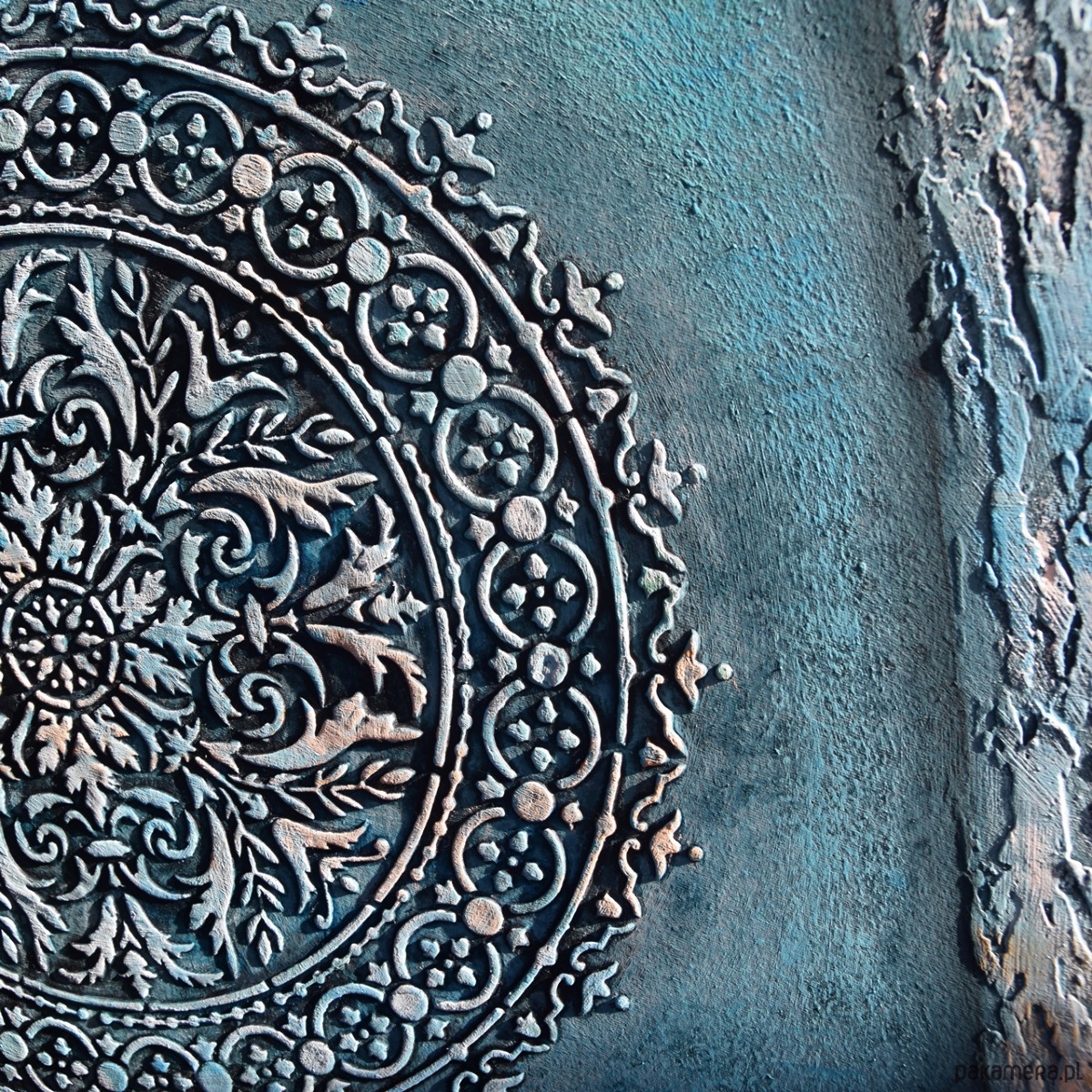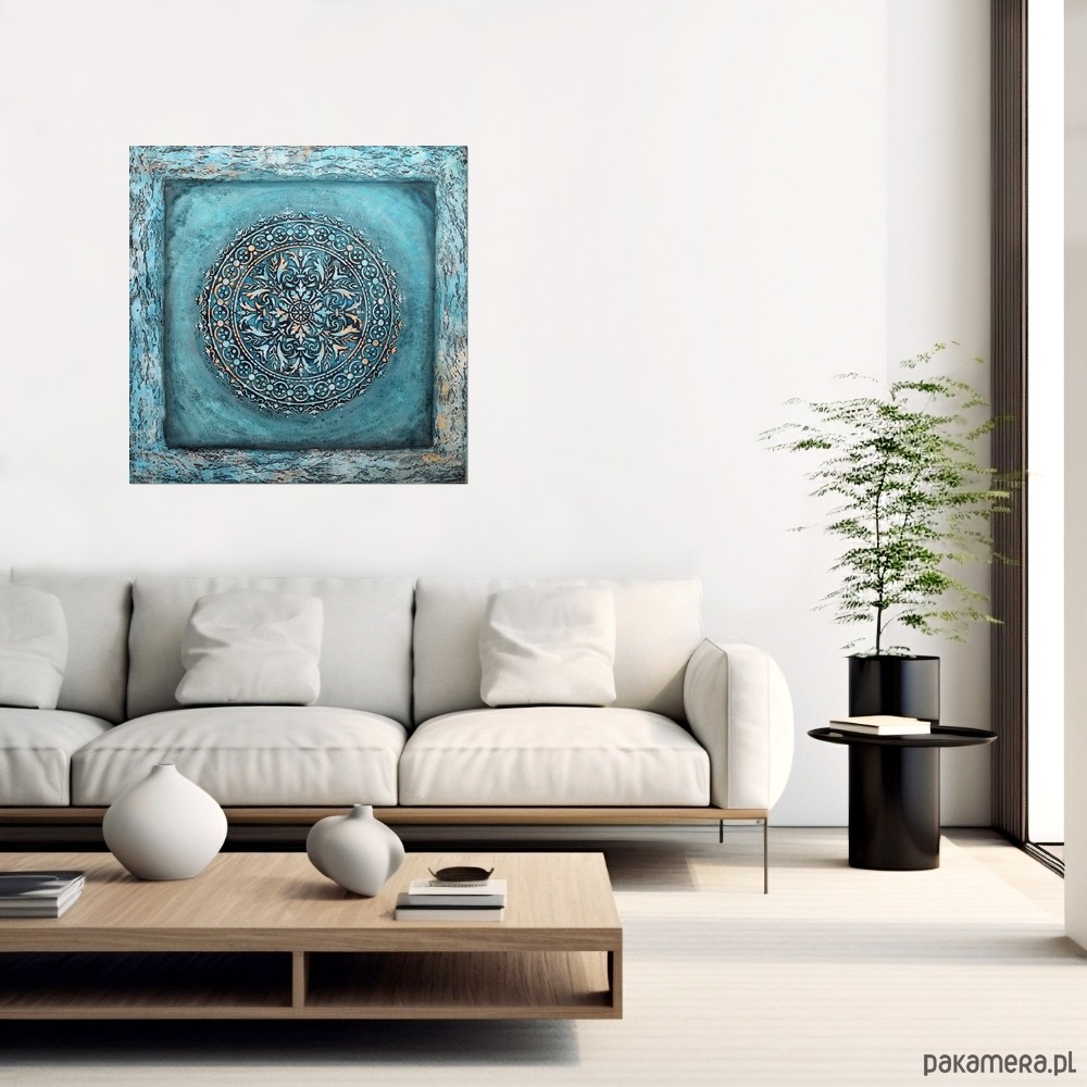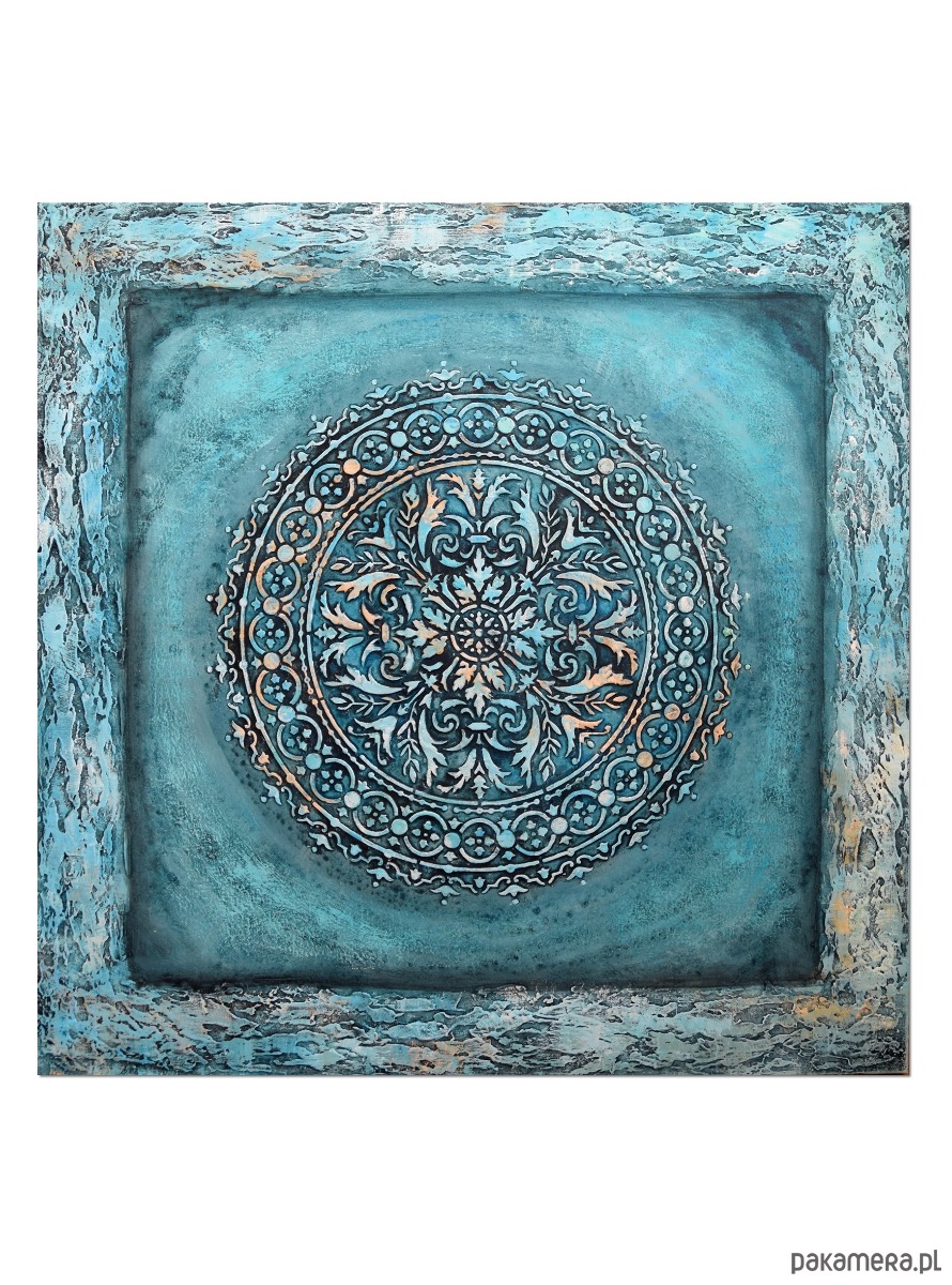 Oryginalny obraz malowany ręcznie w technice akrylowej, z grubą, wypukłą strukturą wzoru, na płótnie naciągniętym na ramę o grubości ok. 2 cm. Format: 80/80 cm. Obraz jest sygnowany, pokryty werniksem dla ochrony przed wilgocią. Boki zamalowane w tonacji całości więc nie wymaga oprawy.